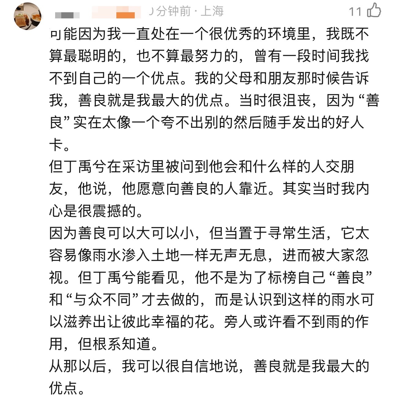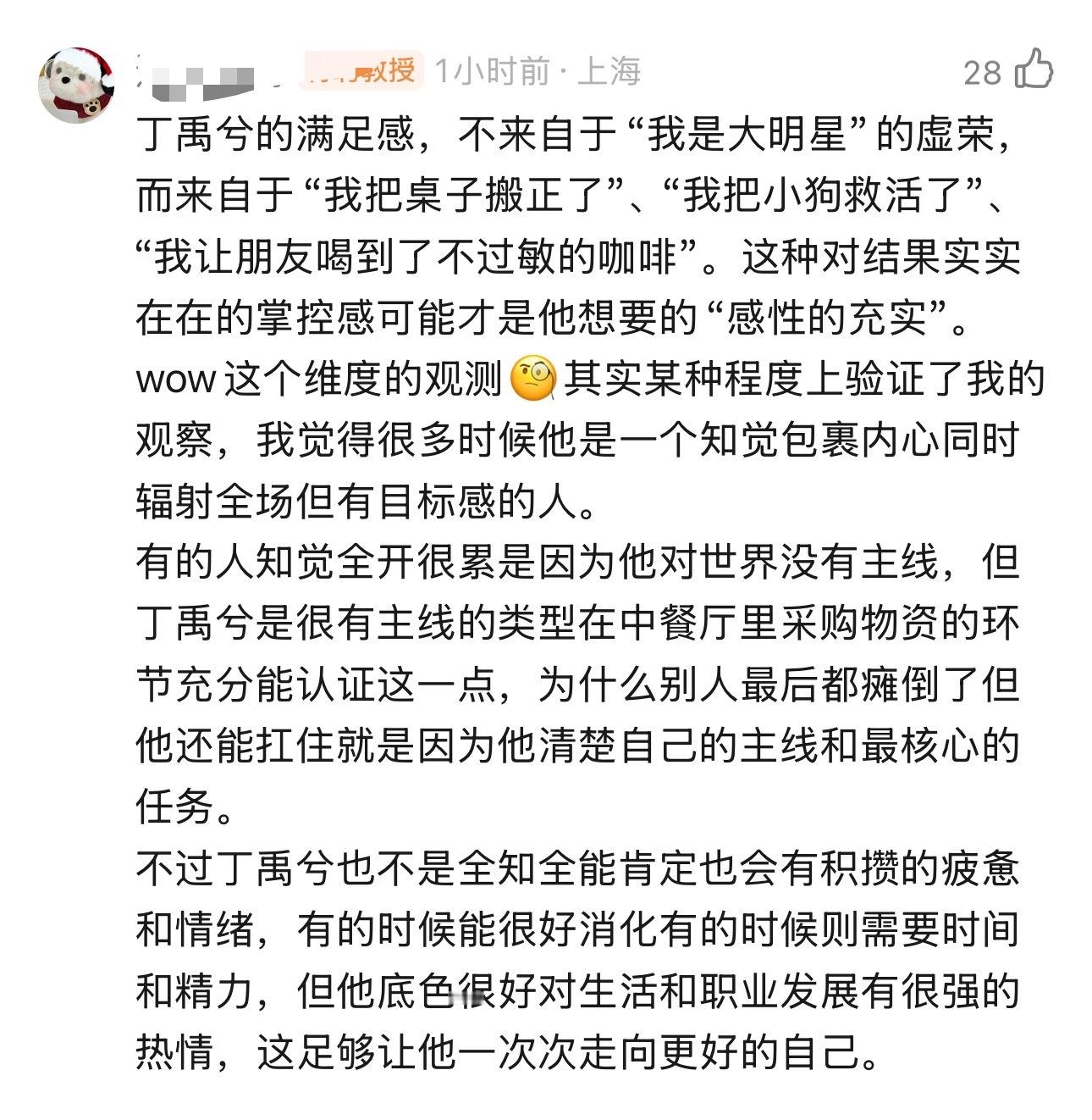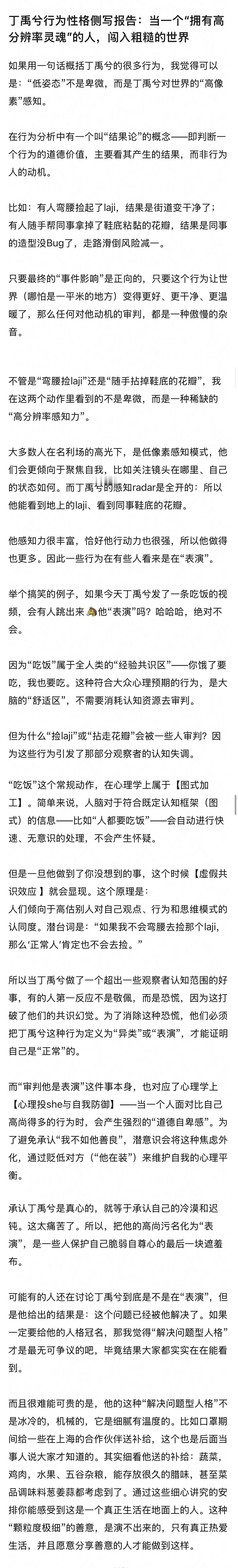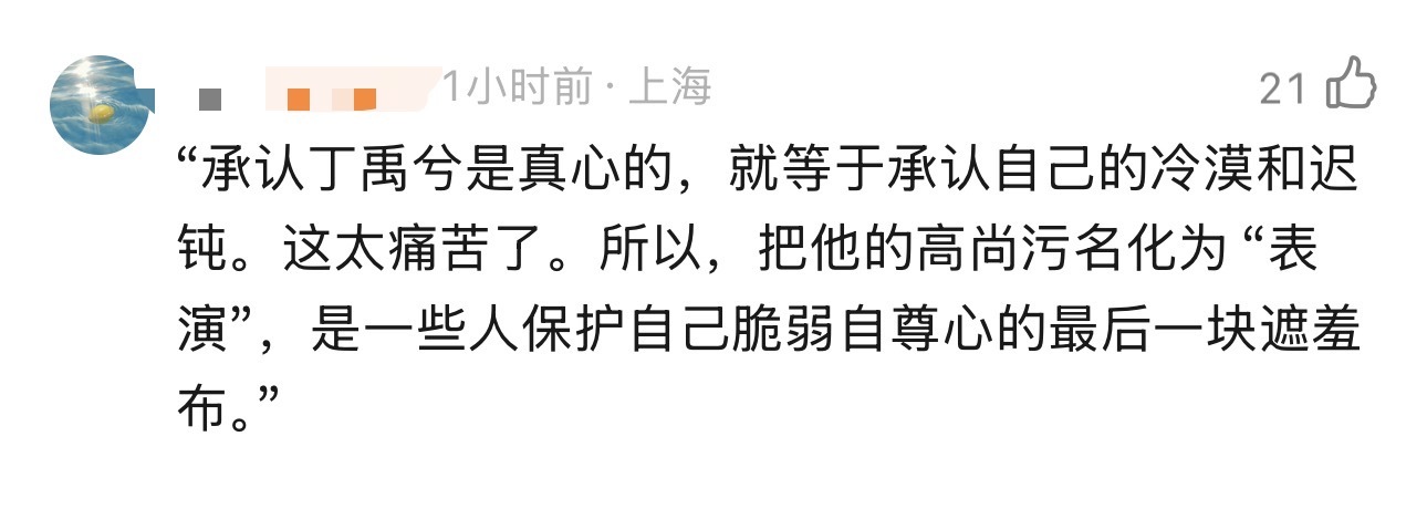 "承认丁禹兮是真心的,就等于承认自己的冷漠和迟钝。这太痛苦了。所以,把他的高尚污名化为"表演",是一些人保护自己脆弱自尊心的最后一块遮羞布。"和老丁相关的帖子,总是会出现这种高质量的深度解析贴…一年了,们dber还沉浸在解析老丁的世界里,窝猴还是太让人有探索欲了
