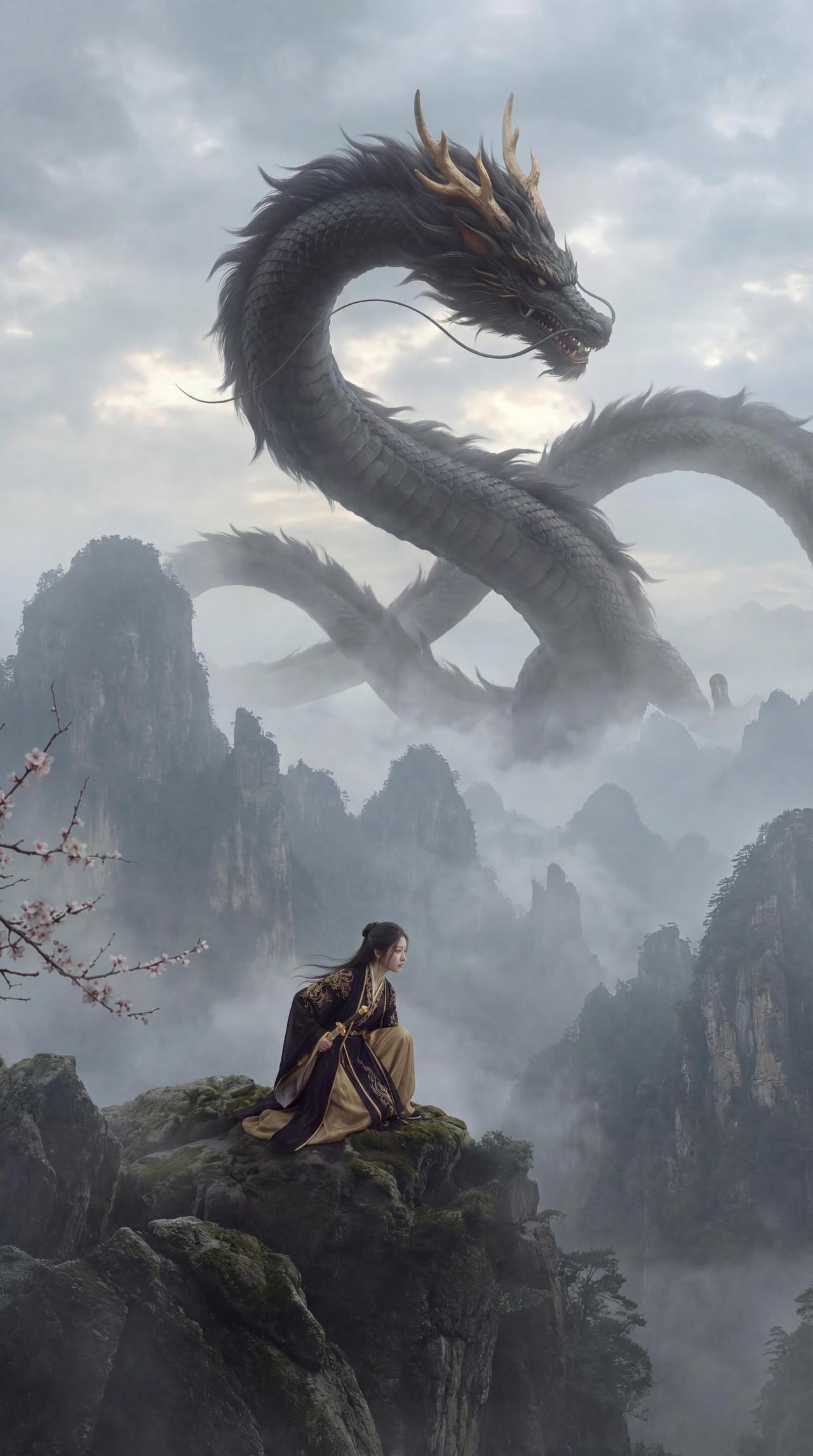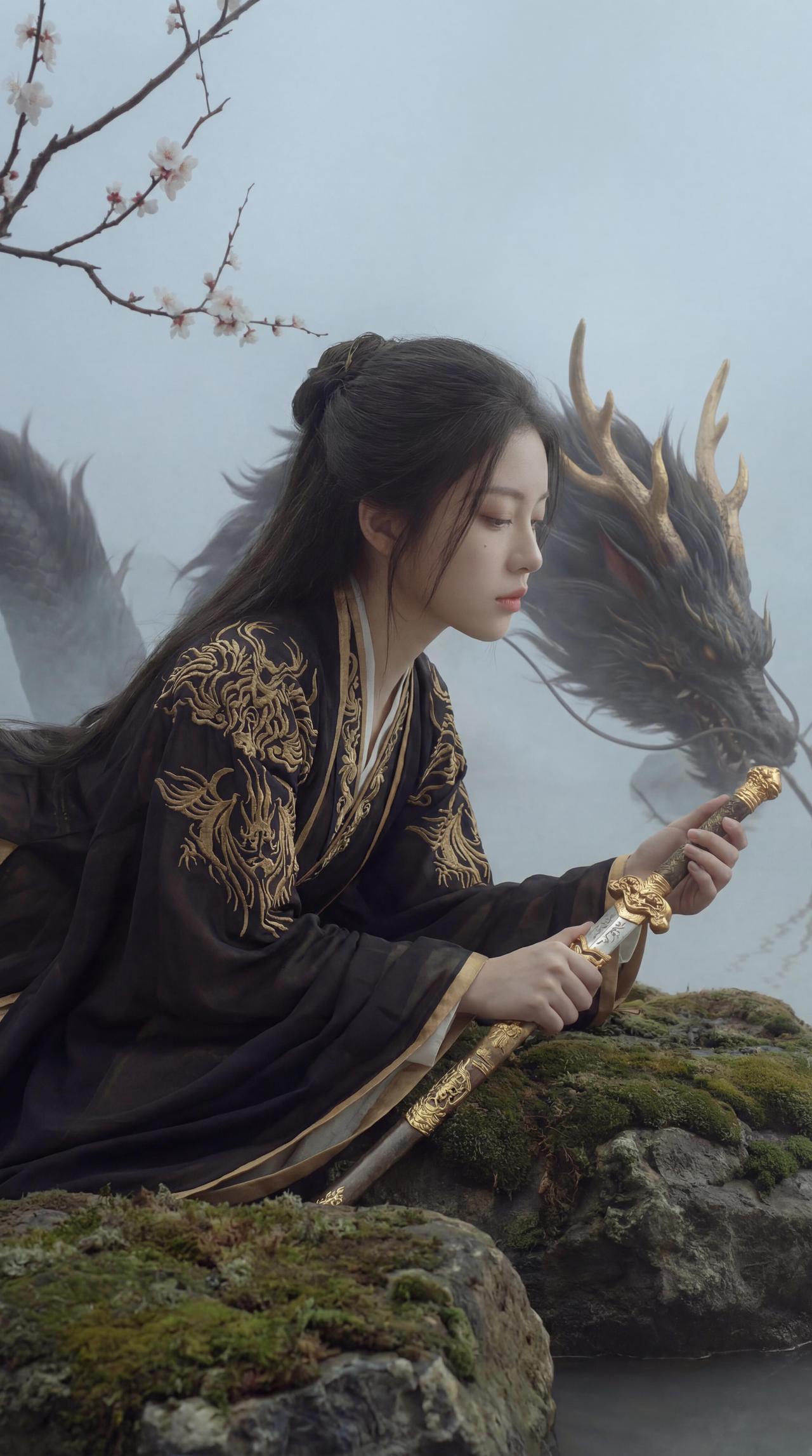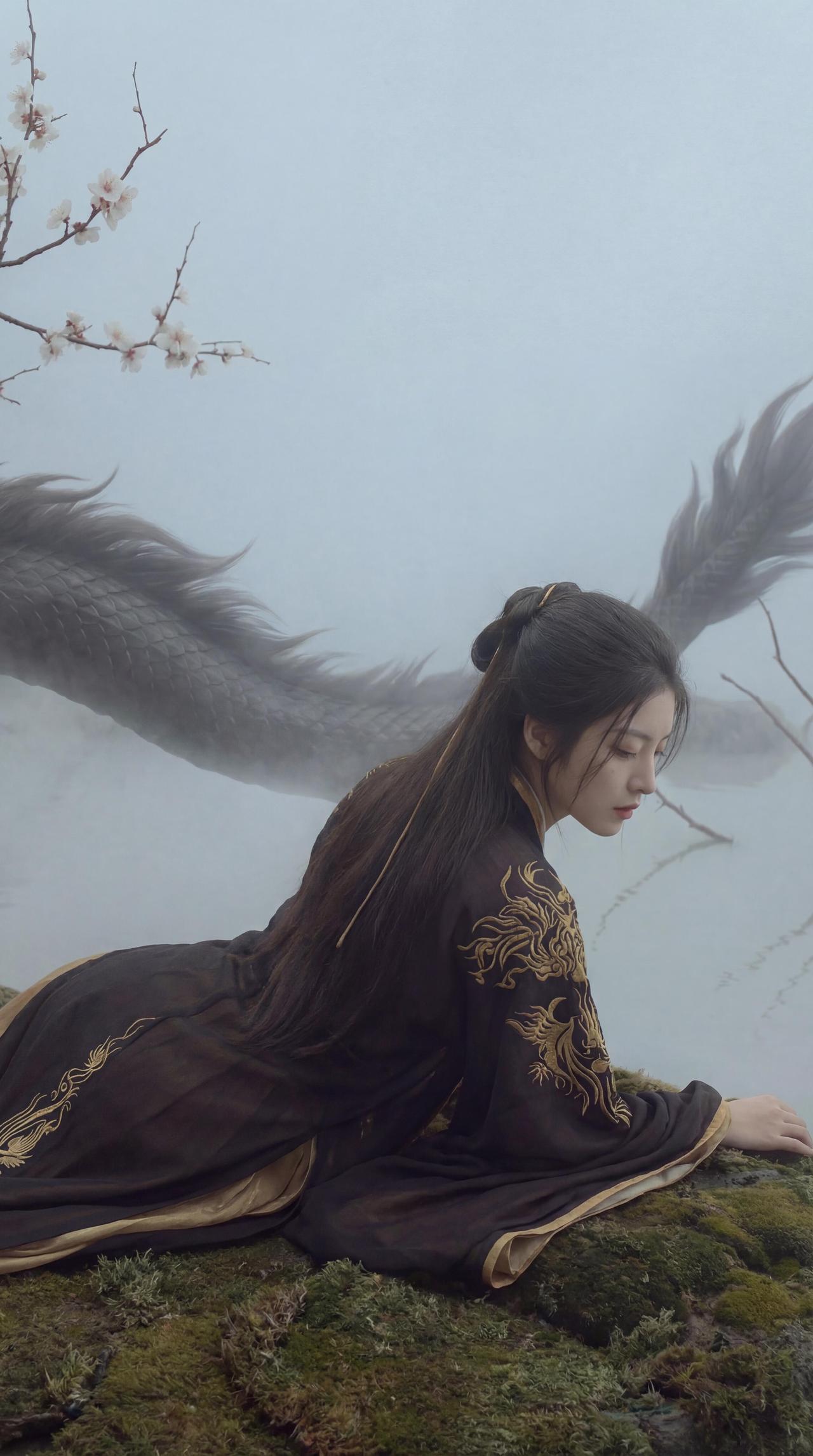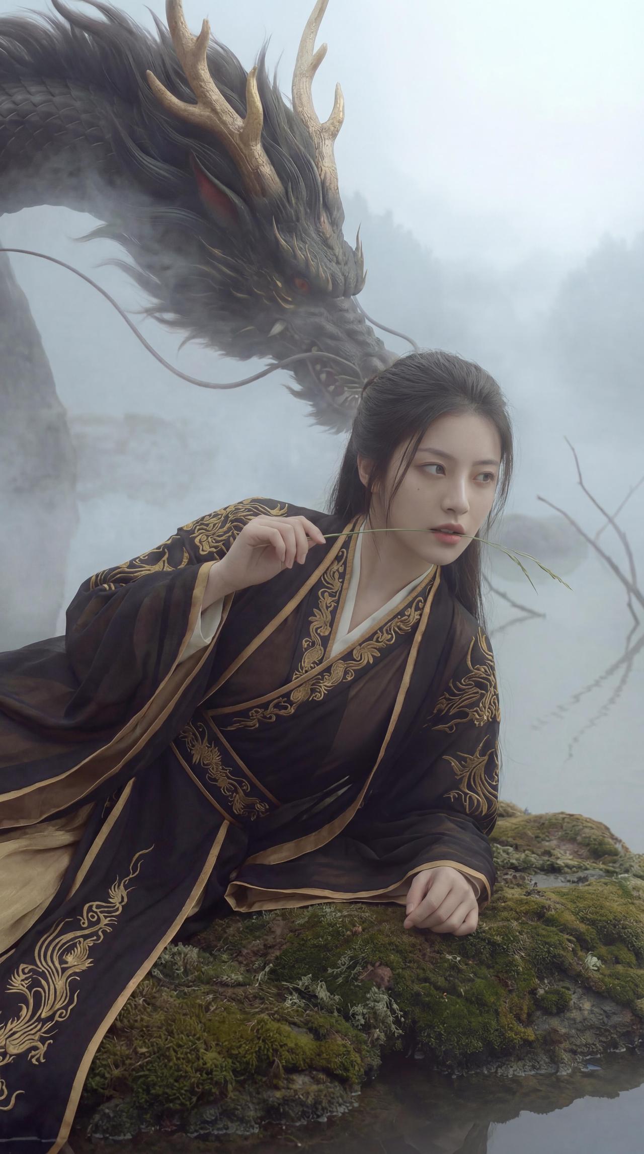 场景选择上,布满青苔的岩石、朦胧的雾气与淡粉的花枝,构建出东方玄幻的典型场景,冷调的雾气背景压低了画面的明度,突出黑金主体的视觉冲击力,同时青苔的绿色与花枝的粉色作为点缀色,丰富了画面层次却不破坏整体的清冷玄幻氛围。人物的姿态设计贴合主题,跪坐、伫立、倚石等动作,与龙形的环绕、俯冲形成互动感,让画面产生叙事性,观者能从肢体语言中感受到人物与龙之间的羁绊。晒图笔记大赛 光影处理上,自然的散射光让人物面部与服饰的细节清晰呈现,而AI生成的龙形则通过明暗渐变塑造出立体的鳞片质感,光影的统一让虚拟与现实元素的融合更自然。美中不足的是,部分画面中龙形的边缘虚化程度稍显不足,与背景的雾气衔接不够流畅,若对龙形边缘做更细腻的柔化处理,画面的整体氛围感会进一步提升。
