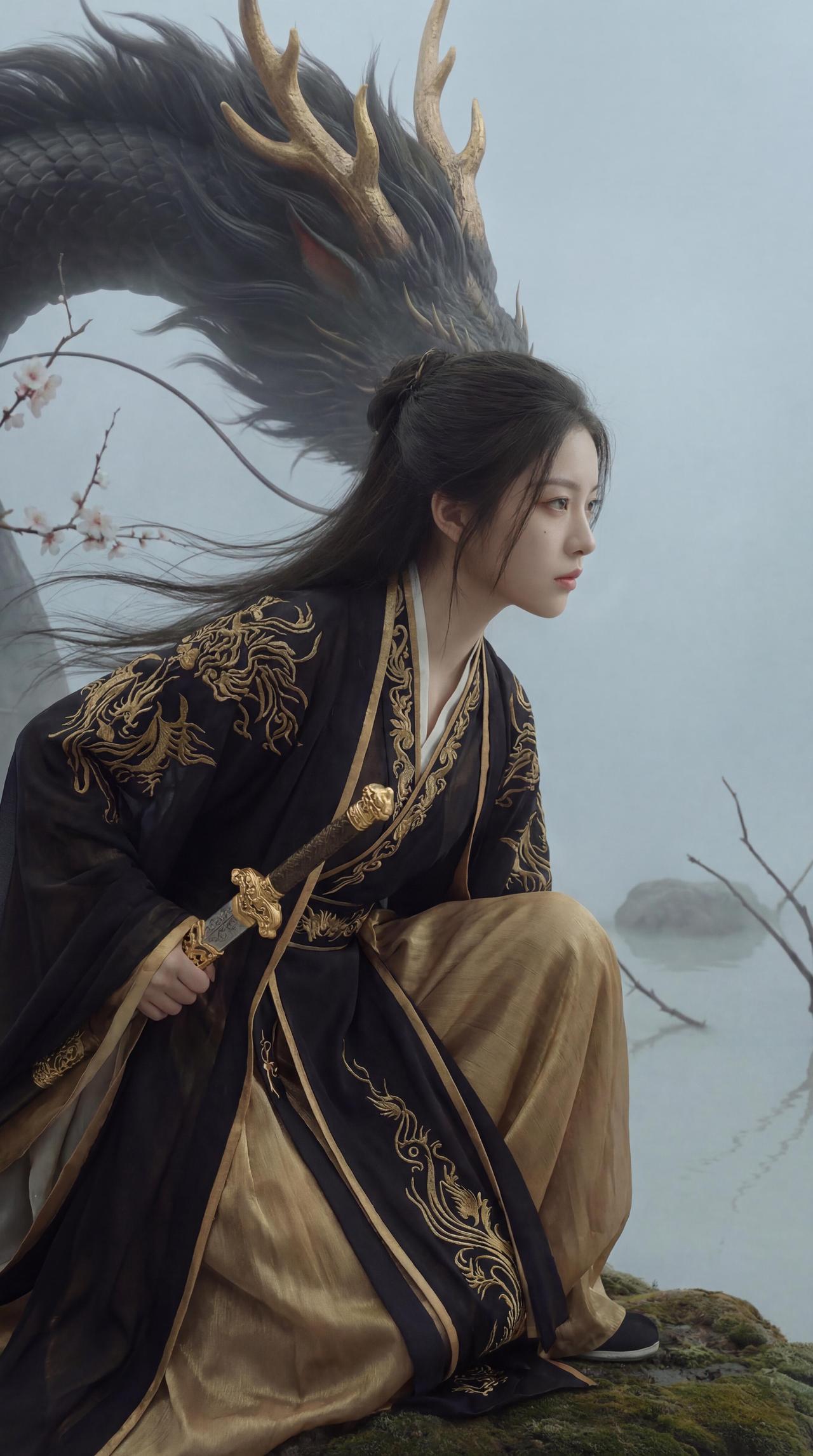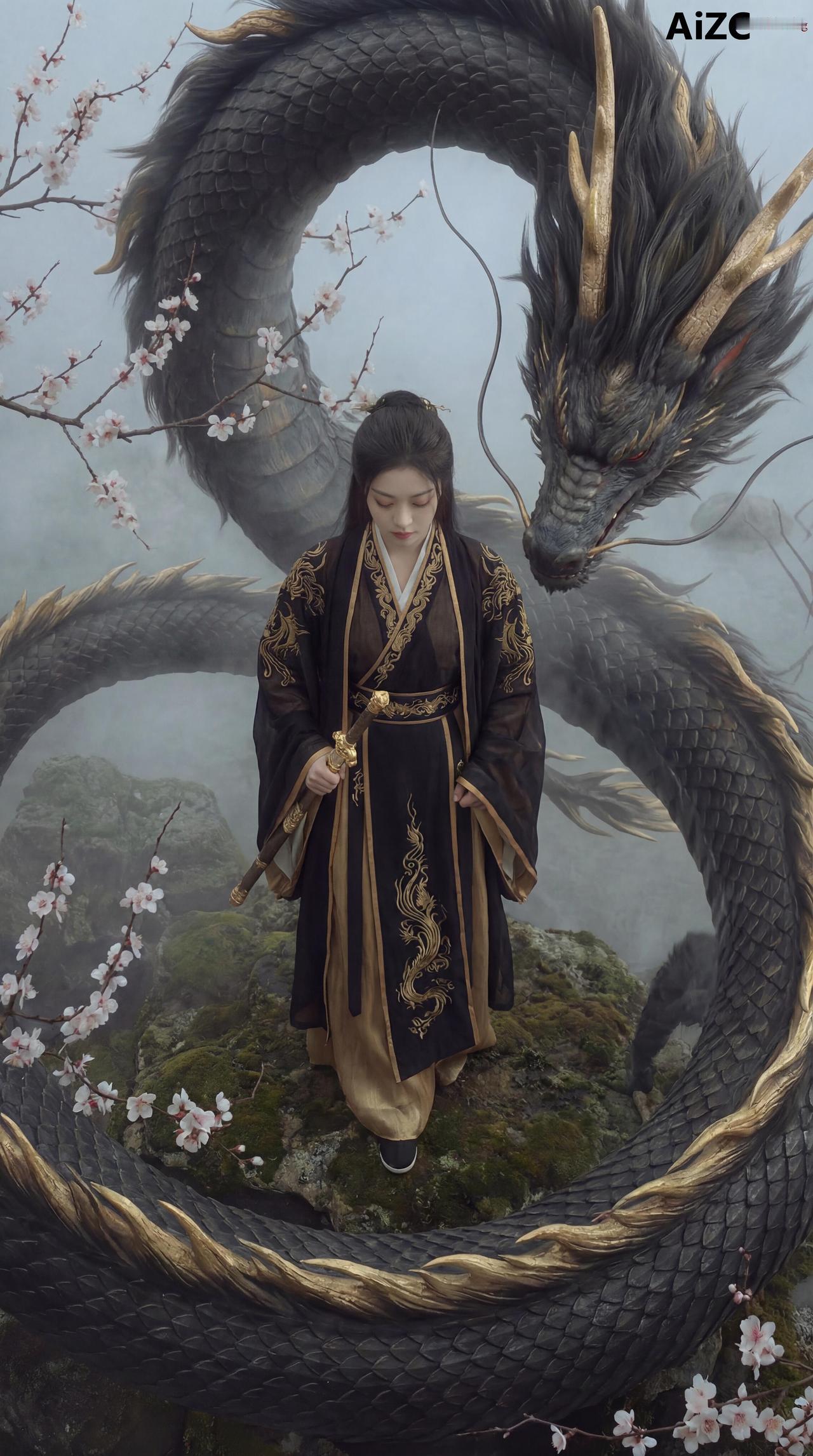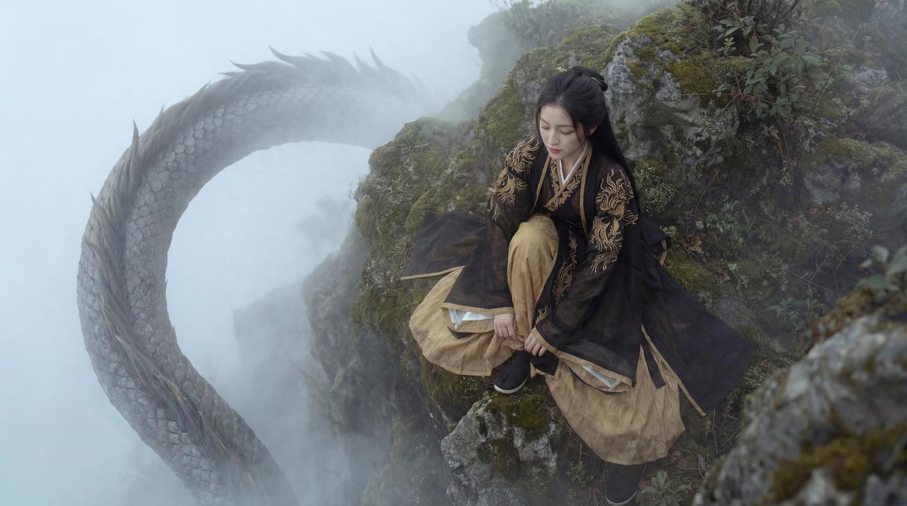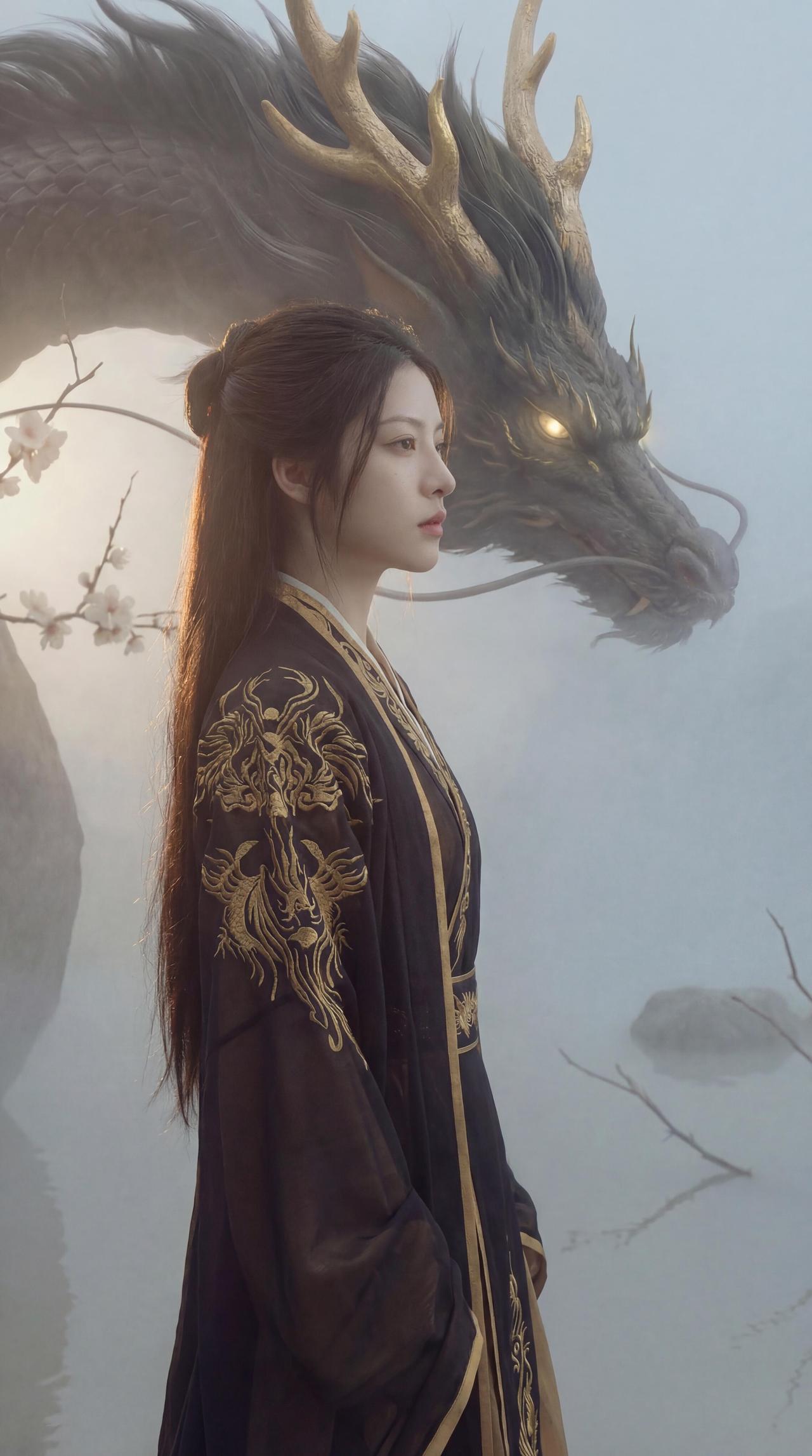 场景选择上,布满青苔的岩石、朦胧的雾气与淡粉的花枝,构建出东方玄幻的典型场景,冷调的雾气背景压低了画面的明度,突出黑金主体的视觉冲击力,同时青苔的绿色与花枝的粉色作为点缀色,丰富了画面层次却不破坏整体的清冷玄幻氛围。人物的姿态设计贴合主题,跪坐、伫立、倚石等动作,与龙形的环绕、俯冲形成互动感,让画面产生叙事性,观者能从肢体语言中感受到人物与龙之间的羁绊。晒图笔记大赛 光影处理上,自然的散射光让人物面部与服饰的细节清晰呈现,而AI生成的龙形则通过明暗渐变塑造出立体的鳞片质感,光影的统一让虚拟与现实元素的融合更自然。美中不足的是,部分画面中龙形的边缘虚化程度稍显不足,与背景的雾气衔接不够流畅,若对龙形边缘做更细腻的柔化处理,画面的整体氛围感会进一步提升。
