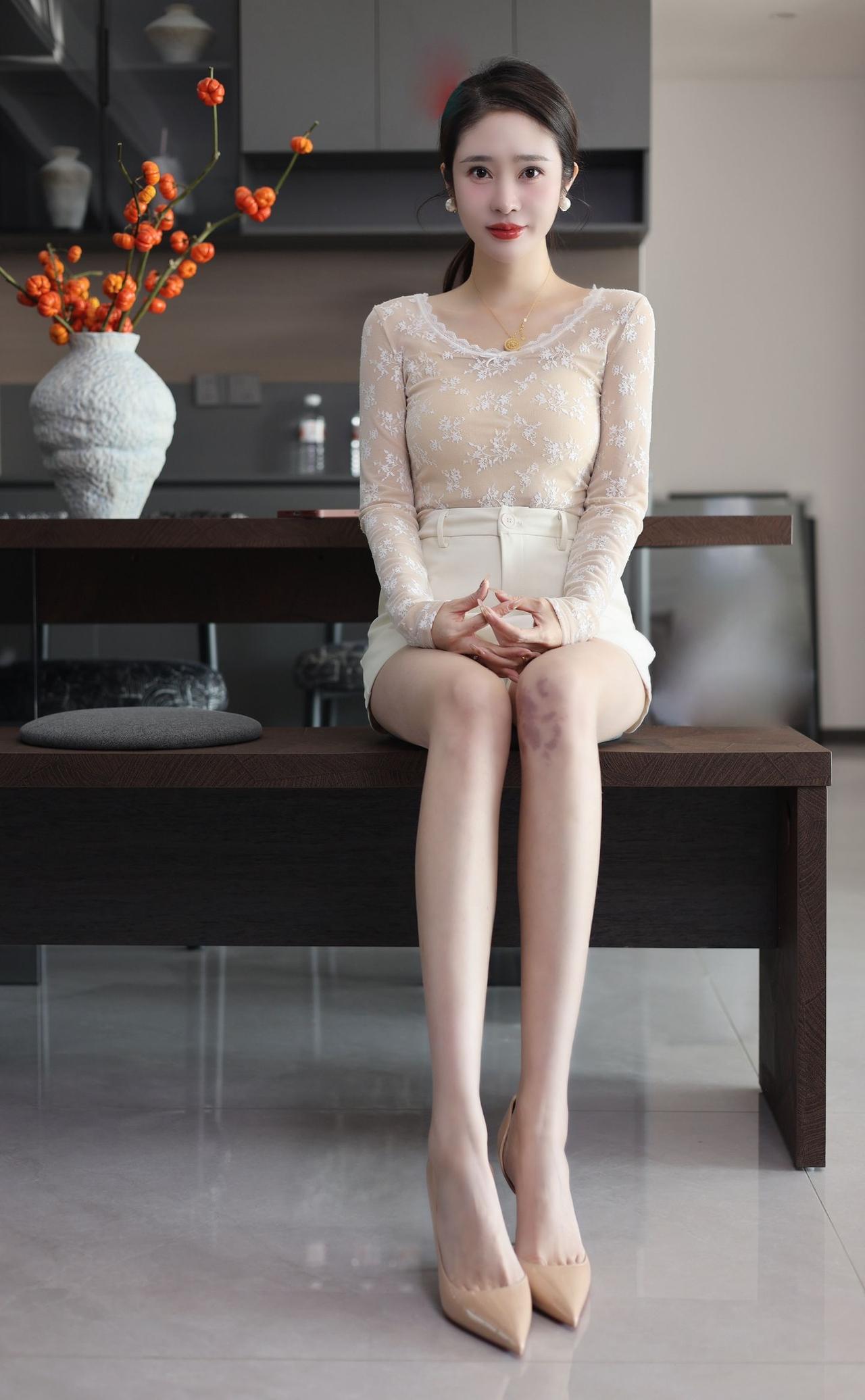 优雅坐于现代厨房,精致穿搭尽显时尚气息。