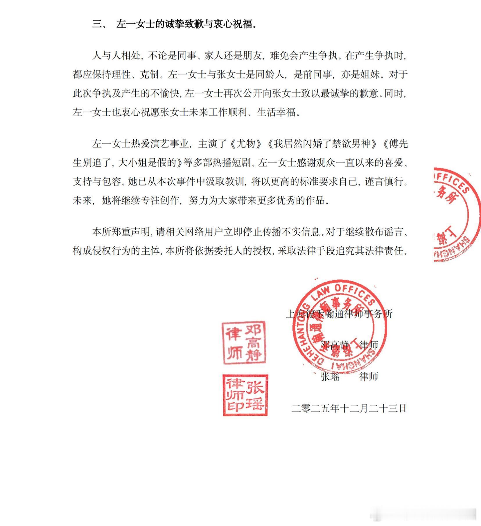 左一发律师声明了(短国那个女演员