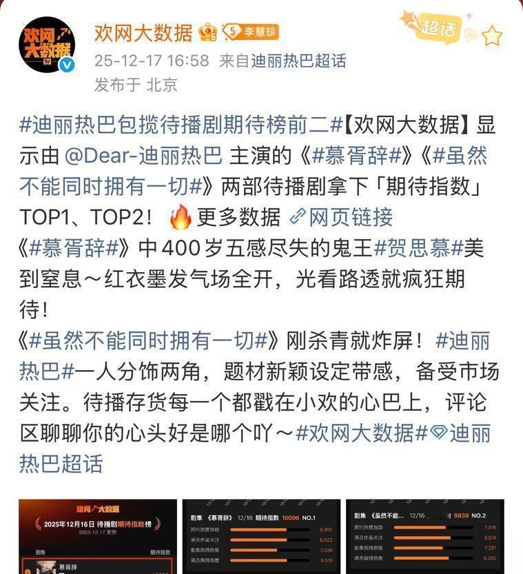 别骂流量了,这次真不一样。 迪丽热巴用一套拳法,打穿了国产剧两个天花板。 《枭起青壤》两周卷走6亿播放,豆瓣8.6分钉在那里。 它告诉你,流量主演的剧,悬疑线可以像齿轮一样精密;女性题材的打戏,骨头撞地的声音能让你头皮发麻。 全网被它轰炸了。 微博20亿阅读,抖音15亿次播放,热搜成了它的连续剧。 平台这次很聪明,一口气放出全集,让你熬夜刷完不用等。 更狠的是,她另外两部剧,已经锁定了期待榜前两位。 这不是播一部剧,这是布一个局:现在喂饱你,未来吊着你。 你看,观众从来不是讨厌明星,而是讨厌敷衍。 当拳风擦过镜头,当每一个伏笔都稳稳落地,你买的不是流量明星的账,你是在为一场专业的冒险付费。 她的待播列表越拉越长,你的期待值就越堆越高。 你追的不是剧,是一个演员进化的决心。