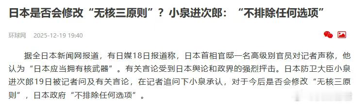警惕!日本公然放话要拥核,我们必须亮出这一撒手锏!最近日本又蠢蠢欲动了。有个负责安保政策的高官直接放话,说日本应该拥有核武器。这根本不是随口说说,就是在测试国际社会的反应。之后防卫大臣小泉进次郎讨论“无核三原则”时,还说“不排除任何选项”,意思已经很明显了,他们就是在为拥核铺路。现在日本政界右倾得越来越厉害,要是国际社会不强硬抵制,尤其是美国不明确反对,这股拥核的劲头估计刹不住。有人可能觉得美国不会同意,但别忘了,美国现在一门心思搞大国博弈,想把日本当反华马前卒。再加上美国内部意见不统一,现在反对日本拥核的决心其实没那么强。所以我们不能抱有侥幸,必须做好日本真的搞出核武器的最坏打算。一旦日本敢放弃“无核三原则”,把造核弹当成国家目标,我们就该考虑给“不首先使用核武器”的原则加个例外条款了。简单说就是:那些有核、历史上侵略过中国,现在还对中国采取敌对路线的国家,不适用这个原则。谁都知道,日本有搞突然袭击的黑历史。当年珍珠港偷袭、侵华战争的各种突袭,都是前车之鉴。现在极右翼又冒出拥核的苗头,我们要是不提前防备,可能吃大亏。而且明眼人都能看出来,日本今天琢磨拥核,首要针对的就是中国。更关键的是,日本不是没能力造核弹。公开数据显示,日本现在拥有的钚元素足够造上千枚核弹头,而且他们的核技术、运载工具技术都很成熟,只要下定决心,短时间内就能造出实战化的核武器。我们必须让日本人提前想清楚后果:一旦他们真的拥有了核武器,只要我们确认他们准备对中国实施核攻击,事态到了迫在眉睫的地步,我们就有权对它实施先发制人的核打击。中国的“不首先使用核武器”,是对和平的承诺,但这份承诺不能变成别人威胁我们的筹码。日本要是敢突破核底线,我们就必须用更强硬的手段护佑国家安全,这没什么好含糊的。底线划清楚,是为了止战。只有让某些人知道玩火必自焚,他们才会冷静下来。