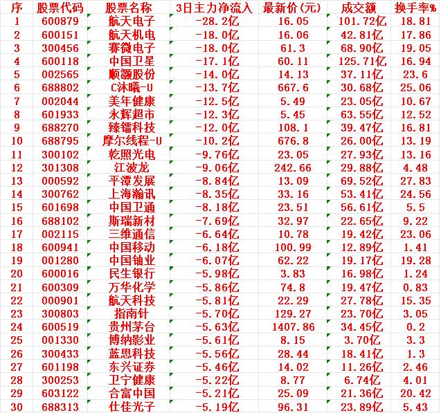 当心!12月24日,前3天主力大幅卖出的30名单 航天电子:3日主力净流出2