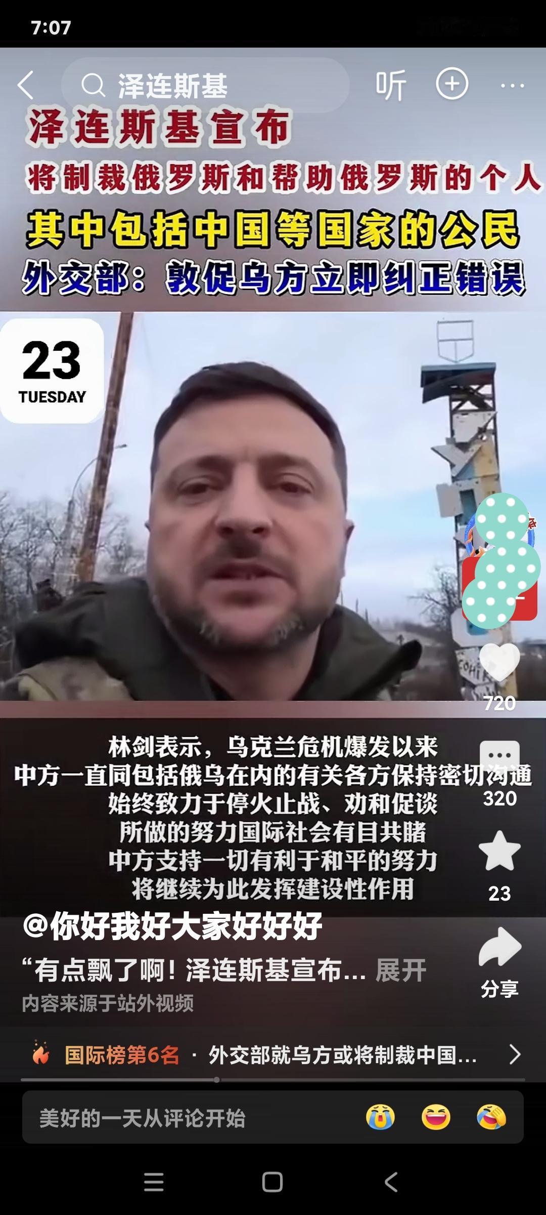 突发!乌克兰总统泽连斯基昨天表示将对支持俄罗斯的国家和个人进行制裁。被制裁的个人包括中国公民!该言论一出,引起我国网民的广泛关注,有网友表示其不自量力,形式大于内容,也有网友表示表示应该充分理解交战国中的当时国的意愿,俄乌战争如果支持俄罗斯那么有违中立原则,乌克兰的制裁应该可以理解并且得到尊重。不知道你怎么看这件事?