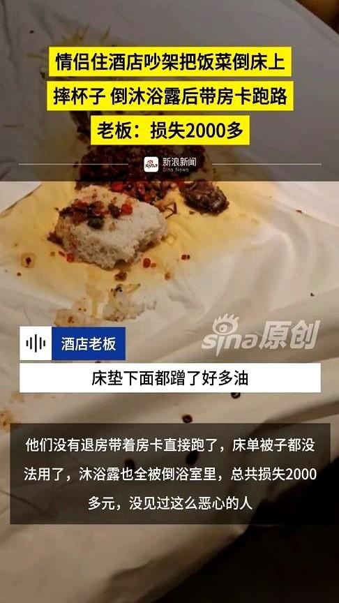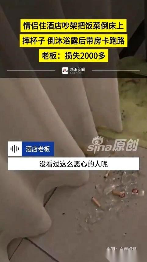 真的,就那一瞬间,我隔着屏幕都感觉血往上涌。 把吃剩的外卖,连油带汤,整个儿扣在酒店雪白的被子上。杯子全砸了,沐浴露挤了一地,就为了让你下一个进来的人滑一跤。 这是吵架吗? 我怎么看都觉得,这是人性炸裂现场。 情侣俩,在房间里吵崩了。行,谁没个情绪上头的时候。 结果男的摔门就走,女的也跟着跑了。谁也没结账,房卡也带走了,留下一屋子稀巴烂。 最绝的是老板报警后,联系上那男的。 他怎么说? 他说:“我先走的,我走之后发生了什么,我不知道。” 哥们儿,你猜大家信不信? 一间房,两个人,一地鸡毛。你说你先擦干净嘴溜了,所以屎就不是你俩一起拉的? 成年人世界里最low的一种姿态,就是假装自己是无辜的。 说白了,那两千多块钱的损失,咬咬牙也就赔了。 但那张被油污浸透、再也洗不干净的床垫,就像一面镜子,照出来的,是藏在你们俩人皮囊底下,最真实、最丑陋的德行。 床垫废了可以买新的。 但那股子刻在骨子里的巨婴气和甩锅劲儿,这辈子怕是都换不掉了。