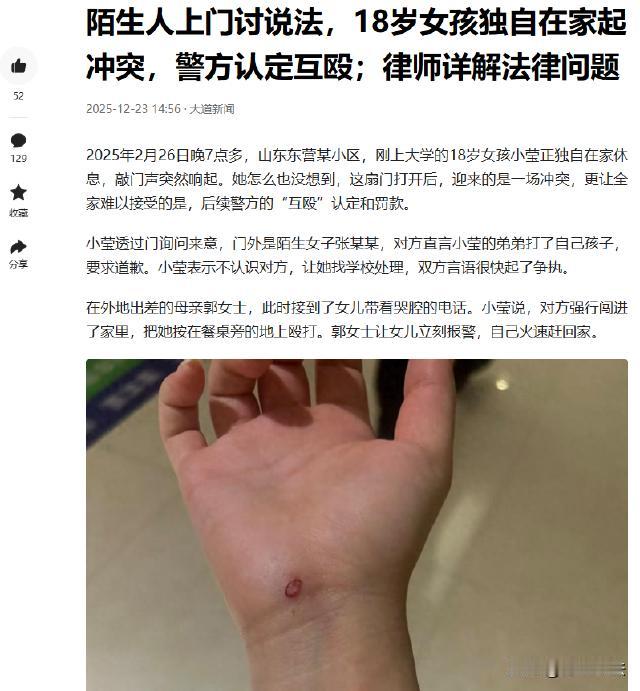 山东东营,18岁女孩独自在家,有陌生人敲门,开门后对方称女孩的弟弟打了自己的儿子,双方言语不合起了争执,对方体重大,将女孩按在地上打。女孩经鉴定为轻微伤,却被认定为互殴并罚款,原因是女孩无法证明自己没动手,女孩家人觉得即便女孩动手,也应该属于是正当防卫,质疑对方4人相互印证的证据,能否完全采信。 (本信息来源于:大道新闻、大风新闻) 2025年2月26日晚7点多,郭女士出差在外,18岁女儿小莹独自在家。 突然一阵急促的敲门声,小莹隔门询问,门外的张某某称:小莹的弟弟打了自己的儿子,要进屋讨说法。 小莹让对方找学校处理,可张某某却不管不顾强行闯入。 小莹见张某某闯入,当即与对方理论起来。 张某某身形壮硕,体重优势明显,没说几句便恼羞成怒,一把将瘦弱的小莹按在餐桌旁,扬起手就扇耳光。 小莹想挣扎,却根本无力反抗,只能任由对方肆意殴打。 就在小莹孤立无援之时,一名女子匆匆赶来劝架,张某某这才口吐芬芳的停手后离开。 小莹满脸是伤,坐在地上,等缓过神来,赶紧给母亲郭女士打电话告知了此事。 郭女士立刻赶回家中,看到女儿满脸伤痕,她顾不上其他,急忙带小莹前往救治处理,经过检查,小莹为轻微伤,郭女士要为女儿讨回公道。 随后,郭女士联系到儿子询问情况,儿子坚称当天只是和对方孩子吵了几句嘴,根本没有动手打人。 郭女士觉得这事有点蹊跷,对方无端上门闹事,还把女儿打伤了,这口气实在咽不下去。 7月,警方给出认定和处理结果。 让郭女士没想到的是,最终认定双方属于互殴,张某某罚款400元,小莹罚款200元。 给出的认定理由是:有证人李某的证言,称拉开双方后,小莹又打了张某某两巴掌。 郭女士对这个结果,难以接受。 郭女士觉得女儿独自在家,遭遇陌生人强行闯入并被殴打,即便女儿真的动手反击,那也应该是正当防卫。 而且对方有4个人,证词相互印证,这证据真的能完全采信吗? 那么,小莹的行为,到底算不算正当防卫呢? 根据刑法规定,为了使国家、公共利益、本人或者他人的人身、财产和其他权利免受正在进行的不法侵害,而采取的制止不法侵害的行为,对不法侵害人造成损害的,属于正当防卫,不负刑事责任。 张某某强行闯入小莹家中,并对小莹实施殴打行为,这明显是不法侵害。 小莹在遭受不法侵害时进行反抗,即便在拉开后有进一步反抗行为,只要这种反抗行为没有明显超过必要限度,就应当认定为正当防卫。 警方认定双方互殴,依据的是证人李某说拉开后小莹又打张某某两巴掌。 但仅这一证言,是否能充分证明小莹的行为,超出了正当防卫的范畴呢? 从现场情况看,小莹之前一直被张某某按着打,处于极度弱势和恐惧状态。 在这种情况下,她后续的反抗行为,很可能是为了摆脱不法侵害的本能反应,不一定是故意主动攻击张某某。 而且,对方多人证词相互印证,确实存在证词偏向性的可能。 在法律上,证据的采信需要综合考虑多方面因素,不能仅仅因为对方人多证词一致,就轻易采信。 应当对证人证言的真实性、可靠性进行严格审查,看是否存在矛盾或不合理之处。 遭受不法侵害时,怎样反抗才算正当防卫呢? 根据法律规定,正当防卫要求:防卫行为必须针对正在进行的不法侵害,且不能明显超过必要限度。 像小莹这种情况,在被张某某持续殴打时反抗,属于针对正在进行的不法侵害。 但如果反抗行为导致张某某重伤等严重后果,且明显超出制止侵害的必要程度,就可能超出正当防卫范畴。 郭女士决定为女儿讨个说法,她希望能证明女儿的清白。 她找到警方,阐述自己的观点,质疑对方证据的真实性和可靠性。 最终,复议机关维持了原处罚。 复议机关称虽张某某主动上门理论,但无证据证明其先动手和非法侵入住宅,有证人李某证言说拉开后小莹又打张某某两巴掌,所以小莹不构成正当防卫。 警方认为处理结果没有问题,如果不服可以起诉。 邻里或熟人之间,难免会发生一些矛盾纠纷。 当遇到问题时,应该通过合理合法的途径解决,而不是采取暴力手段。 像张某某这样,直接闯入他人家中并动手打人,不仅伤害了他人,自己也受到了处罚。 郭女士没有退缩,她坚信法律会还女儿一个公道,她准备通过法律途径维护女儿的权益。 她要让女儿知道,面对不公,不能轻易低头,要勇敢地站出来捍卫自己的权利。