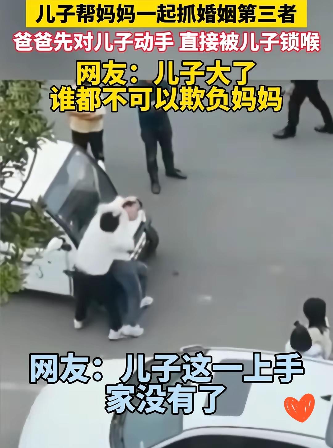 儿子帮妈妈一起抓婚姻第三者 爸爸先对儿子动手,直接被儿子锁喉 网友:儿子大了,谁都不可以欺负妈妈 这波操作我直接拍手叫好!当妈的带着儿子抓小三,正主对峙小三本就够窝火,结果当爹的不仅不认错,还反手对老婆动手!儿子哪能忍?直接锁喉制止亲爹,这波真的帅炸了! 别拿“孝道”道德绑架,爹有错在先,出轨背叛家庭,动手伤害老婆,这根本不配为人父!儿子护妈是本能,更是底线!妈妈辛辛苦苦把他拉扯大,眼看亲妈受委屈,难道要站在旁边冷眼旁观?那才叫冷血! 啥叫对错?背叛家庭的人就该受教训,护着亲妈的孩子就该被点赞!那些说儿子不该对爹动手的,先摸摸良心,要是你妈被欺负,你能无动于衷? 换作是你,看到亲妈被出轨的爹欺负,你会怎么做?