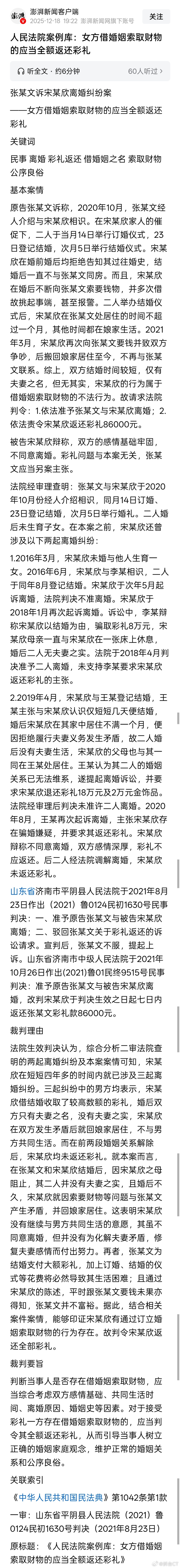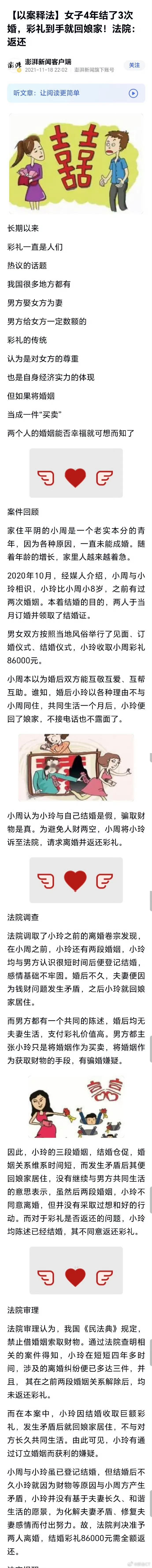 4年3次闪婚闪离,借口身体不适拒绝夫妻生活。最高院于今年年初公开的这起典型案例,已被收录进人民法院案例库。这案子的基本案情,其实不复杂。男女双方于2020年10月经人介绍相识,当月14日,两人举行订婚仪式,23日登记结婚,次月5日举行婚礼。但女方不但拒绝告知男方自己的过往婚史,还以各种理由拒绝同房,并在婚后不断向男方索要财物,并多次故意挑起事端,甚至报警。2021年3月,女方再次向男方要钱并发生争吵后,搬回娘家居住,并不再与男方联系。据统计,两人举办婚礼后,共同生活时间不超过1个月。男方认为,两人仅有夫妻之名,而无夫妻之实,请求法院准许离婚,并责令女方返还彩礼8.6万。法院经审理查明,女方此前即有过类似行为,先后骗取彩礼8万和18万。这案子到最后,被判决离婚,并返还全部彩礼。但另外两案则仅支持离婚。相较于此前报道,新入库的文书载明,该案先后经历过两审。一审法院仅支持离婚,二审法院才既支持离婚,又支持返还彩礼。实务案例看一看