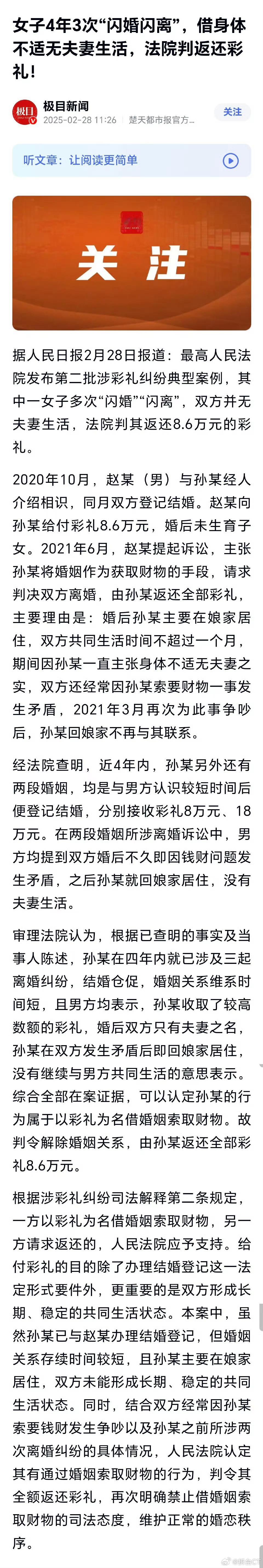4年3次闪婚闪离,借口身体不适拒绝夫妻生活。最高院于今年年初公开的这起典型案例,