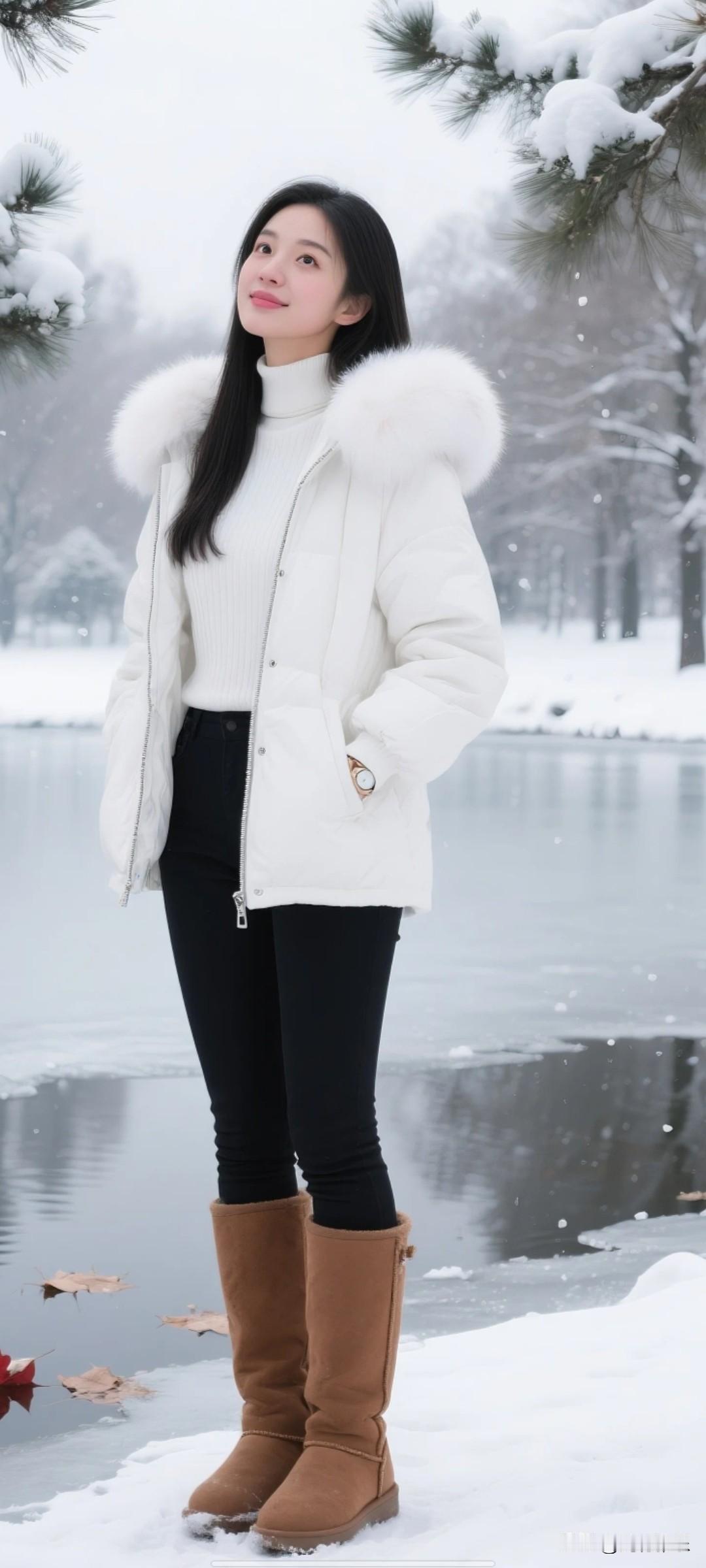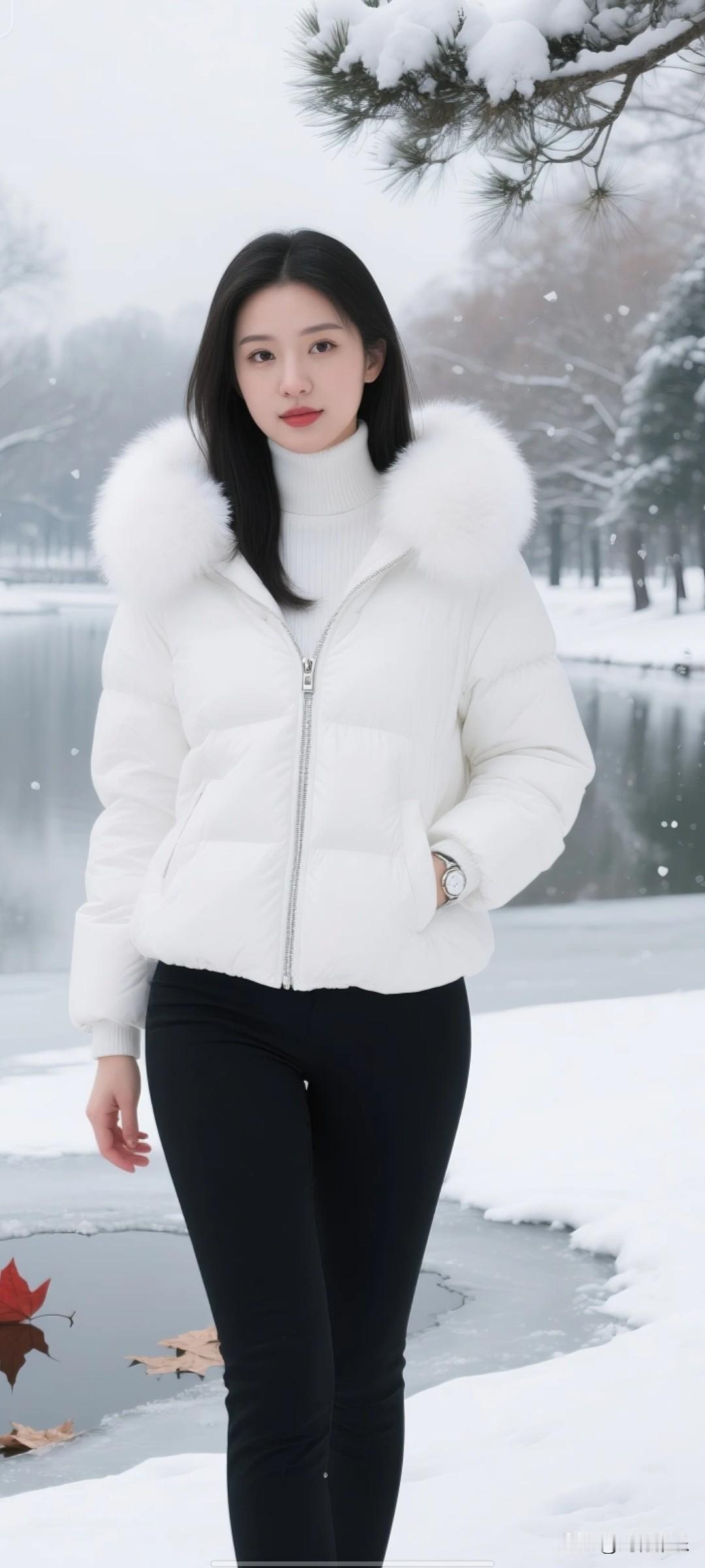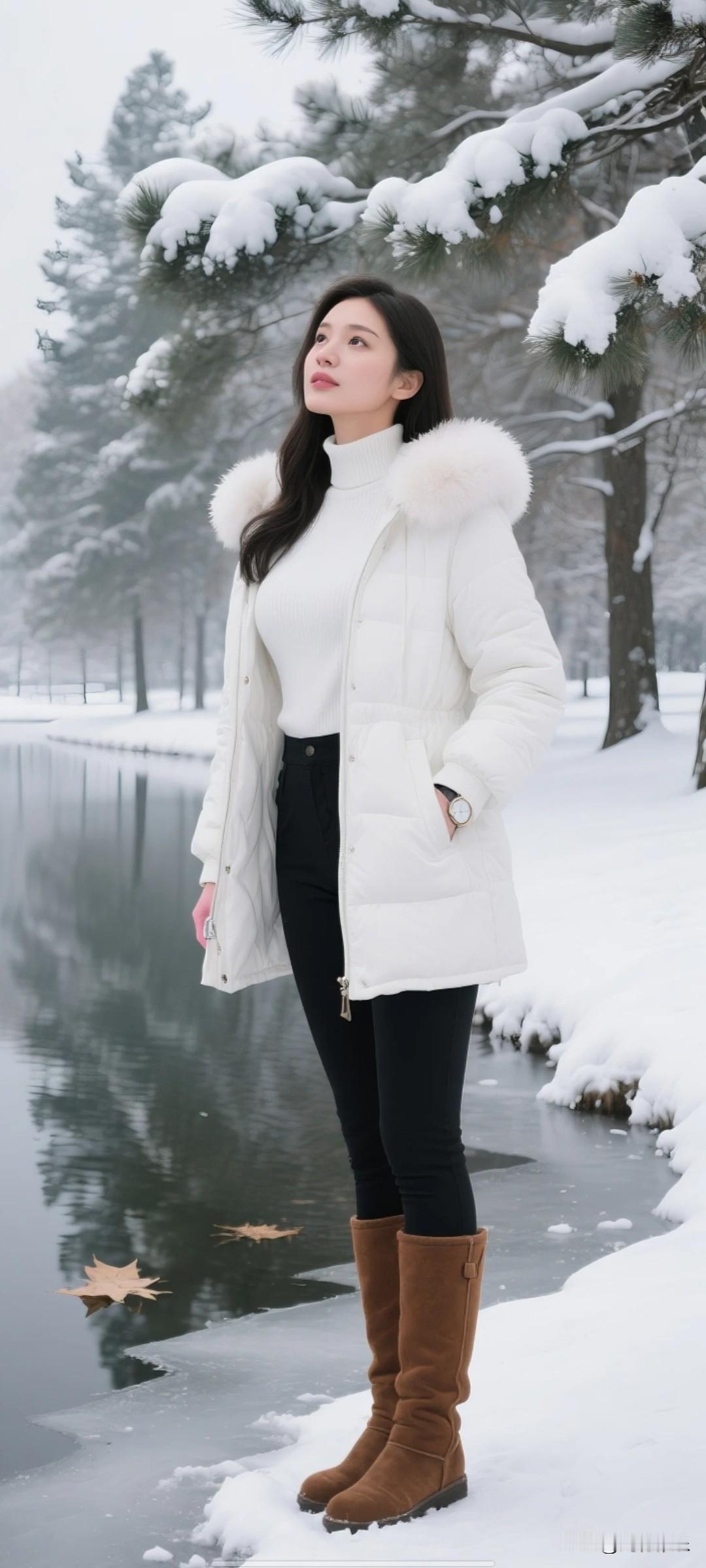 冬日雪景中的温柔少女,白色羽绒服与棕色靴子相得益彰,尽显冬日时尚。