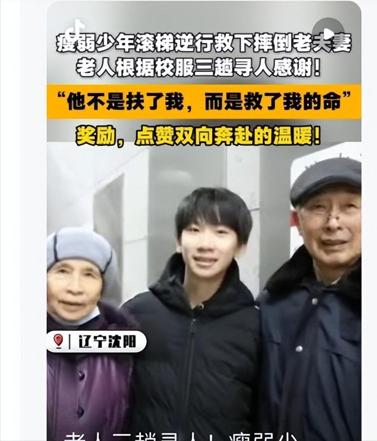 “不是扶了一下!”辽宁沈阳,八旬老两口出地铁站时不慎滚落电梯,一名初三男孩迅速逆行冲下将其扶起。老人被扶起后,却说什么也不让男孩走。 死死攥住——这是所有目击者在事发后最直观的印象。 那是一双布满皱纹、刚刚经历过剧烈撞击的手,即便指节泛白,也不肯松开眼前那件蓝白校服的衣角。被抓住的是个身形瘦弱的男孩,脸上混杂着虚汗和惊魂未定的茫然。这一幕发生在沈阳地铁10号线泉园站的出口,周围的人潮涌动,有人举起手机记录,也有人陷入错愕。这不是一场普通的“扶一把”,而是一次以命相抵的逆行。 此时是12月11日,在这个平常的冬日里,由于身体不适,初三学生高伟峻背着还没来得及放下的书包,提前离校。原本因为生病而有些虚浮的脚步,在听到身后滚梯传来异响的那一秒,瞬间完成了由弱到强的肾上腺素切换。 那一刻,八旬的张奶奶和老伴刚踏上上行扶梯,甚至没来得及站稳,失控的坠落就开始了。老人随着台阶滚落,如同两片在这个钢铁巨兽上身不由己的落叶。 如果是普通的旁观者,大概会被这千钧一发的惨状吓住,脑中甚至会闪过“扶不扶”的社会性犹豫。但高伟峻没有给这些念头留出缝隙。他做了一个连成年人都未必敢做的动作:在快速上行的自动扶梯上,转身,反向全速冲刺。 这简直是在跟物理惯性搏命。监控画面里那个蓝白色的身影,与其说是在跑,不如说是在“砸”向混乱的中心。哪怕他那天还是个带着病容的初中生,此刻却爆发出了惊人的爆发力。为了在巨大的冲力下止住老人的下滑,他几乎把自己变成了一块人形“路障”——左手死命卡住扶手带借力,膝盖像楔子一样顶住老人滑落的腿部,用尚显稚嫩的双臂,生生在运行的阶梯上架起了一道安全网。 事后医院诊断,张奶奶遭遇肋骨骨折之伤;而张大爷亦付出了手臂受伤的代价。二人的伤痛,令人唏嘘不已。连医生见此情形都不禁倒抽冷气。倘若没有高伟峻挺身而出、以身相挡,这对耄耋之年的老夫妻所遭遇的,极有可能是一场无法挽回的灭顶之灾。 而这也解释了开头那一幕令人费解的“僵持”。当两人被转移到安全平台,高伟峻那股子少年人的羞涩劲儿上来,想要混入人群悄悄溜走时,惊魂未定且满身剧痛的老人为何拼了命也要拽住他。那种对于“救命”最本能的应激反应,甚至压过了断肋之痛。张奶奶深知,此际若一松手,这熙攘人海仿若深邃迷宫,孩子一旦走失,便如石沉大海,或许此生再难寻觅其踪迹。 尽管高伟峻最后还是挣脱离开了,但他显然低估了两位经历过生死的老人的倔强。 为了找到恩人,在此后的12月15日和17日,即使每走一步都要忍受肋骨断裂的撕扯感,老两口还是互相搀扶着,拄着拐杖往学校跑了两趟。他们记住了那件校服上模糊的“育源中学”字样,硬是在几千名穿着一模一样校服的学生里“大海捞针”。直至第三次登门,学校经调取监控、逐班排查,方让这名逆行的少年“水落石出”。 如果说那次逆行展现了勇气的本能,那么随后的故事,则更是对人性的一次洗礼。 重逢之地,依旧选定在往昔的地铁口。那熟悉的所在,似岁月织就的茧,藏着旧时光的温暖与期许,在时光长河里静静等待着再次相逢。张奶奶手里攥着早已准备好的2000元现金厚红包,死活要塞进孩子兜里。对于老两口来说,这不是钱,是买一个心安,是绝处逢生后唯一能想到的报答方式。然而,这一举措,竟不经意间触碰到了一位年仅14岁少年内心深处坚守的“底线”,激起层层波澜。 高伟峻当面难敌老人手劲,无奈收下红包。回家后,他即刻向父母坦诚此事。次日,他通过学校渠道,将那红包原封退还,尽显磊落之风。这个年纪的孩子,面对金钱诱惑时的这份清醒和界限感,比他在电梯上的冲刺更让人意外。 随着媒体的介入,事情并没有就此平息。阿里公益旗下的“天天正能量”为这段事迹所动容,特意颁出5000元正能量奖金,以彰其善举,激励更多人传递正能量,让温暖在世间持续蔓延。相比于私人的红包,这是一份光明正大的荣誉,按理说收下无可厚非。 出人意料之事再度上演,高伟峻与家人做出的决定仿若巨石投入平静湖面,激起千层浪——他们竟将一切悉数捐赠出去。 这一系列“反常”的操作背后,藏着一个关于善良的闭环逻辑。高伟峻的父亲高朋春在事后的一番话,揭开了谜底:年轻时他也曾遭遇意外,是被陌生的路人搭救才转危为安。那种刻骨铭心的感激,在这个家庭里内化成了一种无需多言的家教——善良不是为了交换,而是一种传递。 有人感叹现代社会里年轻人与老人的距离在拉大,认为电子屏幕隔绝了冷暖,甚至担心“讹诈”的阴影会让援手变得犹豫。但在这个寒冬的沈阳,一位还没卸下书包的初三学生,用一个下意识的逆行冲刺,粗暴而有力地撕开了这些冷漠的假象。 这场跨越年龄的救援里,少年的身体成了老人的路障,而老人的执着则成了这良善世道的回响。那渗出的冷汗、那怎么也塞不进兜里的奖金、那根拄着去寻人的拐杖,共同撑起了人性中最温暖的那个支点。