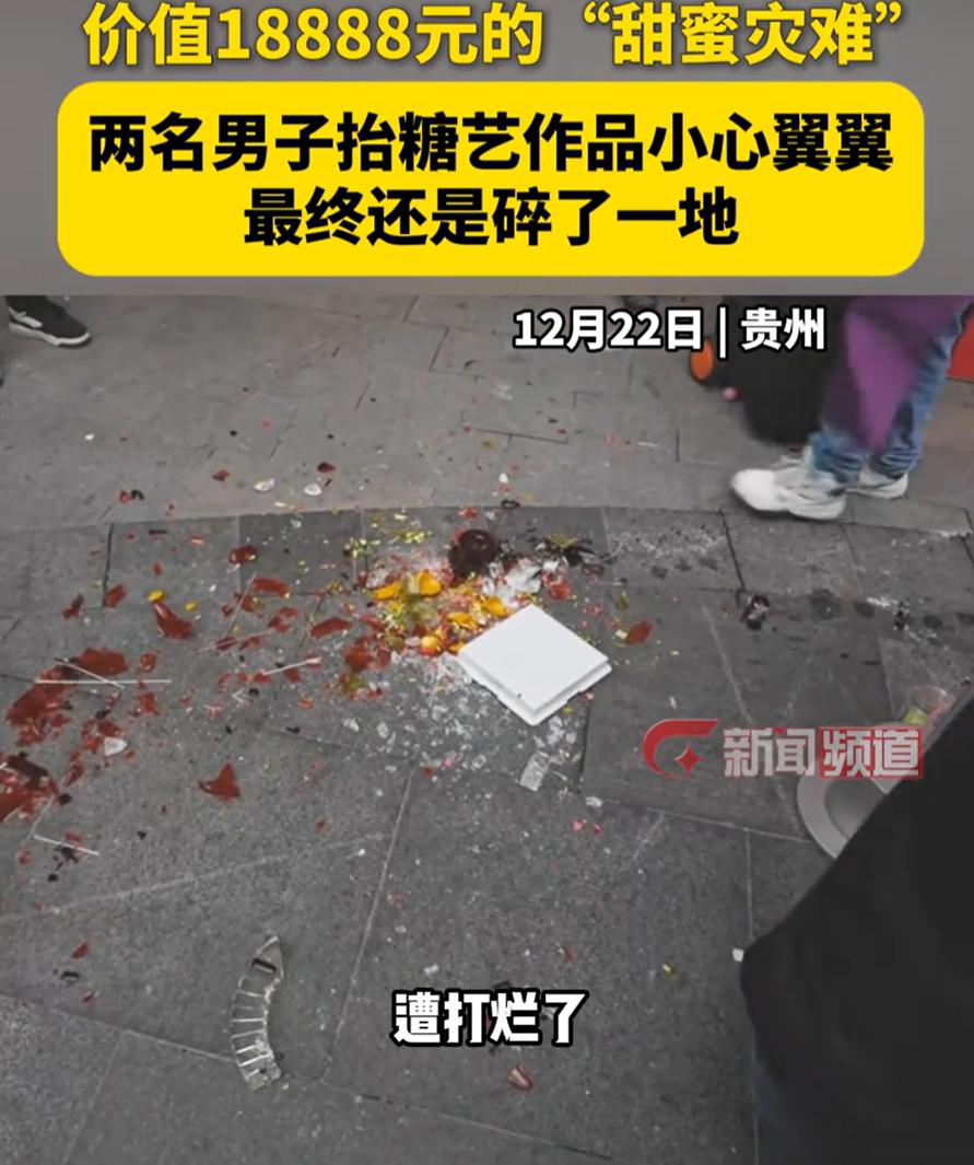 人究竟能闯多大的祸?贵州,一个价值18888元的糖艺作品刚刚做好,可还没等众人欣赏,两名男子在抬起搬运时却一下将其打翻在地,艺术品瞬间碎成了渣,网友:旁边经理的眼神都漏出了杀气 视频中,这个作品师傅花了不少心思,用熬好又冷却的糖一点点捏出了一件作品,顶上还做了把小提琴,造型很精致。据师傅介绍,做这个糖艺前后耗费不少时间,材料加上手艺,价值一万八千八百八十八元 可惜的是,作品刚完成,需要移到展示的地方。两名男子上前帮忙搬运,旁边的女经理不停提醒“小心点、慢一点”,两人也显得很谨慎,可就在移动过程中,整个糖艺突然从手中滑落,砸到地上,瞬间碎成一片。周围也是一片惊呼 对此,有网友表示:这就是两个猪队友,为什么要用手抬,难道不能弄一个推车吗? 但也有网友认为:底座都没固定,而且头重脚轻,也不能怪两名男子 说实话,这事真正让人心里一紧的,不是钱,是那种努力被意外瞬间清零的感觉。糖艺本身就有很强的时效性,温度、湿度、时间全都卡得很死,师傅前面花的心思、熬的时间,地上一秒钟全交代了。这种损失,很难用一句赔钱就翻篇 换个角度看,这也是很多现场翻车的通病。大家往往只盯着作品有多贵,有多好看,却忽略了流程和专业分工 谁来搬,怎么搬,用什么工具,本该在作品完成之前就敲定。糖艺和雕塑不一样,它更像一次性成果,容错率极低。让不熟悉结构的人徒手操作,本身就把风险拉满。只能说这次很多人都有责任