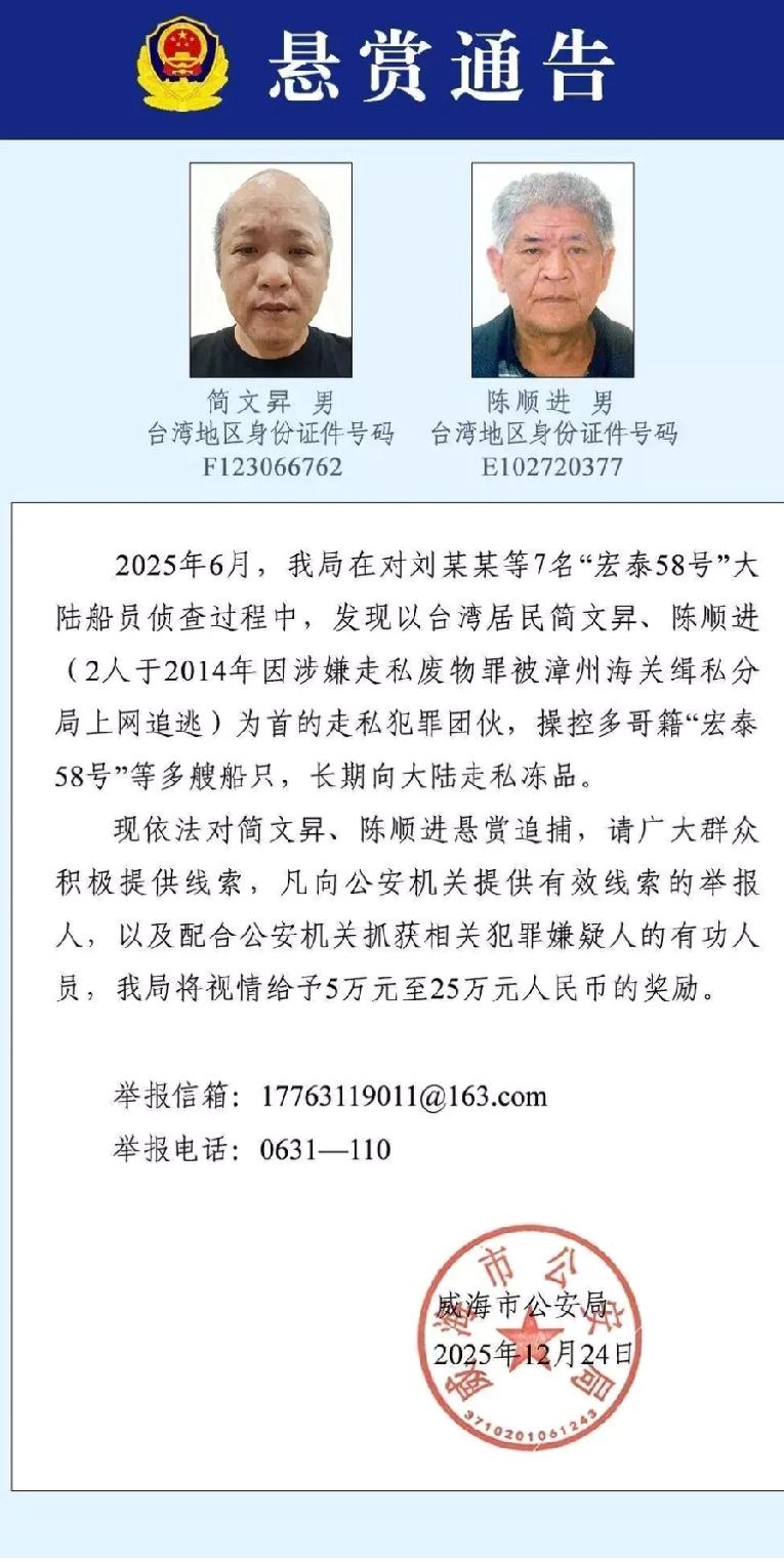 威海公安发悬赏公告抓2名台籍人 台湾居民简文昇,陈顺进,他们的走私团伙操控多哥籍“宏泰58号”等多艘船只,长期向大陆走私冻品。凡提供有效线索的举报人可得5万—25万元人民币。举报电话0631—110。这两名嫌疑人早被通缉,十分狡猾,犯事时间长,危害大,早抓早除害,多多转载能增加追捕力度,胆敢再来,必然会落入法网。