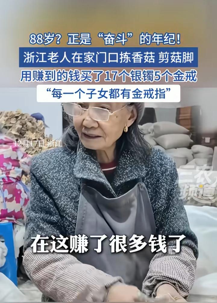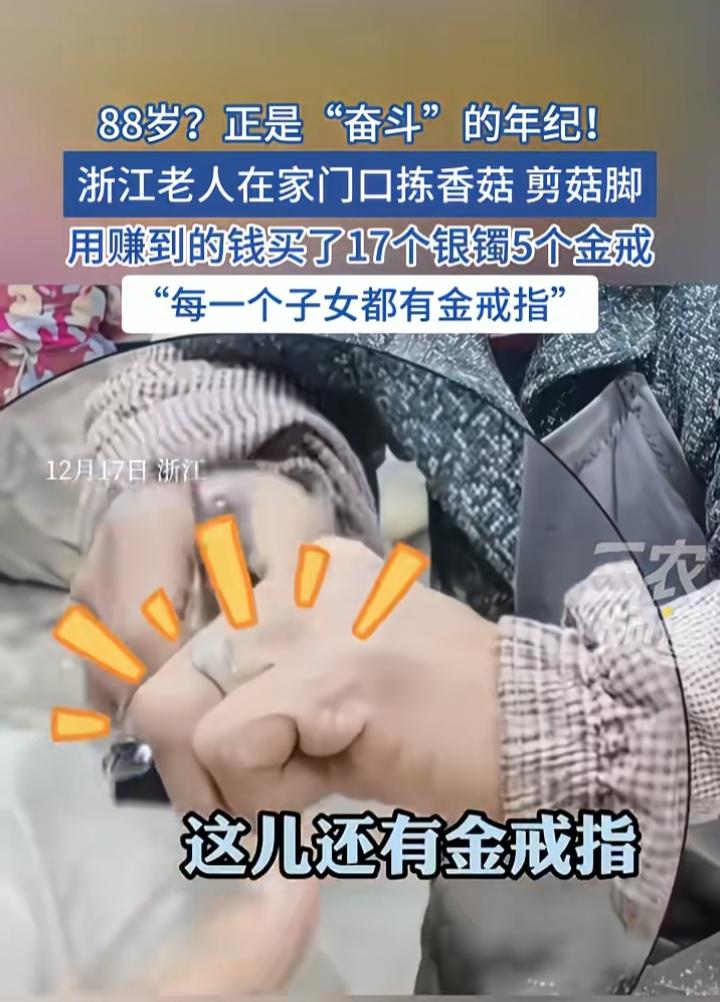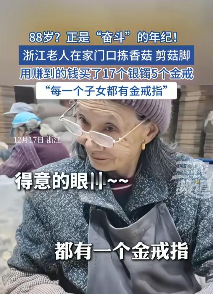 这个阿婆太可爱了!看她有点傲娇又得意的表情,88岁了,捡香菇,剪菇脚,用赚的钱买了17个银镯和5个金戒指,每个子女都有金戒指,她自己也高兴的很 阿婆好厉害呀,88岁高龄,身体健康,精神矍铄,还能干活赚这么多钱,还给孩子买东西,一看就知道她很幸福,惦记着孩子们,孩子们也惦记着她