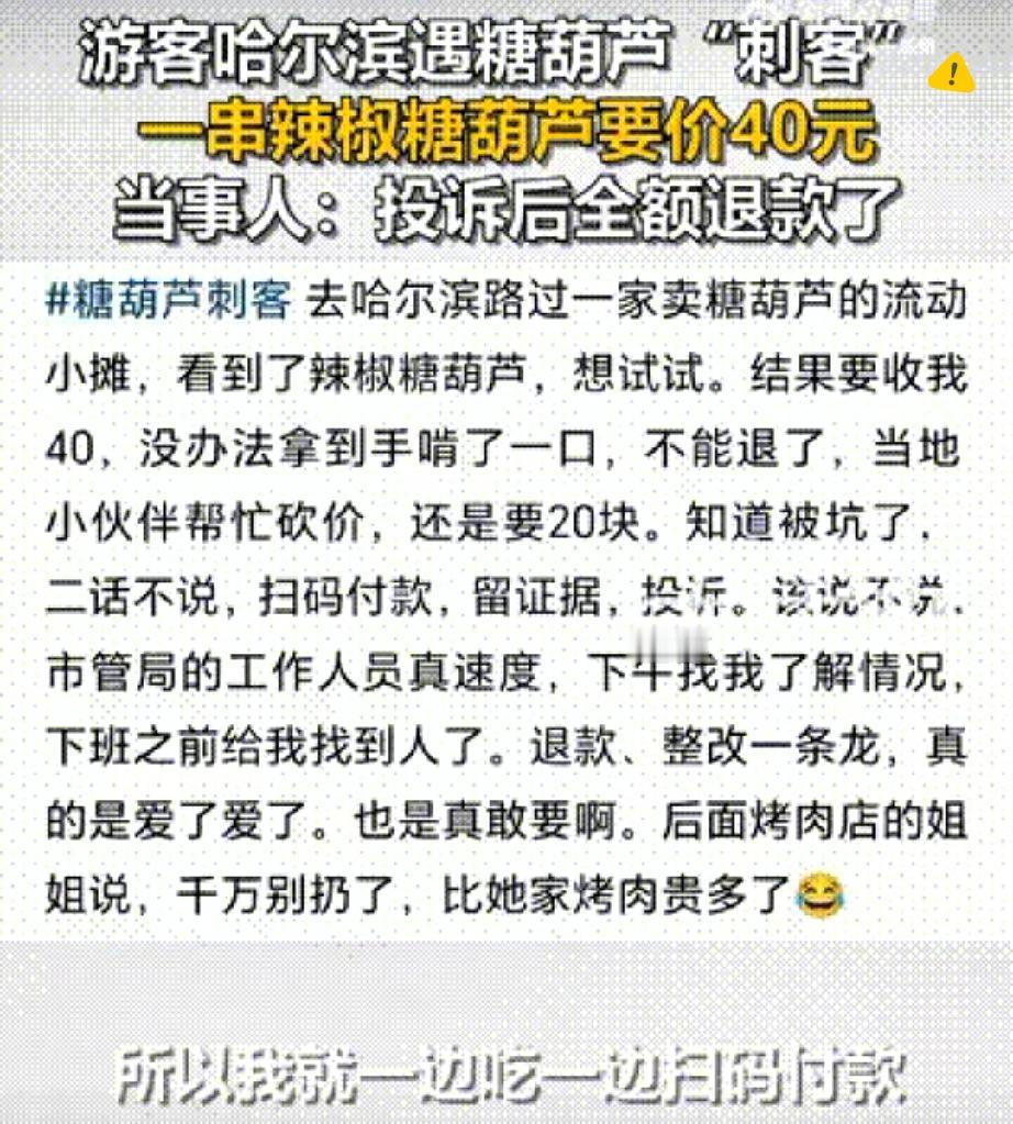 10元辣椒糖葫芦卖40元? 个别摊贩别砸了哈尔滨的暖心招牌! 谁能想到,南方游客在哈尔滨买串辣椒糖葫芦,没问价先咬了一口,竟被老板要价40元,还好监管部门及时介入退了全款! 哈尔滨花了多少心思才攒下“宠粉”口碑,12315热线24小时待命,重点区域还有维权服务站,就是想让游客安心。 可个别摊贩专挑外地人“宰”,把10元的糖葫芦翻倍涨价,这哪里是做生意,分明是在消耗整座城市的信任。 游客来玩图的是开心,不是被当“冤大头”。 城市的口碑从来不是靠宣传堆出来的,而是靠每一次公平交易攒起来的。 监管再严,也得靠商户守住诚信底线。你在旅游时遇到过“看人下菜碟”的宰客行为吗? 评论区说说你的经历!