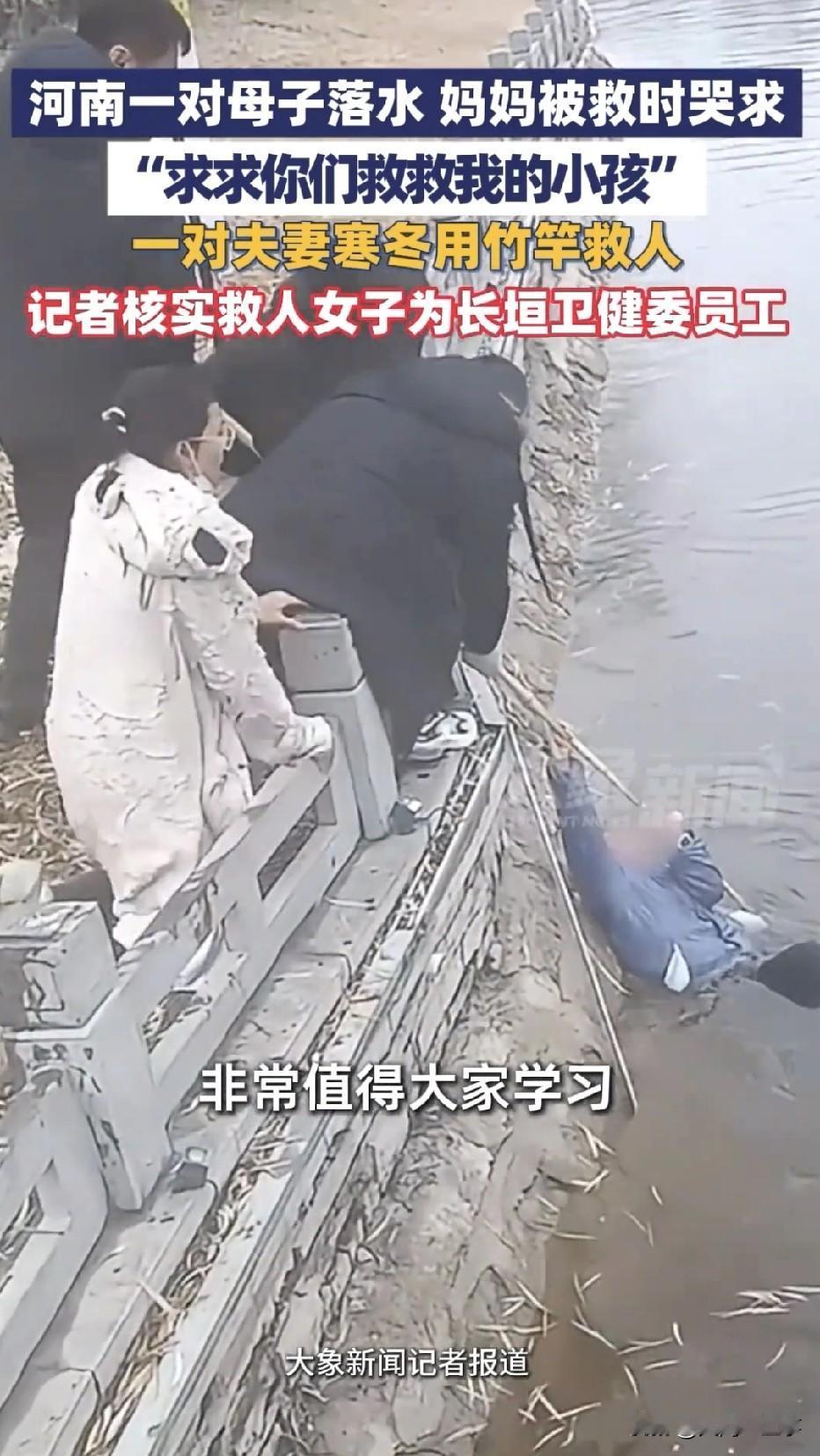 河南长垣,一对母子不慎失足落水,母亲被水流冲到了桥下,年幼的孩子因身形瘦小,再加上穿着厚棉衣,小小的身子在水面上沉沉浮浮,情况十分危机,一对夫妻见状,急中生智,用一根长竹竿将两人救起! 寒冬腊月,河水冰冷刺骨,一对母子不慎落水,就在这生死关头,路过的杜小晶和丈夫郜会勇,还有一位热心大爷立刻冲了过来。 寒冬的河水又凉又急,贸然下水不仅救不了人,还可能把自己搭进去,夫妻俩心里门儿清,没有丝毫犹豫,转身就找到岸边备好的长竹竿。 郜会勇第一时间把竹竿竖到落水母亲身前,眼看女子漂到桥下抓住竹竿,杜小晶直接趴在岸边,死死攥住她的手往岸上拉。 刚被拉到岸边、浑身湿透冻得发抖的母亲,顾不上自己的安危,撕心裂肺地哭喊:“救救我的小孩!” 这一声哀求,听得人心头发紧。夫妻俩不敢耽搁,郜会勇赶紧接力把母亲拽上岸,杜小晶立马拿着竹竿转身冲向孩子落水的方向,岸边的大爷也大声喊着:“孩子快翻身,抓住棍子!” 孩子拼尽全力攥住竹竿,小手死死不肯松开,杜小晶一点点把竹竿往岸边拉,郜会勇赶来帮忙,两人又合力把孩子拖上了岸。 孩子上岸的那一刻,落水母亲顾不上浑身冰冷,连滚带爬地扑向孩子,万幸的是,母子二人都脱离了危险。 更暖心的是,杜小晶二话不说脱下自己的棉袄,裹在了浑身湿透的孩子身上,给孩子抵挡刺骨的寒风。 这一幕看得人热泪盈眶,寒冬里的河水凉透骨髓,但这对夫妻的举动,却暖透了所有人的心。 他们没有逞匹夫之勇,而是用最稳妥、最智慧的方式救人,一根普通的竹竿,在他们手里成了救命的法宝,既救下了落水母子,也护住了自己的安全,这才是见义勇为最该有的样子。 其实咱们都清楚,冬天下水救人,考验的不只是勇气,还有理智。很多时候盲目下水,不仅救不了人,反而会酿成更多悲剧。 这对夫妻的做法,给所有人上了一课:见义勇为从不是一腔孤勇的蛮干,而是冷静判断后的伸手相助。 面对危险,先护住自己,再用智慧救人,这份清醒和善良,比单纯的勇敢更可贵。 而那位母亲在生死关头,心里想的只有孩子,这份母爱的本能,更是世间最动人的牵挂,任谁听了那句哭喊,都会忍不住揪心。 世间的温暖,从来都藏在这些平凡的瞬间里。一根竹竿,一双援手,一声呐喊,就足以在寒冬里撑起生的希望。 这对长垣夫妻,只是普通的路人,却在别人危难之际挺身而出,他们的善举,不仅救下了一个家庭,更让我们看到了人性里最耀眼的光芒。 生活里从不会缺少意外,但万幸的是,总有陌生人愿意为素不相识的人伸出援手。这份善意不分大小,不分身份,就像寒冬里的一束光,照亮前路,也温暖人心。 愿我们都能带着这份善意前行,遇危难时有人相助,见他人难时伸手相扶,让平凡的日子里,多些温暖,少些遗憾。