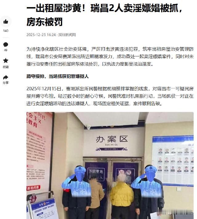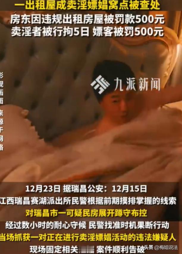 江西瑞昌,一出租屋竟成卖淫窝点!民警根据线索,对一可疑民房蹲守布控,数小时后当场抓获一对正在卖淫嫖娼的违法嫌疑人。经查,房东法制意识淡薄,没登记承租人身份信息,也没签租赁合同,收钱就让人住,对租客情况一无所知,给涉黄活动提供了机会。最终,出租屋房东被罚500元,嫖客被罚款500元,卖淫者被行拘5日。 (来源:九派新闻、深圳新闻网) 老张有一套民房闲置着,就想着租出去赚点钱,老张这人,平时就大大咧咧的,对法律法规也不太上心。 12月初,有个中年男人找到老张,说想租他的房子,老张也没多问,看对方给了定金,就满口答应了。 这男人说自己是来瑞昌打工的,想找个便宜点的地方住。 老张也没要求看他的身份证,更没提签租赁合同的事,收下钱就让人搬进去了。 搬进去没几天,这男人又带了个女人回来。老张偶尔碰到,也没多问,觉得租客有自己的生活,自己没必要管太多,他心里只想着每个月能按时收到房租就行。 12月15日,民警前期通过摸排,掌握了一条重要线索,一处民房可能存在涉黄违法活动,民警们立刻行动起来,对这处可疑民房进行了蹲守布控。 这一蹲就是数小时,民警们眼睛都不敢多眨一下,紧紧盯着民房的动静。 终于,在傍晚时分,他们看到一对男女鬼鬼祟祟地进了民房。 过了一会,里面传出了不寻常的声音。 民警们当机立断,冲进民房,当场将这对正在进行卖淫嫖娼活动的违法嫌疑人抓获。 被抓的两人,一个是之前租房的中年男人,也就是嫖客,另一个是卖淫女。 两人被抓后,吓得话都说不出来了。 民警很快就找到了房东老张,当民警问老张关于租客的情况时,老张一脸茫然。 他说自己根本没登记承租人的身份信息,连租赁合同都没签,收钱就让人住了,对租客的真实身份和平时的活动一无所知。 房东老张没登记租客信息、不签合同就出租,这种做法常见吗? 有些房东为了图方便,或者觉得租客看着老实,就不走正规流程。 但他们没意识到,这样做风险很大,一旦租客出了问题,自己也得跟着担责任。 有人说,房东就是贪图小便宜,才酿成大祸。 也有人说,房东就是法律意识淡薄,根本不知道自己的行为有多严重。 大家都在讨论,房东到底该不该承担责任,该承担多大的责任。 从情感上来说,房东的行为实在是让人难以接受,他为了自己的利益,置社会的公序良俗于不顾,给涉黄违法活动提供了温床。 从道理上讲,房东作为房屋的出租人,有责任和义务对租客进行管理和监督。 他应该按照规定登记承租人的身份信息,签订租赁合同,了解租客的基本情况和活动范围。 这是他的基本责任,也是他应该遵守的道德准则。 他却没有做到这些,他应该为自己的行为付出代价,接受法律的制裁。 根据《治安管理处罚法》第57条规定,房屋出租人将房屋出租给无身份证件的人居住的,或者不按规定登记承租人姓名、身份证件种类和号码的,处二百元以上五百元以下罚款。 房东没按规定登记承租人身份信息,也没签租赁合同,就让人入住,这明显违反了这条法律规定。 他这种行为,给涉黄违法活动提供了机会。 根据《治安管理处罚法》第66条规定,卖淫、嫖娼的,处十日以上十五日以下拘留,可以并处五千元以下罚款;情节较轻的,处五日以下拘留或者五百元以下罚款。 12月16日,房东被传唤至派出所,承认违规出租。 最终,房东被罚款500元,卖淫女被行拘5日,嫖客被罚款500元。 房东只是没登记信息,没签合同,他又没有直接参与卖淫嫖娼,怎么就要罚款呢? 这是因为,房东虽然没有直接参与违法活动,但他的行为为违法活动提供了条件。 他的不负责任,使得涉黄违法活动得以在出租屋里进行,所以必须承担相应的法律责任。 ,如果房东说自己不知道租客是干什么的,能不能免责呢? 作为房屋出租人,房东有义务了解租客的基本情况,对租客进行管理和监督。 他不能以不知道为借口,逃避自己的责任。 即使他真的不知道租客是干什么的,他也没有尽到自己的义务,所以还是要承担法律责任。 老张拿着处罚决定书,没想到自己的一时疏忽,会给自己带来这么大的麻烦。 他暗暗下定决心,以后租房一定要守规矩,不能再这么马虎了。