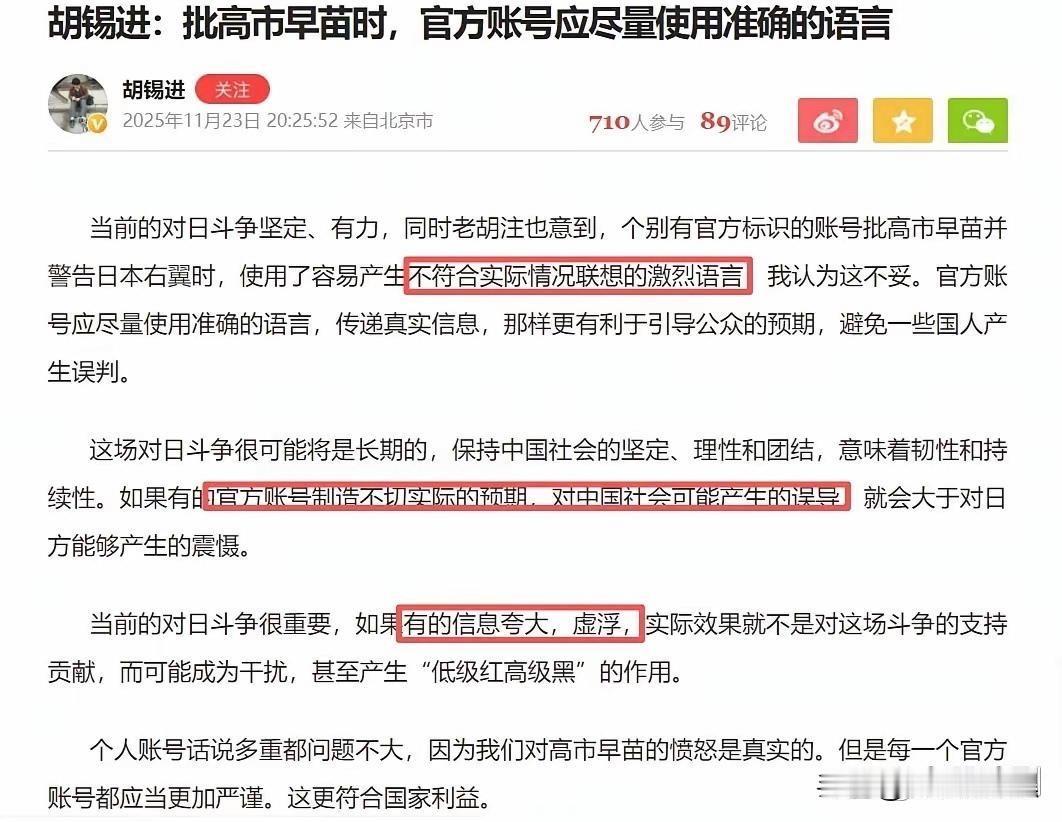 胡锡进同志进步了,你进步了吗? 想当初,佩洛西窜访台湾,胡锡进上蹿下跳,言出激进,在微博上叫嚣“要击落对方飞机”,结果无数网民被煽动起来,夜不能寐的守在电视前,就算躺在床上也是瞪大双眼紧盯手机,结果一夜无话,第二天众人把胡锡进骂的狗血喷头,无地自容。 这一次,虽然日本政府上蹿下跳的比洛佩西窜台还嚣张,胡锡进同志却再三给大家伙降温,不再激进如初,体现了一个成熟媒体人的形象。 所以,请大家向胡同志学习,一切听从政府安排,莫被别有用心的人煽动,让政府难堪。 看看图1和图2,从中就能看出胡同志的进步! ————————————