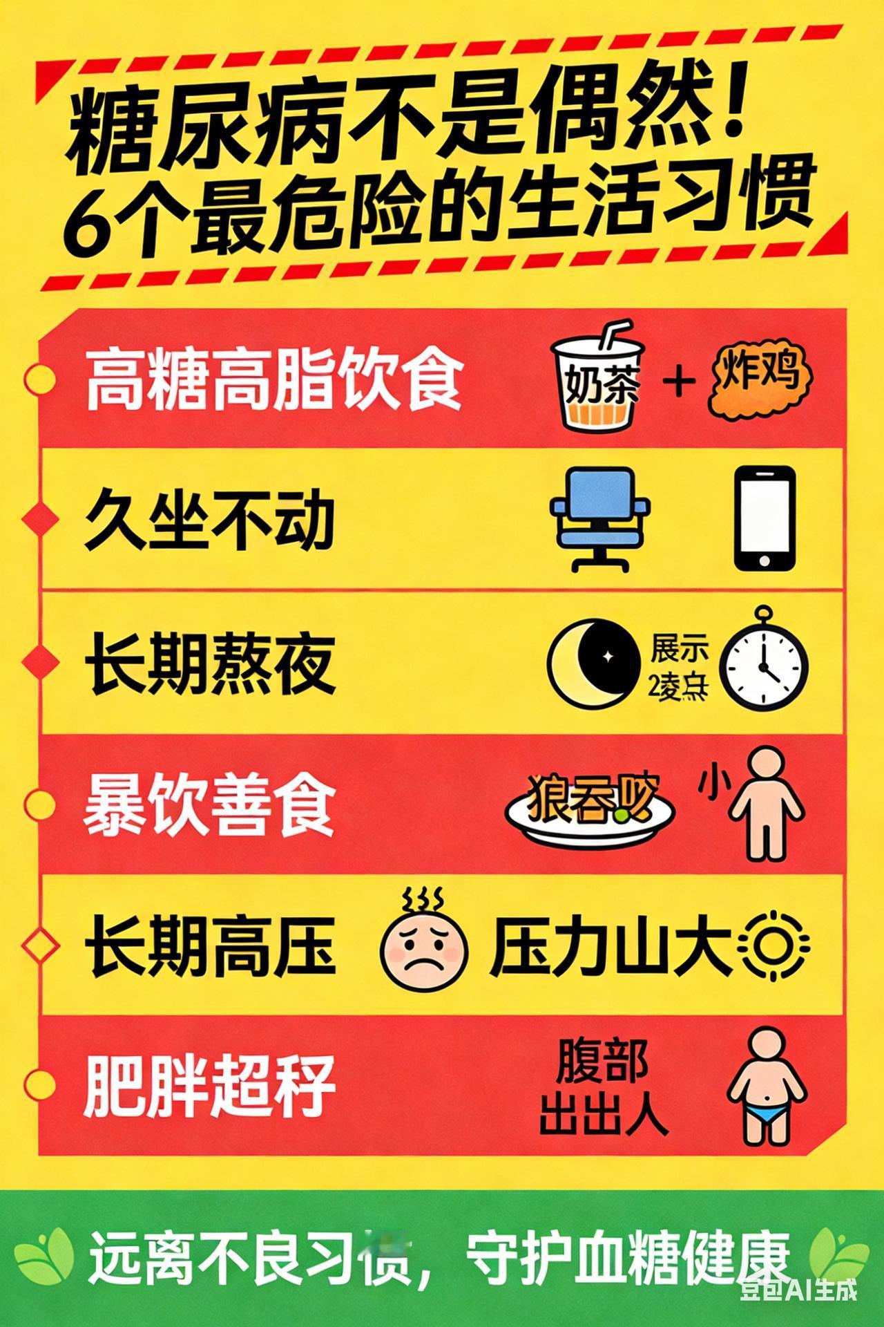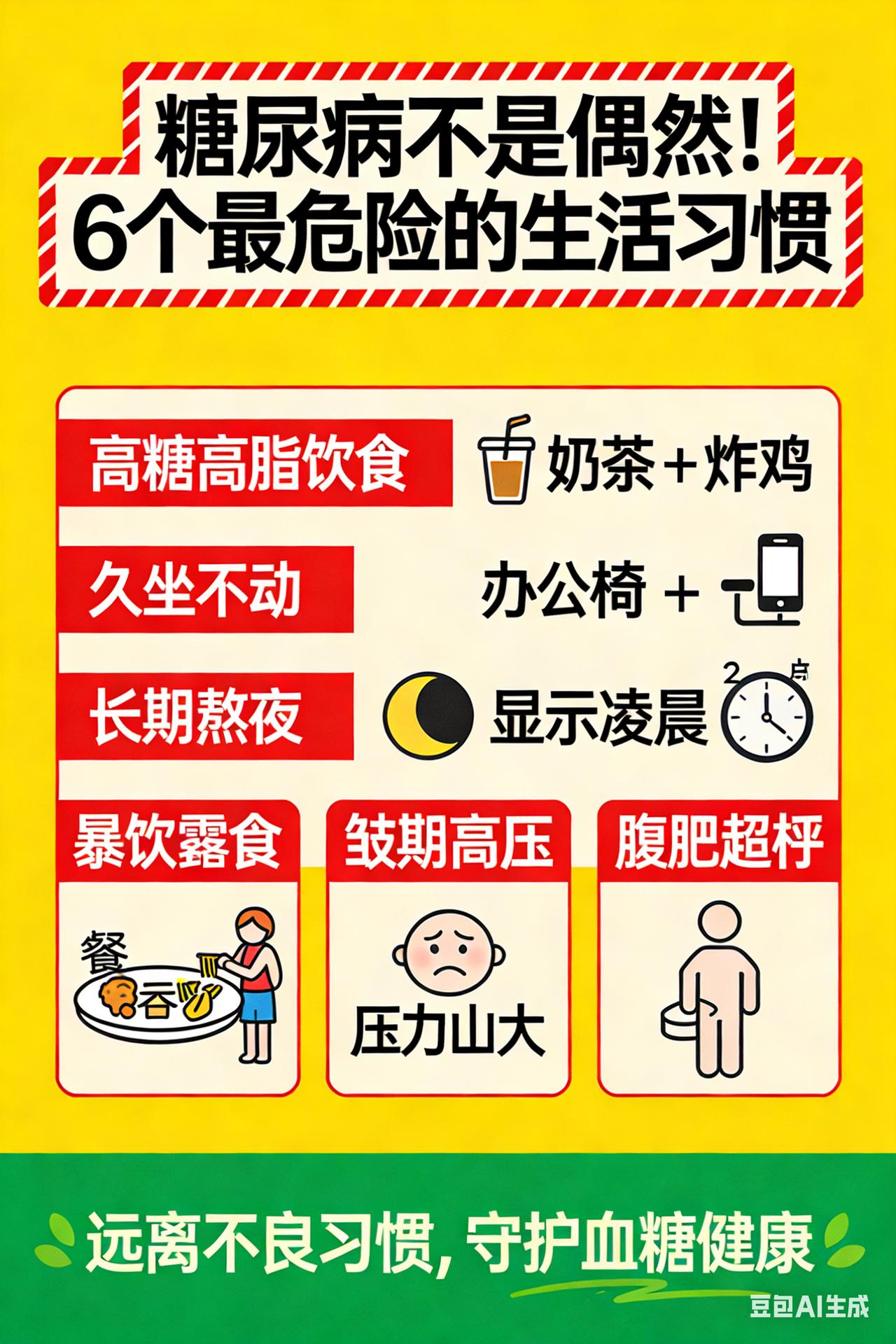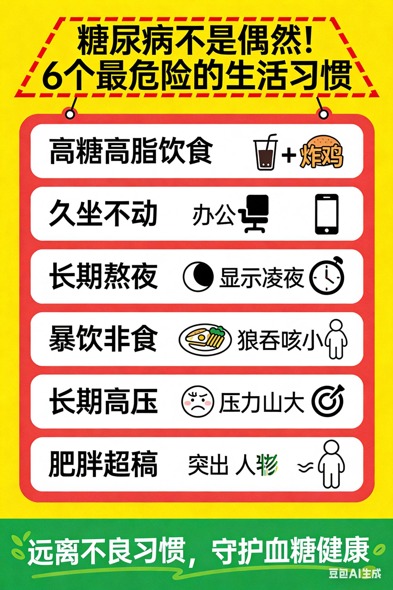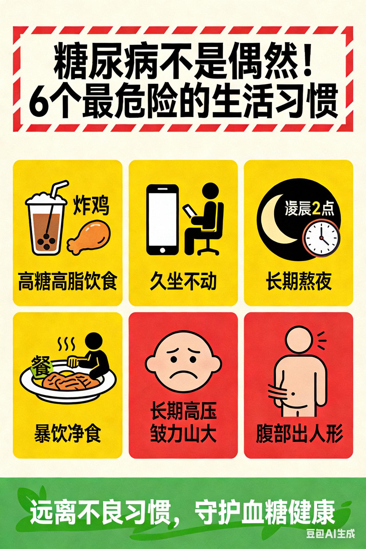 糖尿病不是偶然!医生总结 6 个最危险的生活习惯 人不会无故患糖尿病!医生发现:患糖尿病的人,大概有这6个习惯 糖尿病作为一种常见的慢性疾病,正日益威胁着人们的健康。医生在长期的临床观察和研究中发现,患糖尿病并非偶然,患者大多存在以下6个不良习惯。 高糖高脂饮食无节制 如今,各种高糖、高脂肪的食物充斥着我们的餐桌。很多人钟情于蛋糕、巧克力、油炸食品等。这些食物进入人体后,会迅速转化为葡萄糖,使血糖急剧升高。为了降低血糖,胰腺需要分泌大量胰岛素。长期如此,胰腺超负荷运转,功能逐渐衰退,胰岛素分泌不足或作用减弱,血糖便难以维持在正常水平,最终引发糖尿病。而且,高脂饮食还容易导致体重增加,肥胖又会进一步加重胰岛素抵抗,形成恶性循环。 久坐不动成常态 现代科技的发展让人们的生活越来越便捷,但也带来了久坐不动的问题。上班族长时间坐在办公桌前,下班后又窝在沙发上看电视、玩手机。缺乏运动使得身体的新陈代谢减缓,肌肉对葡萄糖的摄取和利用能力下降,血糖无法及时被消耗,就会在体内堆积。同时,久坐还会导致脂肪堆积,尤其是腹部脂肪增多,增加胰岛素抵抗的风险,进而诱发糖尿病。 长期熬夜扰乱生物钟 睡眠是身体恢复和调节的重要时期。然而,很多人由于工作、娱乐等原因长期熬夜。熬夜会打乱人体的生物钟,影响内分泌系统的正常功能。生长激素、皮质醇等激素的分泌紊乱,会干扰胰岛素的正常作用,使血糖调节失衡。长期熬夜还会导致身体免疫力下降,增加患糖尿病等慢性疾病的风险。 精神压力过大难释放 现代社会竞争激烈,人们面临着来自工作、家庭、经济等多方面的压力。长期处于精神紧张、焦虑、抑郁等不良情绪中,身体会分泌肾上腺素、去甲肾上腺素等应激激素。这些激素会升高血糖,为身体应对压力提供能量。但如果长期压力过大,应激激素持续分泌,就会导致血糖持续升高,最终引发糖尿病。 吸烟酗酒成恶习 烟草中的尼古丁、焦油等有害物质会损害身体的血管和神经,影响胰岛素的正常分泌和作用,降低身体对胰岛素的敏感性。同时,吸烟还会导致血脂升高,增加动脉粥样硬化的风险,进一步加重糖尿病的并发症。而长期大量饮酒会损伤肝脏,影响糖代谢,导致血糖波动。此外,酒精还会抑制肝糖原的分解,在空腹时容易引发低血糖,长期如此也会对血糖调节产生不良影响。 不重视定期体检筛查 很多人对自己的健康状况缺乏关注,不重视定期体检。糖尿病在早期往往没有明显的症状,等到出现多饮、多食、多尿、体重减轻等典型症状时,病情可能已经较为严重。定期进行体检,尤其是血糖检测,可以及时发现血糖异常,早期干预和治疗,有效预防糖尿病的发生和发展。 为了远离糖尿病的困扰,我们要摒弃这些不良习惯,养成健康的生活方式,定期体检,让健康常伴左右。