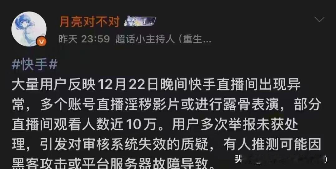 谁能想到,深夜刷快手差点被辣眼睛 22日晚10点左右,快手突然涌进露骨直播 有的穿得少扭来扭去,有的放低俗画面 评论区全是“这啥啊”“平台崩了?” 官方凌晨急回应,是遭黑灰产攻击 已经清完违规内容,报了警还找了有关部门 之前2024年有个短视频平台也遇过这糟心事 300多个直播间被塞违规广告 清了3小时才干净,几百万用户受影响 作为北快手,这么大平台犯不着自导自演 谁会拿招牌开玩笑?明显是被人搞了 网友评论挺真实——有说“刷美食突然切到露肩的,赶紧退” 有骂“黑灰产缺德,平台得加防护” 还有担心“要是极端分子用了,后果更严重” 我觉得这事真不是平台的锅,黑灰产太猖狂 得严打,平台也得升级防护 不然用户安全感没了,谁还敢刷 你们昨晚刷到异常直播了吗?对这事怎么看