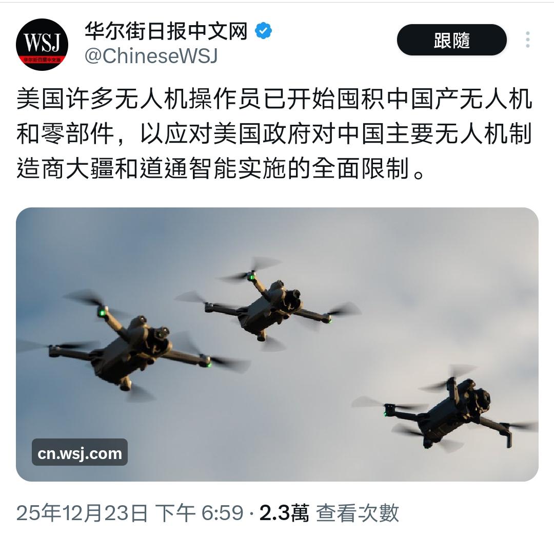 无人机囤货走起! 这就叫“上有政策,下有对策”。 这种反智政策吵了也不是一年两年了。不一定能实施,即便真实施了,应该也有会业者去反向游说,以求豁免。不过,批量囤货,总归是可以来个批发价,还是合算的! Source: X
