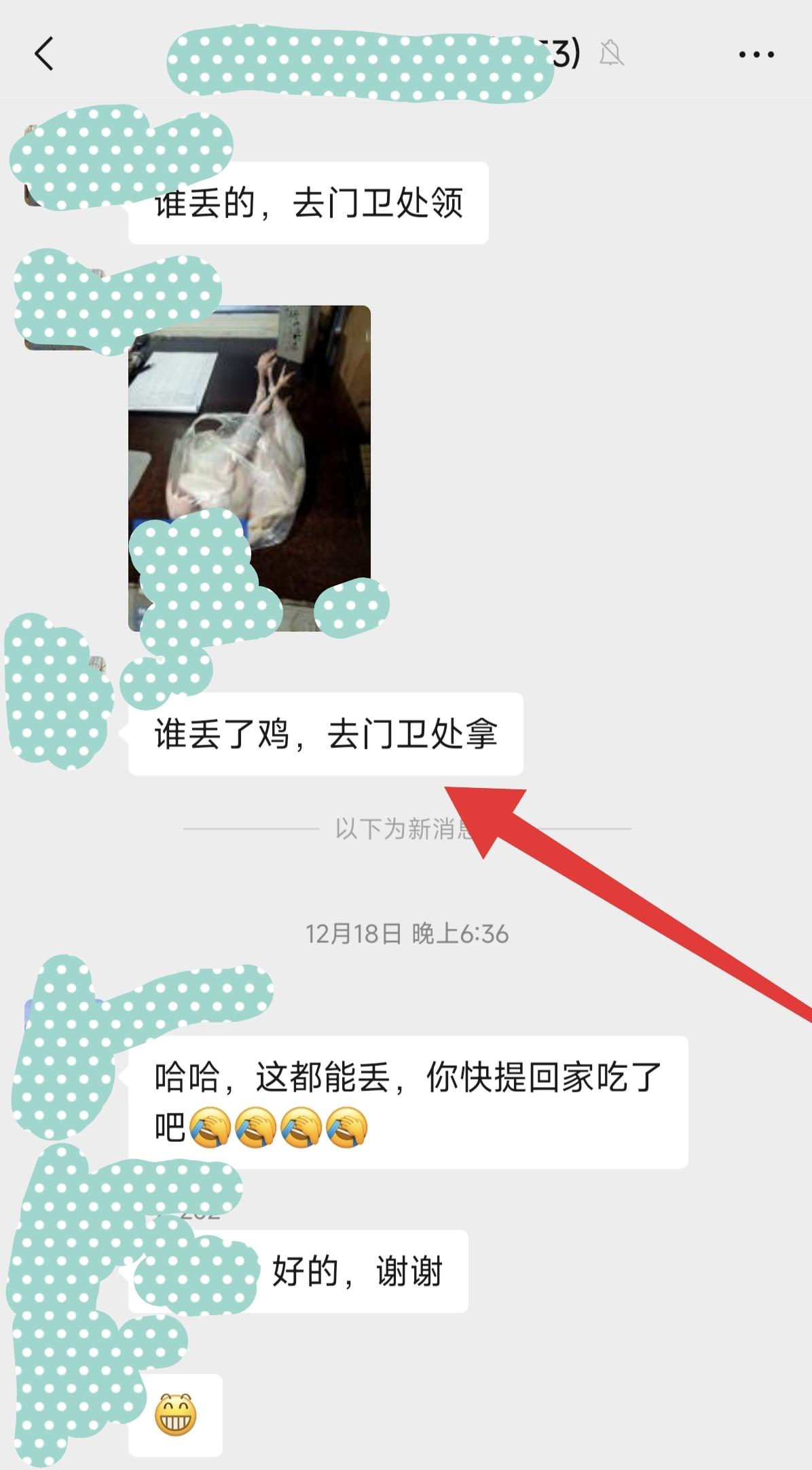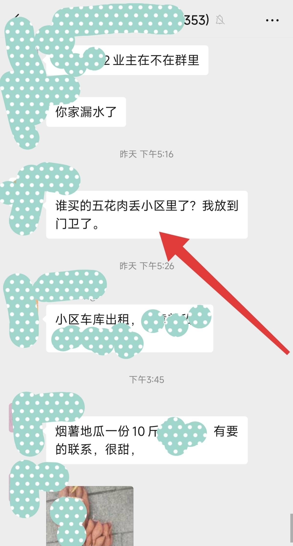 看看俺小区这可爱的邻居们,整天丢三落四!上午有丢鸡的,下午有丢五花肉的,看出来了吃的都不错,但怎么就不知道珍惜食物呢? 不过,邻居们捡到了都放门卫那里,发群里让丢失者去领,这邻里氛围可以吧?小区业主群名字叫XX村,真的就是一个热热闹闹的村子。