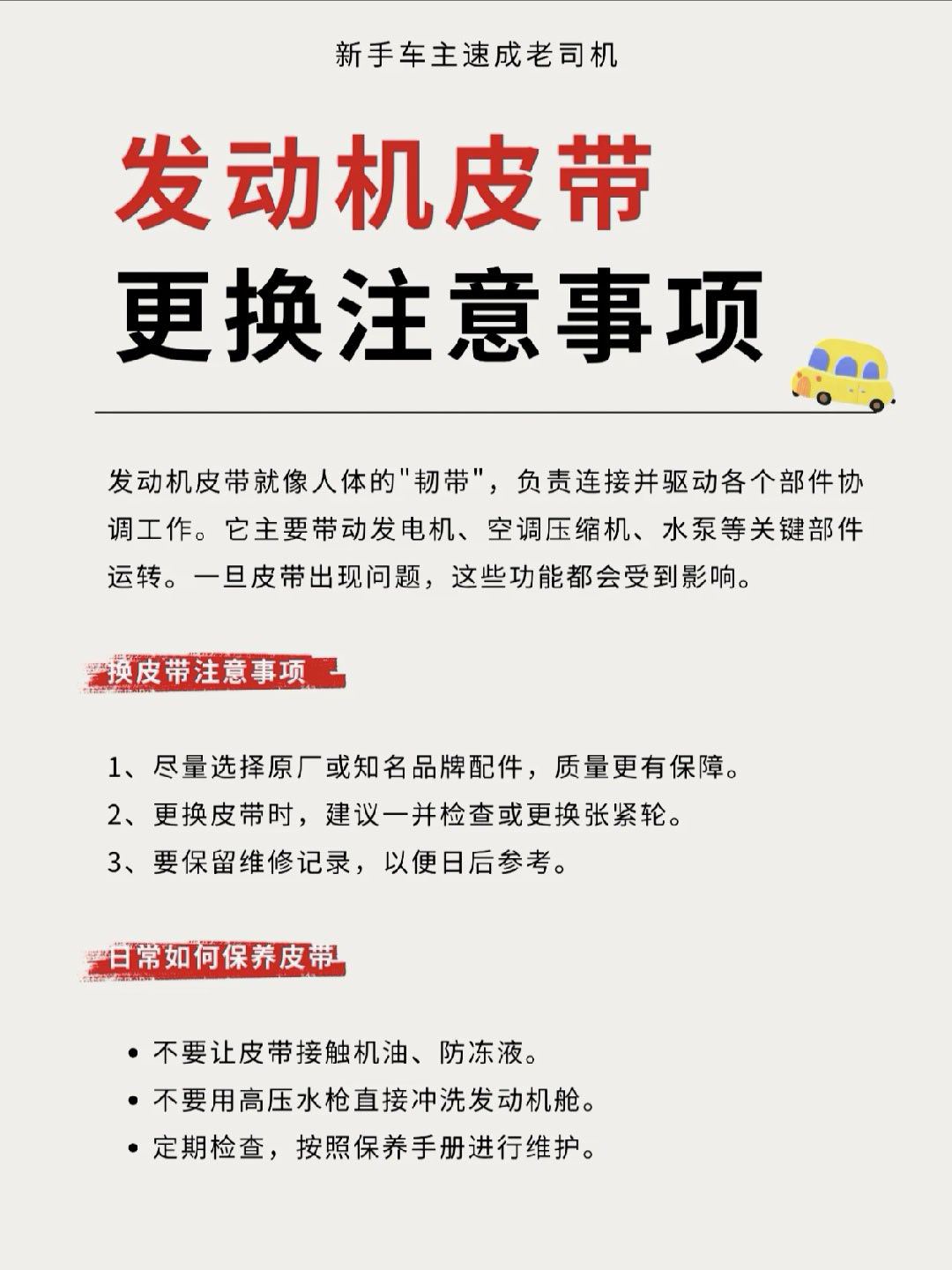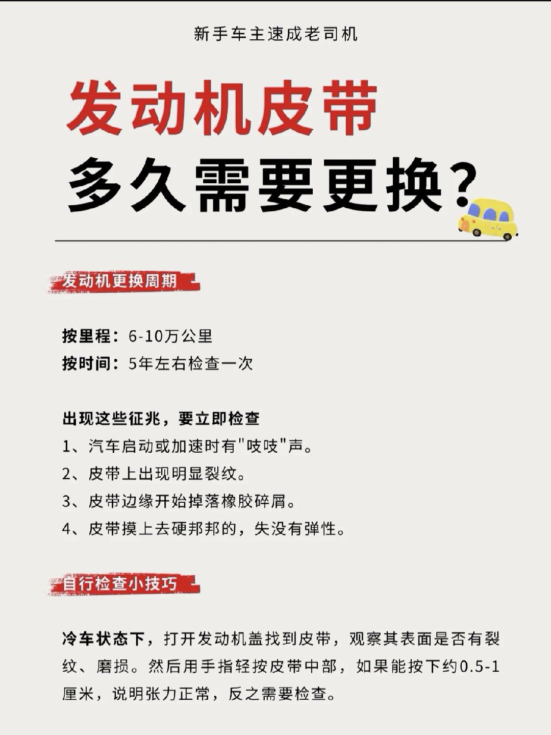 发动机皮带多久换❓其实很简单❗💡更换标准看里程:8-10万公里看时间:4-5年💡自检小方法冷车状态下,看皮带表面有无裂纹、毛边。用手按压,下沉0.5-1cm算正常。🚫警惕这些异常:1、启动或加速时有“吱吱”异响。2、皮带表面有明显裂纹、掉碎屑。我与汽车的日常大v聊车