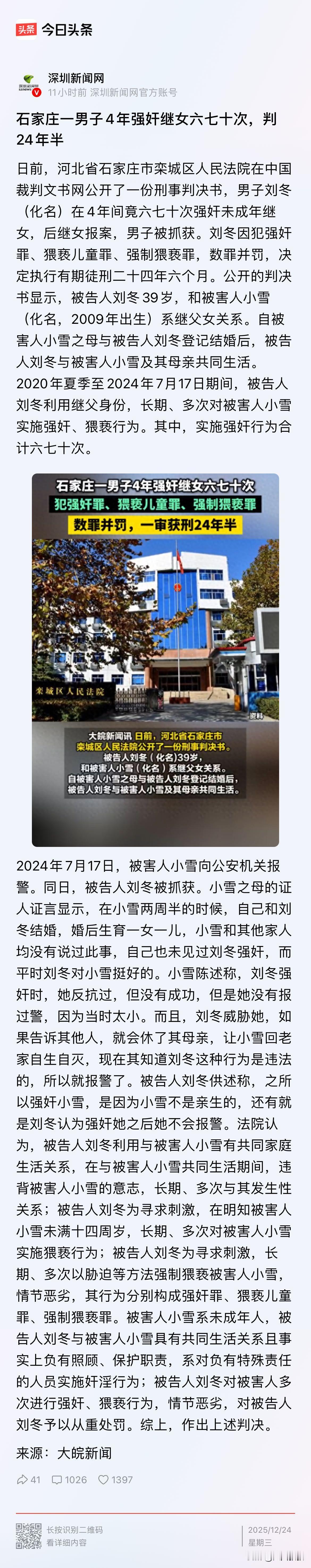河北石家庄,一男子和一带娃女子结婚后,男子想着反正孩子不是自己亲生的,于是便多次对女孩实施侵犯,四年的时间,男子共计侵犯了女童六七十余次,最终女童选择了报警求助,男子获刑24年半。 据悉,孙女士带着年仅两周半的女儿小雪,再婚嫁给了男子刘某,起初,刘某对小雪也是视如己出,但是,结婚后,孙女士和刘某又生了一儿一女,所以,刘某便对这个继女的态度慢慢发生了变化。 在2020年的夏天,也就是小雪11岁的时候,刘某第一次将手伸向了小雪,虽然小雪试图反抗,但是在刘某的威胁下很快就丧失抵抗了。 就这样,从20年到24年间,刘某总共侵犯了小雪六七十余次,随着小雪慢慢长大,小雪知道这样做是违法的,虽然被刘某威胁,自己从来没有跟母亲说过这件事情,但是,小雪还是鼓起勇气告诉了表姐,表姐听闻后头都炸了,当即选择了报警。 很快,民警就把刘某抓获归案,面对讯问,刘某竟然表示反正孩子不是亲生的,侵害之后她也不会报警。最终,刘某获刑24年6个月。 事发后,有人说,不知道这个做妈的是怎么做的,这么长的时间,一点也没发现,真的是不可理喻,是不是母亲知道还阻止过女儿? 也有人说,女孩太可怜了,2周的时候就跟着母亲走了,不幸还摊上这么一个继父,不知道女孩以后会怎么样,但是这种噩梦的经历估计一辈子都忘不掉的。 还有人说,24年6个月这也轻了,最起码无期徒刑或者是死刑,就算不是死刑立即执行,缓期执行也好。 其实,按照刑法的规定,除了无期徒刑之外,刘某获刑24年6个月,已经在有期徒刑的上限附近徘徊了。 那么,为何刘某是被判了有期徒刑,而不是无期徒刑或者是死刑? 按照刑法237条规定,猥亵儿童罪的上限是15年,所以,如果实施了这一个犯罪,那么,单个犯罪的处罚上限就是15年。但是,因为这个罪名是复合罪名,即如果对一个受害人实施侵害的时候,受害人不满14周岁,但是等过了几天,受害人过了14岁生日,加害人再次侵害的,那么这就是两个罪名了,而不是一个罪名。 即加害人的行为分别构成猥亵儿童罪和强制猥亵罪,虽然此时的受害人是一个人,但是因为涉及到14周岁这个问题。 而按照刑法236条的规定,性侵情节恶劣的,侵害不满10周岁的,造成受害人死亡、重伤的,这种情况下,是可以判处十年以上有期徒刑,无期徒刑或者是死刑的。 本案来看,刘某侵犯小雪的时候,小雪是11岁,不符合不满10岁这个情况,加上也没有导致小雪重伤死亡的情况,充其量因为次数多,刘某的行为也会被认定为情节恶劣,只有这一种情况下,刘某才会获刑10年以上。 据此,法院以QJ罪判处刘某有期徒刑15年,猥亵儿童罪判处9年9个月,强制猥亵罪判处9年9个月,最终数罪并罚获刑24年半。 其实,但凡小雪的亲生母亲多关注一下女儿,也不至于女儿被继父连续侵犯4年,这4年的时间,一定是小雪最黑暗的时间,此时,相关部门也要做好对小雪的帮扶工作,让其尽快走出这段黑暗的时光。 正是因为本案发生在近亲属之间,虽然是继父和继女,但是在法律上属于拟定的亲属关系,在这种父女关系下,父亲亲近女儿,其实很难认定也很难发现是猥亵的,当然,对于孩子母亲,重组家庭之后,也要负担起照看女儿的职责。 对此,你对本案有什么看法? —————————— 关注我,带你评析法律热点,关注冷暖人生。 文章原创,抄袭必究