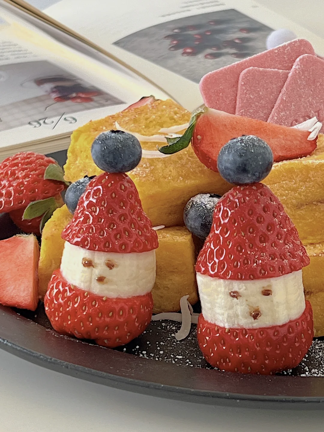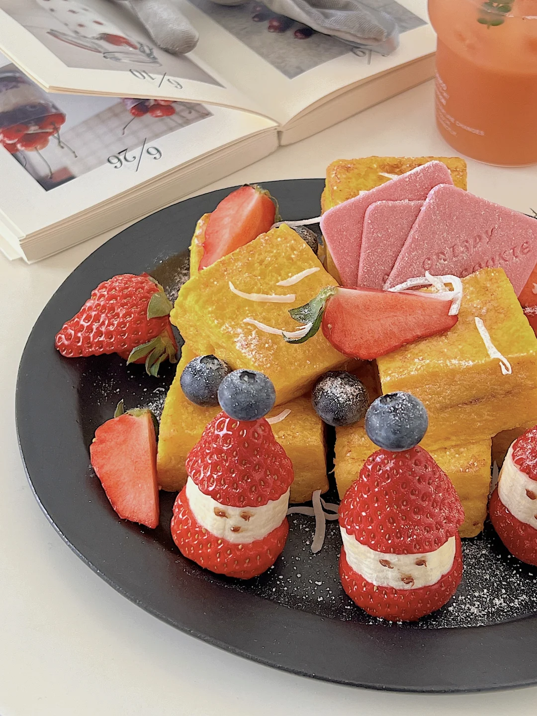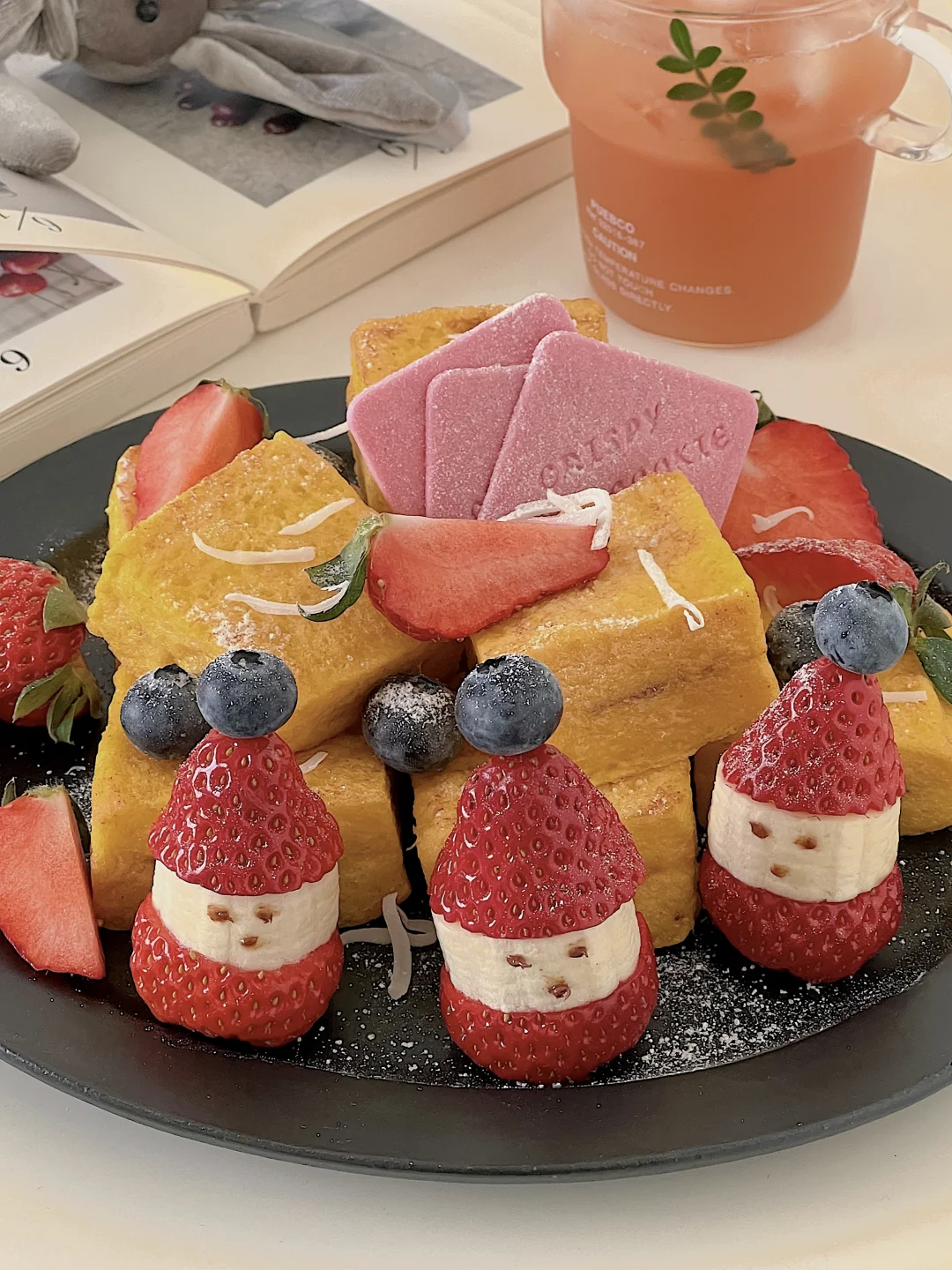 有圣诞老人守护的西多士,节日氛围拉满了 做法: ✨每片吐司去边,再切成四块,一共用4块吐司 ✨把榛子酱涂在吐司上,用另一片吐司合在一起 ✨2个鸡蛋加牛奶打散,组装好的吐司蘸上蛋液 ✨黄油加热,小火慢煎吐司,记得轮流翻面观察 ✨草莓从中间切一刀,香蕉放在中间,用牙签串起来,放上一颗蓝莓 ✨所有做好后,摆盘,用草莓和蓝莓点缀,撒上糖粉 再来一杯饮品🥤 12月的快乐一直延续,圣诞节还没到,迫不及待启动圣诞下午茶了~好幸福☺️