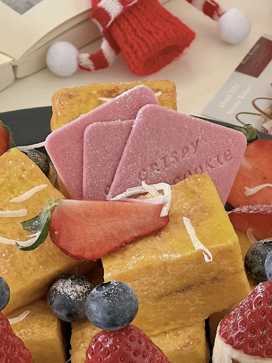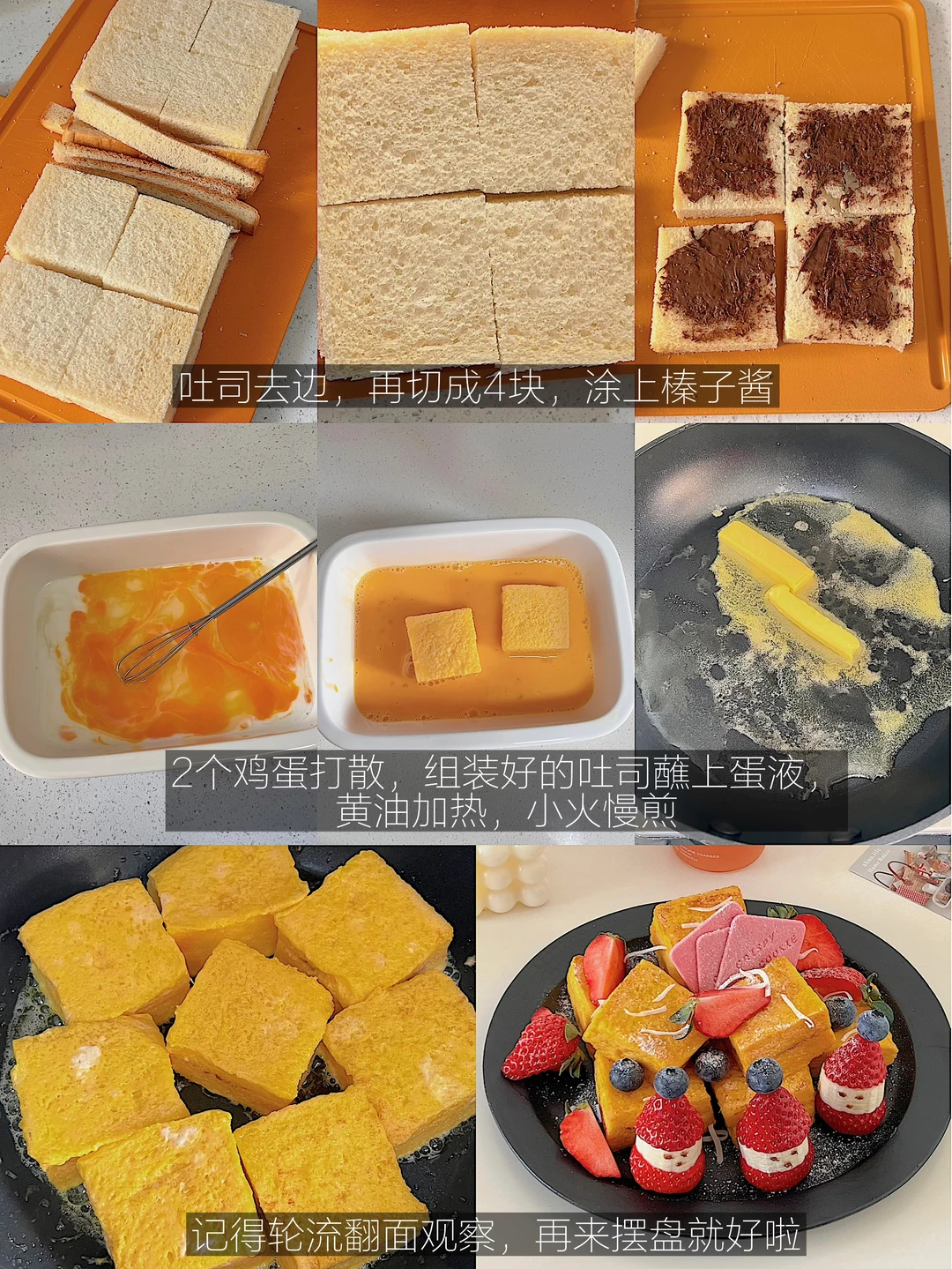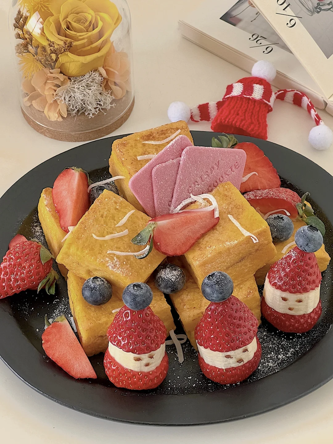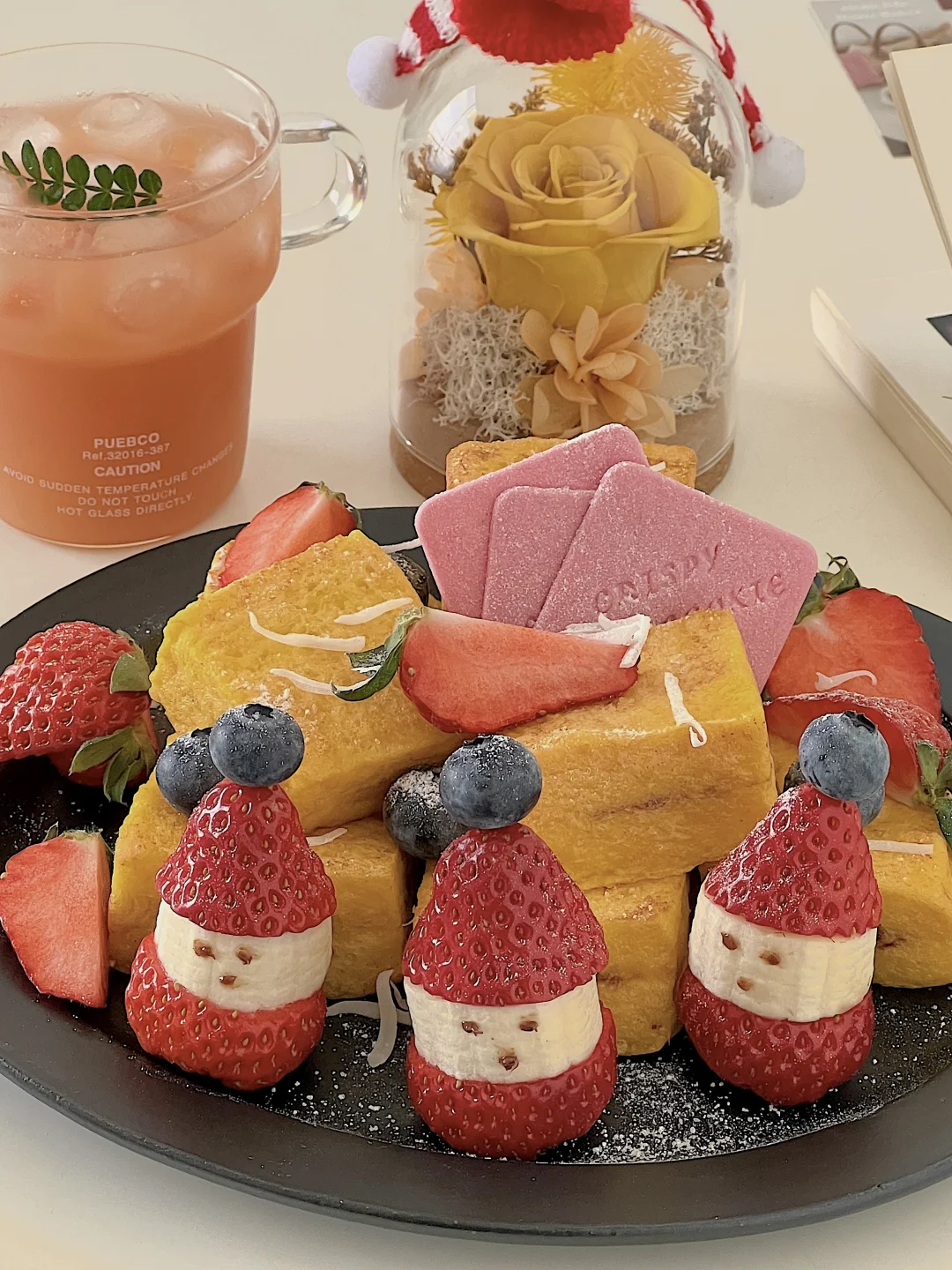 有圣诞老人守护的西多士,节日氛围拉满了 做法: ✨每片吐司去边,再切成四块,一共用4块吐司 ✨把榛子酱涂在吐司上,用另一片吐司合在一起 ✨2个鸡蛋加牛奶打散,组装好的吐司蘸上蛋液 ✨黄油加热,小火慢煎吐司,记得轮流翻面观察 ✨草莓从中间切一刀,香蕉放在中间,用牙签串起来,放上一颗蓝莓 ✨所有做好后,摆盘,用草莓和蓝莓点缀,撒上糖粉 再来一杯饮品🥤 12月的快乐一直延续,圣诞节还没到,迫不及待启动圣诞下午茶了~好幸福☺️
