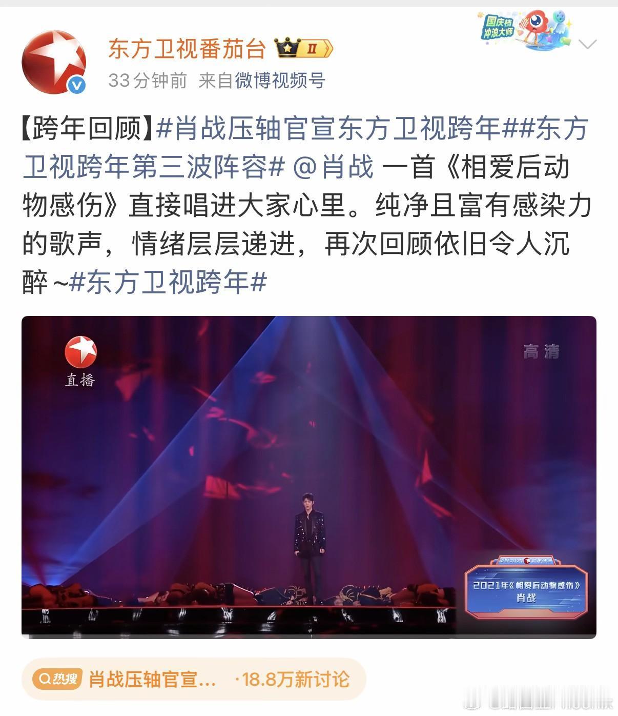 肖战官宣压轴东方卫视跨年,全网一片欢腾,业内称肖战这种唯一的没有任何限定词的压轴宣传方式,是艺人商业价值达到断层级别时,平台主动适配最高规格的表现[赞][赞]肖战值得最好的