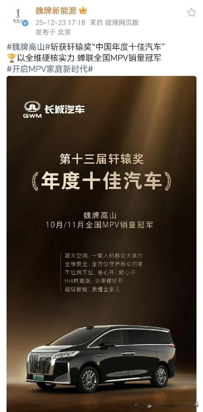 魏牌高山这次彻底给魏建军长脸了! 魏牌高山斩获第十三届轩辕奖“中国年度十佳汽车”,以全维硬核实, 蝉联10月/11月全国MPV销量冠军!还有人说魏建军不干事实吗?拿奖项堵住喷子的嘴,拿销量打肿黑子的脸。 魏牌高山是长城旗下中大型智混四驱MPV,提供高山7(车长5.05米)、高山8(5.28米)、高山9(5.4米)三款尺寸车型,覆盖28.58万-35.38万价格带。主打家庭与商务双场景,其中高山7主打家庭灵活出行,高山9侧重商务豪华! 10月魏牌高山销量9928辆,稳居国内MPV销量榜首! 11月魏牌高山销量10416辆,稳居国内MPV销量榜首! 数据就是这么朴实无华,魏牌高山行不行,销量说明一切! 要我说,魏总做的最正确的决策,不是发展了Hi4混动系统,也不是发展硬派越野坦克,而是决心打造商务车魏牌高山!你们觉得呢?