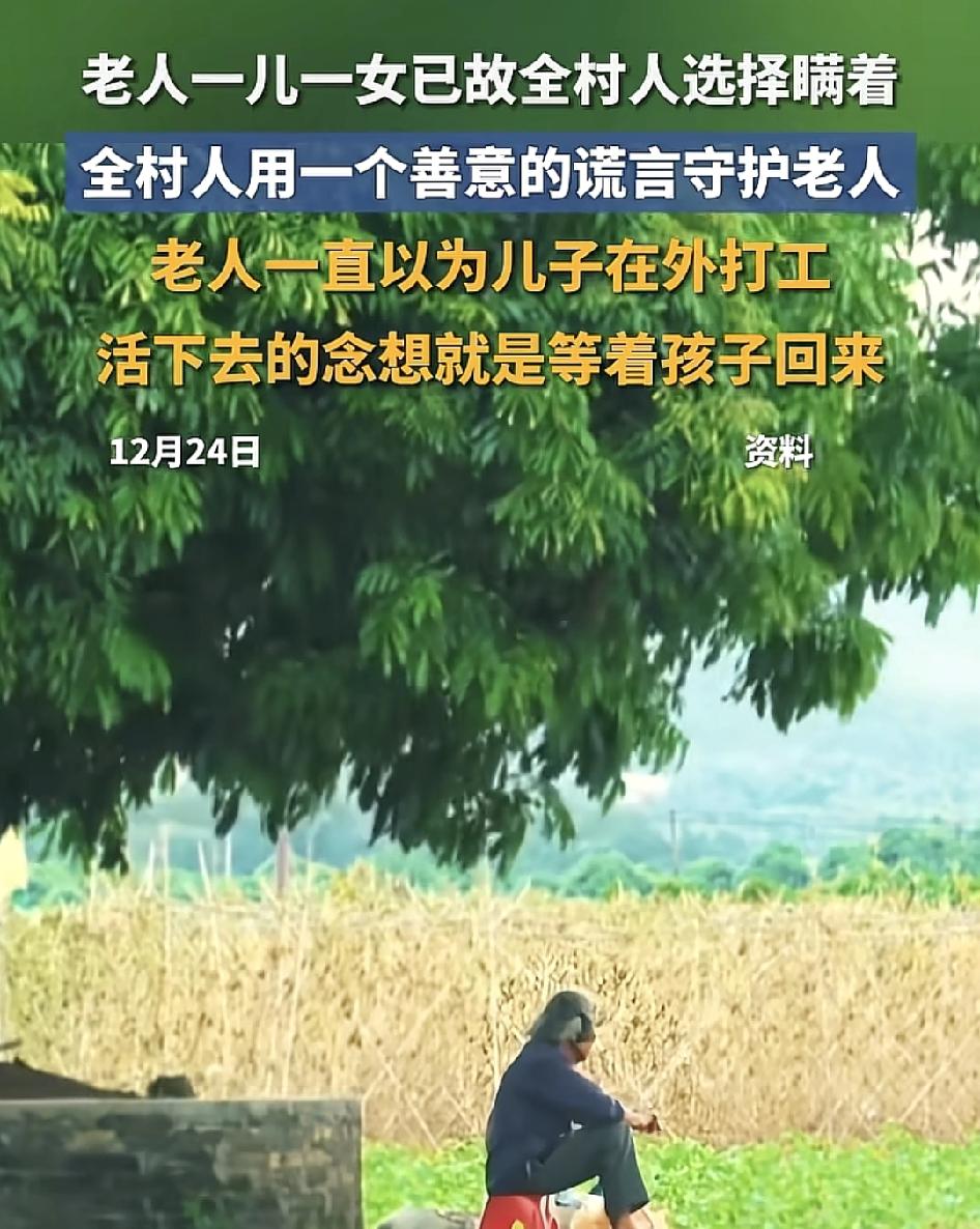 山东新泰一位独居老人。其一个儿女和一个儿子都已经去世,但村里的干部和其他村民因为担心老人的身体,一直都没有告诉她,小人一直以为儿女都在外地工作,从年头盼到年尾,就是希望儿子回家,村支书一直都会看望老人,村里的人也配合着瞒着老人。这是多么善意的谎言。