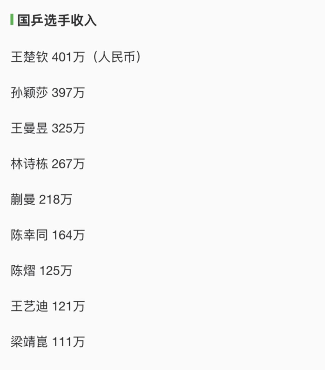 国乒年收入总结,王楚钦奖金第一,全是实力和努力,孙颖莎第二位,优秀! 努力一年到头,发现累死累活打满比赛,还没有一场代言来的快,但是这是他们的看家本事,也是饭碗,比赛和训练都全心全意,品牌方看到了他们的实力,可靠,人品信得过,偶像也是有区别的,选择他们就是看重,肯定!