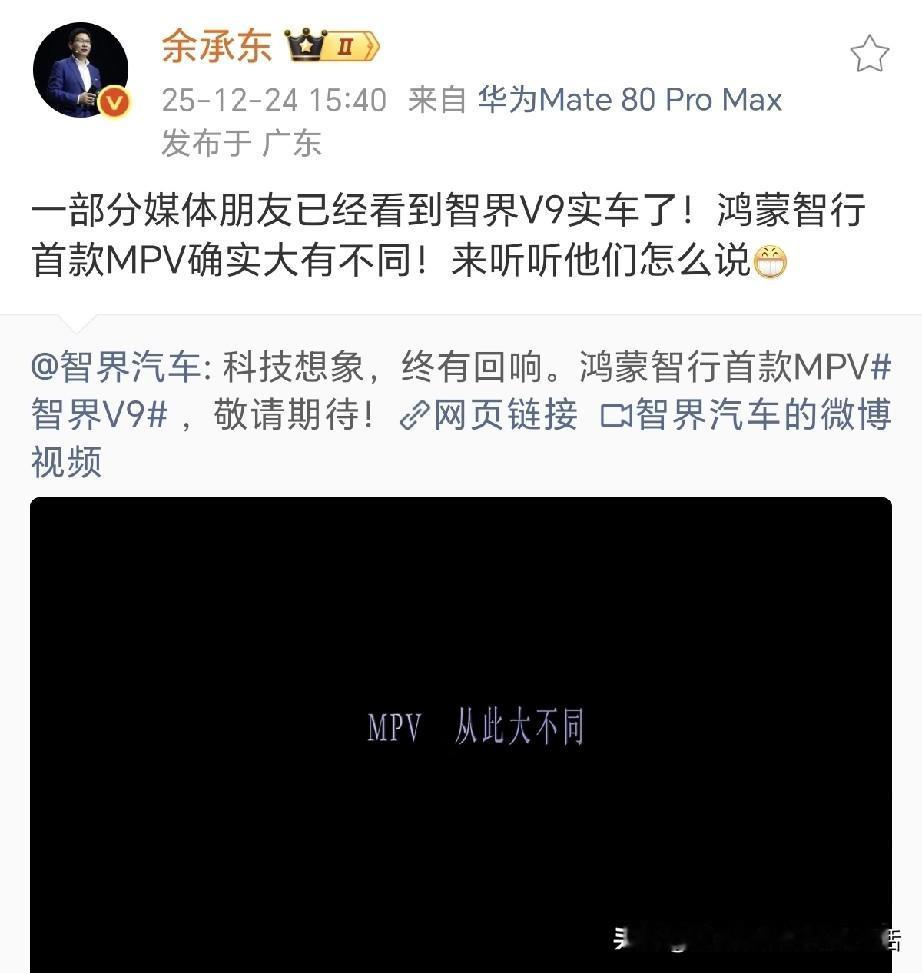 余承东:MPV从此大不同,鸿蒙智行首款MPV确实大有不同! 鸿蒙智行首款MPV,智界V9发布了一条视频,是一部分汽车博主看到智界V9汽车后对它的评价! 大胖子南哥说我买了那么多MPV,智界V9满足了我对所有MPV功能产品也的需求的一台终极的MPV。 压轴的是闫闯,他说我觉得V9可以在MPV在2026年会有一个颠覆性的现象。 很奇怪,居然没有看到韩路,还有陈震,他们的影响力,不比他们厉害多了呀! 其实大家心里跟明镜似的,最想听听余总怎么说,你们说对不对?