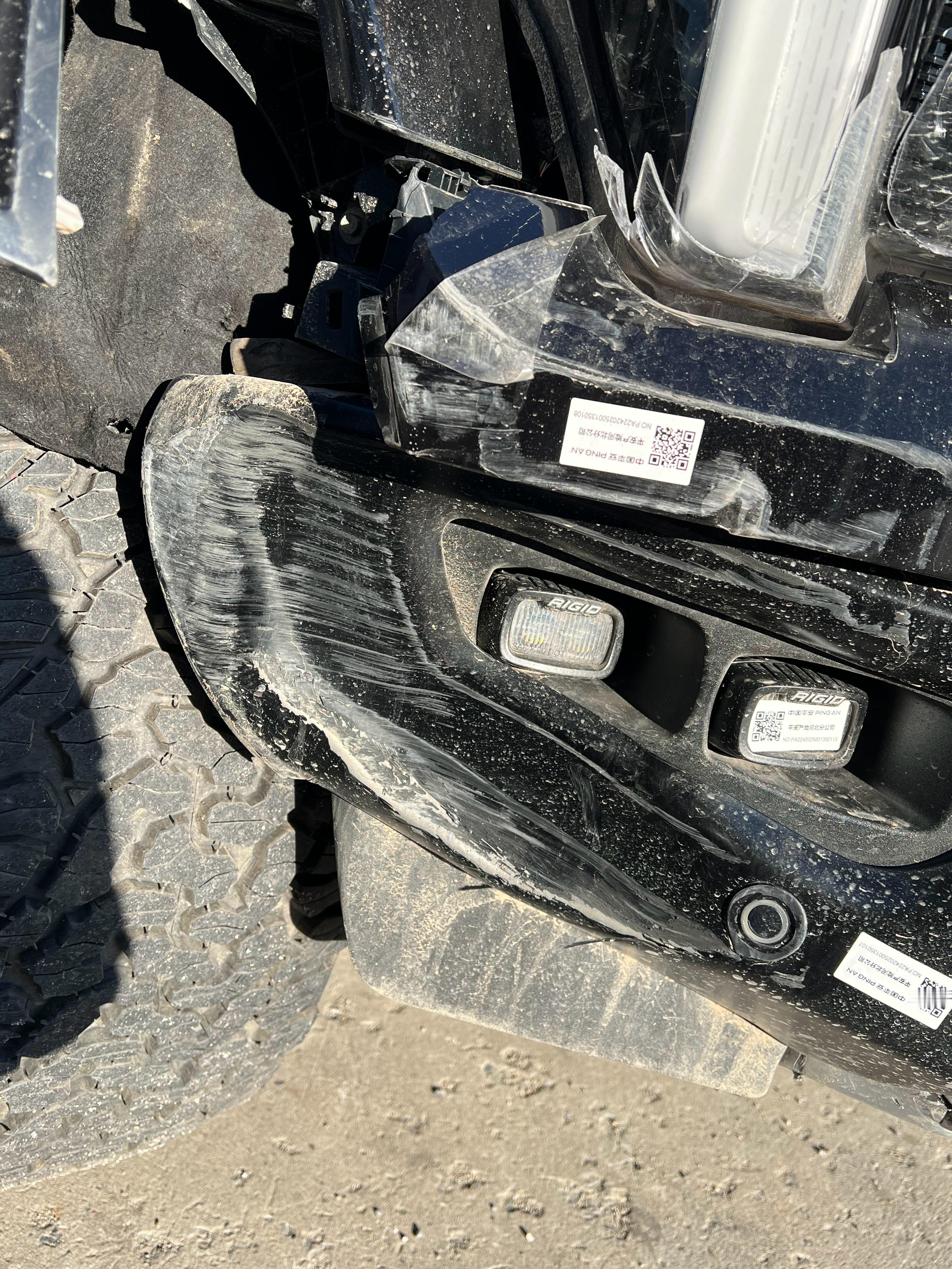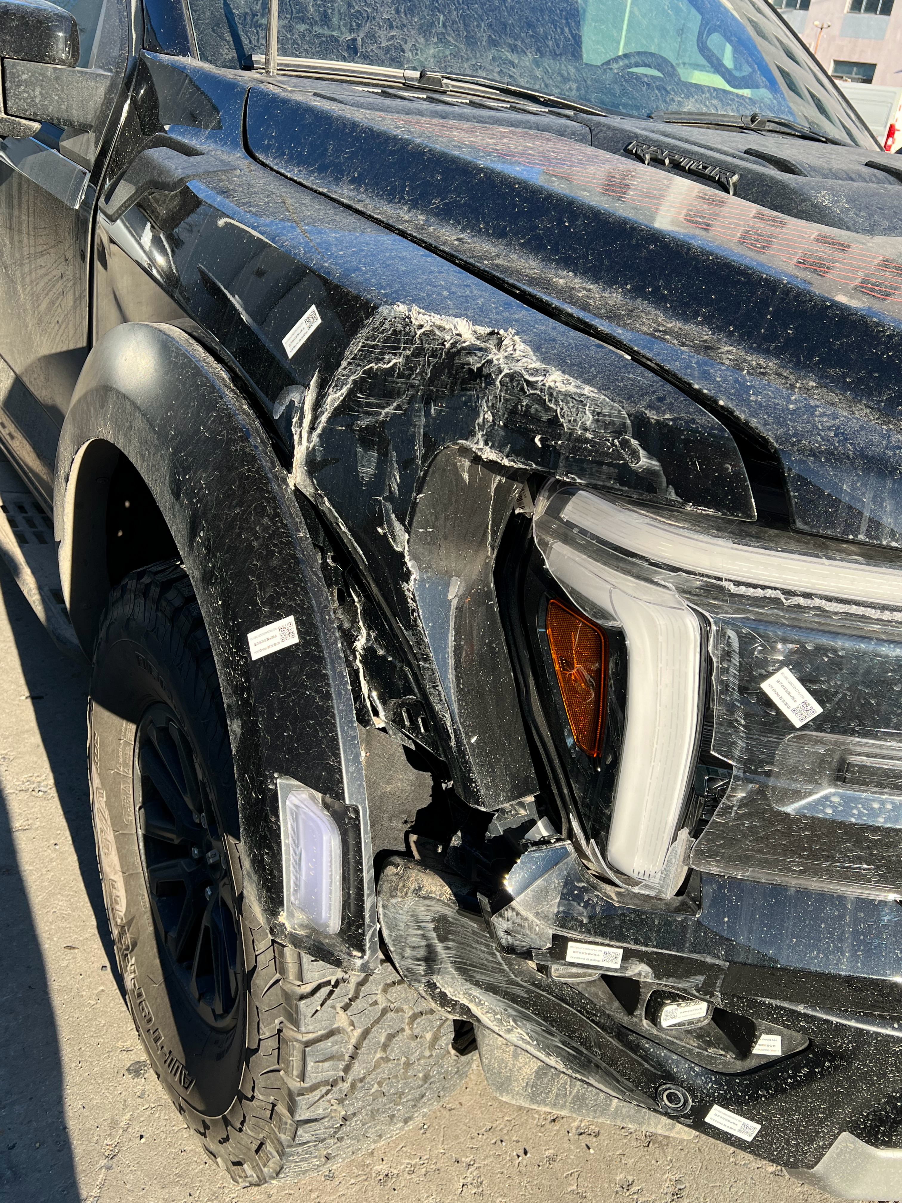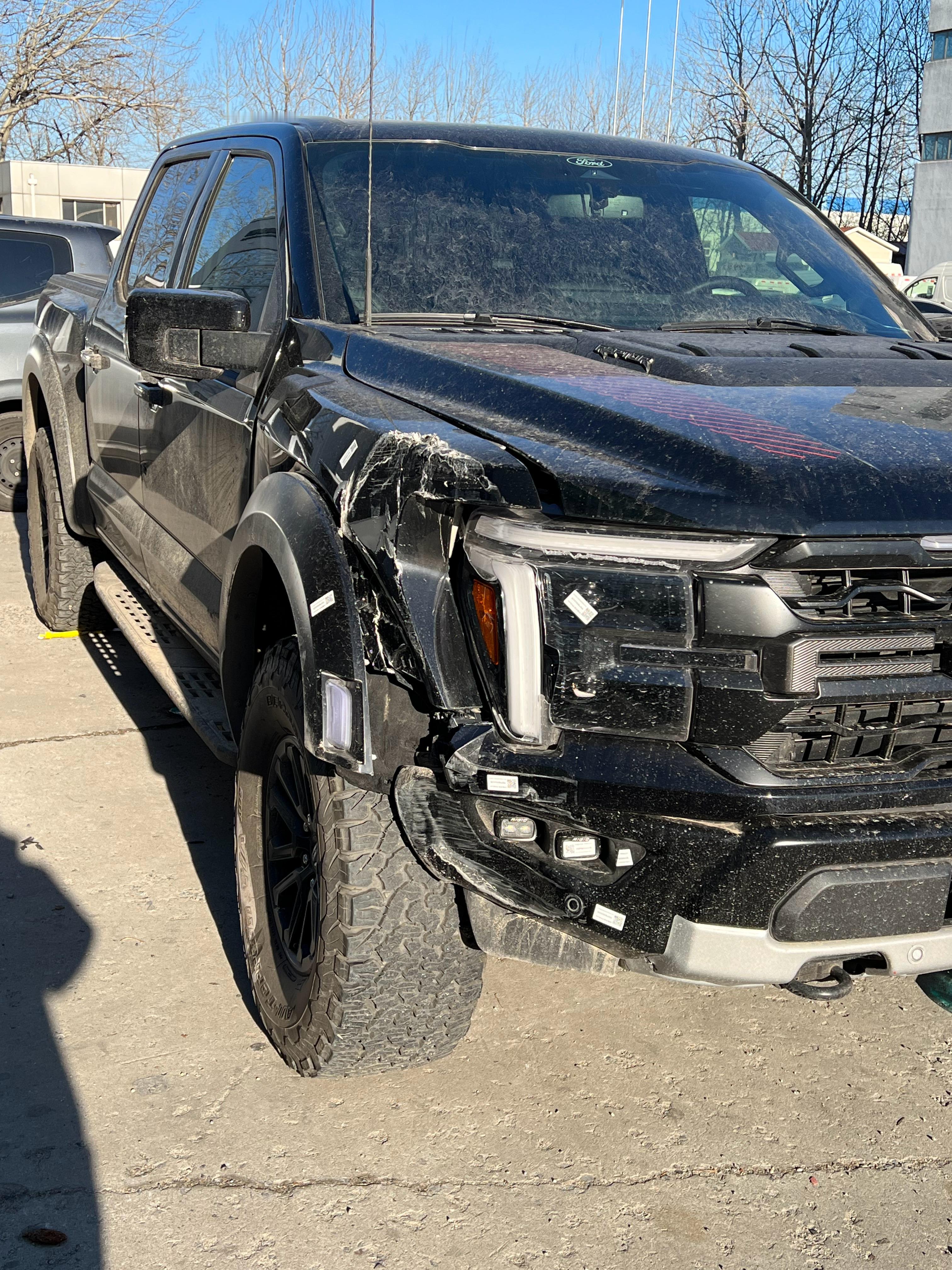 大新F150猛禽,撞了撞击力度还不小,底下的钢制保险杠都变形了这些皮卡和美式全尺寸,车宽都两米多宽,估计车主还不太适应这种大车没想到这个翼子板居然是复合材料的,可能是为了减重吧,其实普通版的F150已经很轻了,用的是铝车身。 天津·中国天津自由贸易试验区