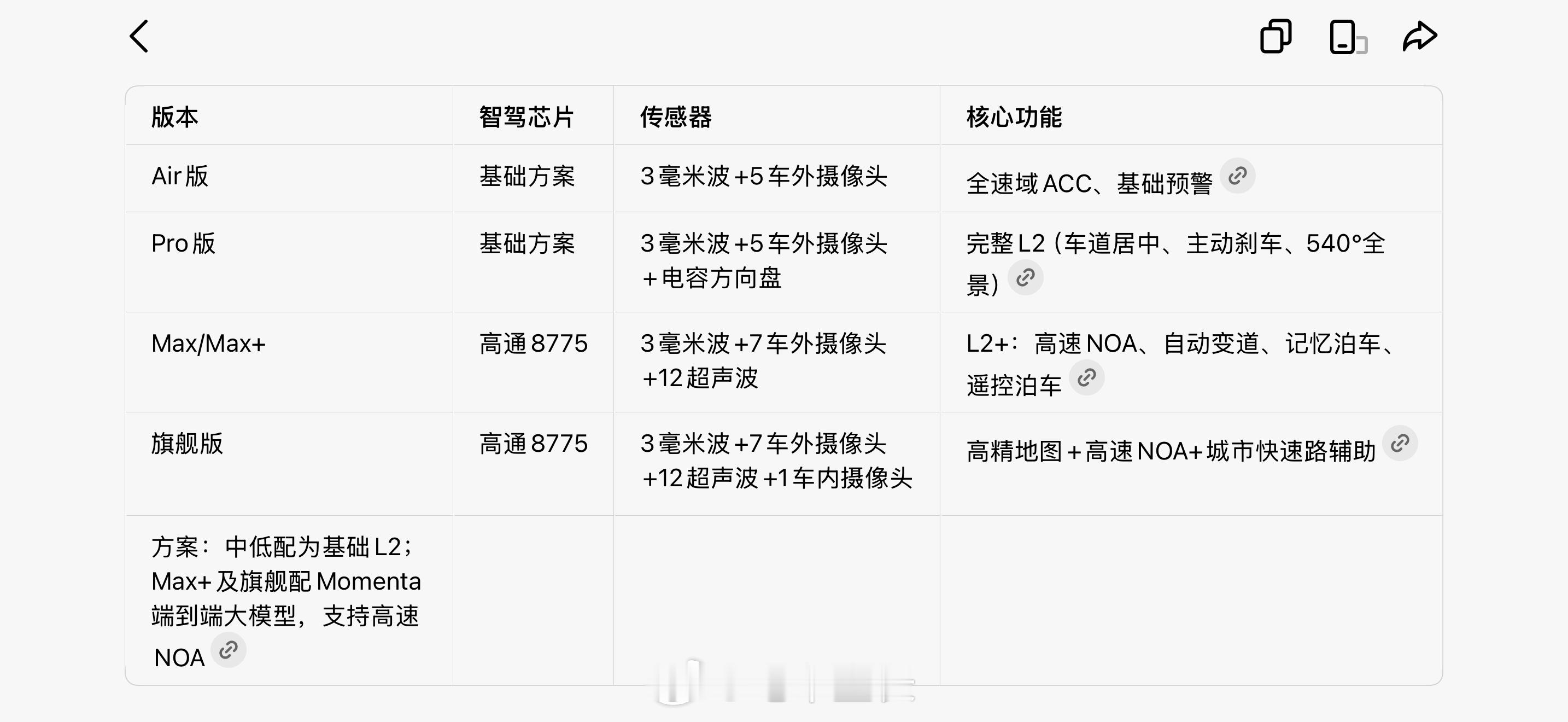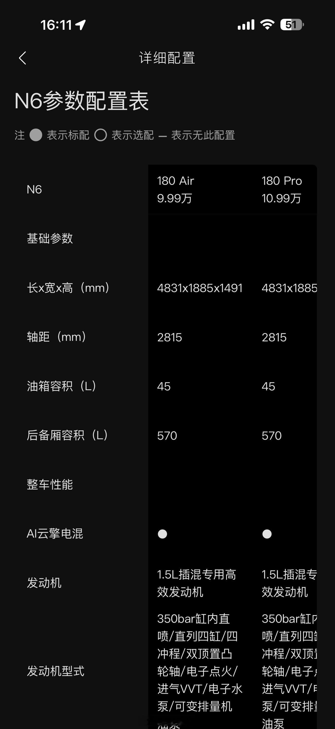 根据兄弟们的投票,在看东风日产N6的配置了,一会儿下单。N6分为Air,Pro,Max,Max+多个版本,定价9.99-12.99万。车长还能做到4831,轴距2815,空间和灵活度应该还可以,长测之余,适合做我们的工作车。1.5L的发动机配备混装电池包,中低配瑞蒲兰均21.1,顶配宁德时代20.3度,都是磷酸铁锂电池。CLTC纯电续航报了个170-180公里,等我提车测一下。车机芯片8155(有点落后了),还有8775。扬声器数量低配只有4个车内的,这个低配直接可以淘汰了。但是他们这个APP真的难用,我还得辅助懂车帝和豆包来看配置。如果旗舰的辅助驾驶是最好的,那就买Max+旗舰版吧。