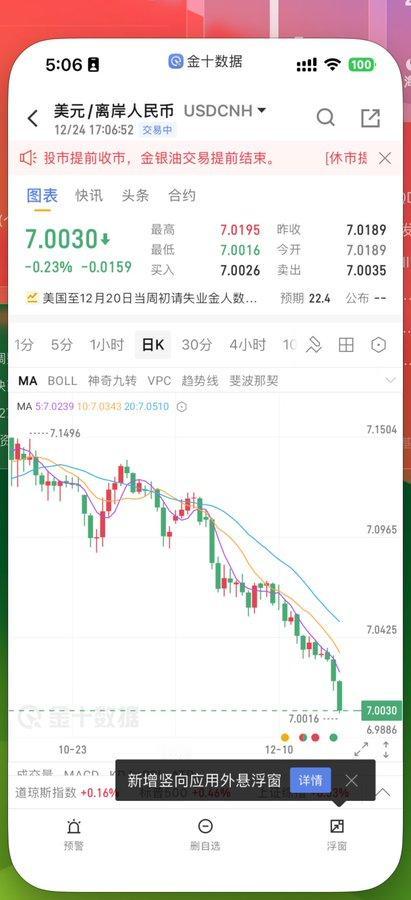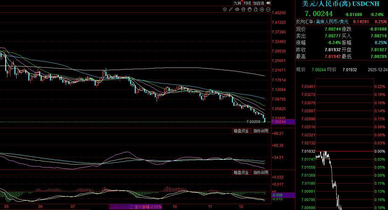 人民币汇率即将破7! 今日人民币汇率继续大涨,最高已经到7.00142,距离破7只有一步之遥。 美联储2025年降息周期已确立,市场预期2026年进一步宽松,美元指数缺乏持续反弹动力。非美货币集体升值,人民币受益明显。 中间价连续多日小幅上调,释放“允许温和升值”的信号,同时通过离岸央票等工具控制升值节奏,避免过快冲击出口竞争力。