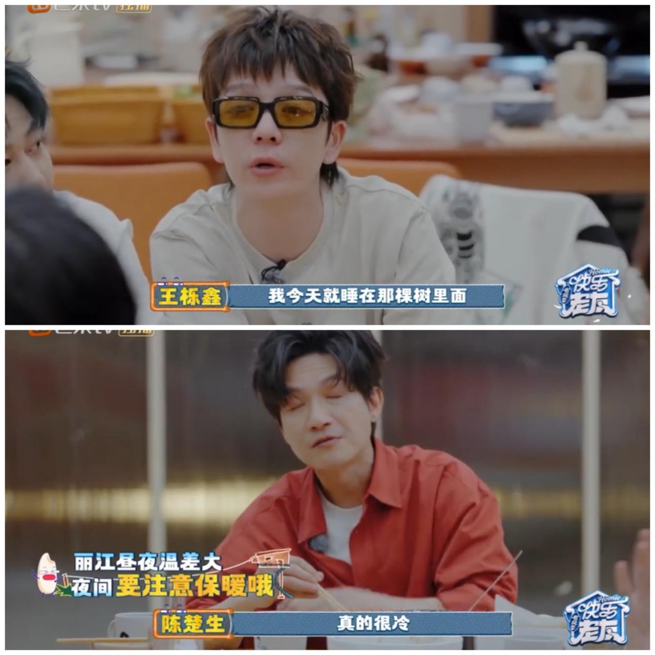 陈楚生对着王栎鑫 叨叨个没完, 陈楚生对待儿子 大概就是这样的吧。 王栎鑫录制新综艺, 所住房子的楼梯是螺旋向上的, 陈楚生走在上面, 一直絮絮叨叨的 温馨提示王栎鑫 晚上回家注意安全, 不要把自己绕晕了。 王栎鑫晚上想睡室外树屋, 完成儿时的梦想, 陈楚生担心他着凉感冒。 其他成员建议他记得拿睡睡袋。 陈楚生44岁, 王栎鑫36岁, 陈楚生面对王栎鑫的各种“幼稚”行为, 忍不住各种“温馨提示”, 也许他平时对待儿子也是这样的吧, 忍不住的各种关心与担忧。 王栎鑫虽然是两个孩子的爸爸了, 依然童真满满, 似乎不够稳重。 张远也是梦想住在童话一样的房子里, 内心似乎总是长不大的样子。 面对这样一群充满童真的弟弟, 陈楚生这个大哥有操不完的心呀