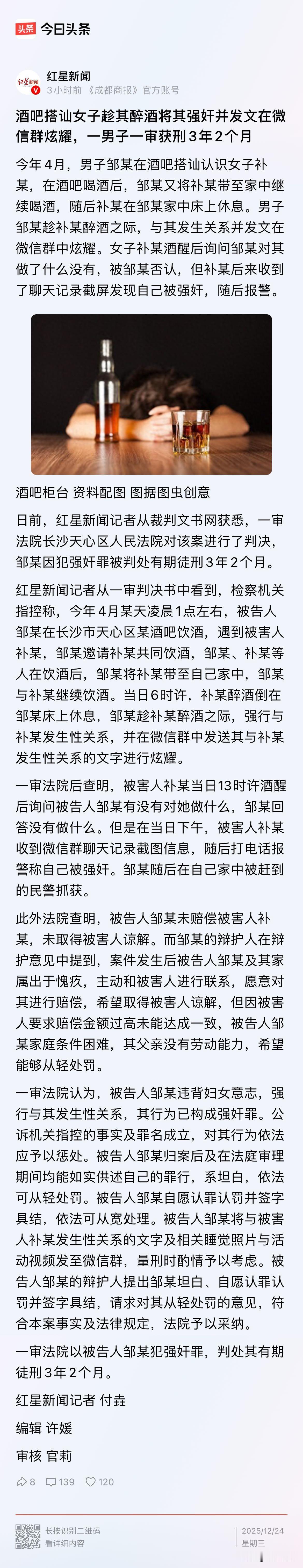 湖南长沙,一男子去酒吧喝酒时认识了一女子,两人相谈甚欢,共同饮酒后,男子把女子带回了家继续喝,喝到凌晨后女子醉酒直接睡在了男子的床上,男子趁机与之发生了关系并拍摄了不雅视频,等女子醒后询问男子对自己做了什么,男子矢口否认,结果事后女子竟然收到了别人给自己发的男子炫耀的视频,随后便报了警。 男子邹某平时的时候喜欢去酒吧喝酒,除了喝酒之外,邹某还有一个目的就是想发设法搭讪一些女孩子,虽然屡遭拒绝,可是邹某却不以为然。 事发当晚,邹某再次来到酒吧点了一杯鸡尾酒,随后就坐在吧台上听歌,这时候,女子补某也正好来到吧台点了一杯酒,邹某趁机举杯,隔空和补某碰了杯。 补某见状也没拒绝,而是直接坐到了邹某身旁,两人便开始聊天喝起酒来。 可能是喝的不过瘾,邹某便邀请补某到自家继续喝酒,随后还给补某展示了自家的酒柜,随后,补某便跟着邹某去了他的家。 在邹某家中,两人继续喝酒,知道喝到了凌晨后,补某终于醉倒在邹某的床上,见着没有反应的补某,于是邹某便和对方发生了关系。 第二天下午醒来后,补某询问邹某对自己做了什么?不过邹某却矢口否认,表示两人什么都没发生,因为没有证据,补某也就没去追究 但是,就在当天傍晚,补某收到了朋友发来的聊天截图,原来,趁着自己醉酒,邹某竟和自己发生关系还录了像,事发后更是将录像发在了群聊中炫耀,随即补某选择了报警。 事发后,有网友说,这个炫耀什么,如果不去炫耀,估计什么事都没有,真的是自投罗网。 还有网友说,这个被抓一点都不冤,因为是趁着别人醉酒发生的,这在法律上就是犯罪行为,没什么可说的。 也有网友说,如果不发出去,这个事情估计就这么过去了,本来大晚上的跑去一个陌生男性的家里,想想都知道要干点什么才对。 其实,喝酒发生关系不可怕,关键是醉酒发生了关系,这就涉嫌犯罪了。 在法律层面,采取暴力、胁迫以及其他方式,违背受害人意愿,强行与之发生关系的,定为强奸罪。 本案中,如果证据能够反映补某是醉酒的,比如报警之后,对补某进行血液酒精含量检测,此时虽然是第二天了,但是,还是有可能血液中的酒精含量会很高的。 加上邹某将视频发在了群聊中,即此时补某醉酒不省人事,邹某与之发生的,那么这就是趁人醉酒之际与之发生关系,属于违背受害人意愿的情形,因此定为犯罪是没有问题的,最终,邹某要为自己的过错买单。 案发后,邹某家属想要联系补某希望赔偿获得谅解,但是补某要求补偿的数额远远超过了邹某家属心理预期,双方没有达成协议,最终因为没有拿到谅解,邹某被法院判刑3年2个月。 其实,站在旁人的角度来说,一个陌生女性在第一次见面后,就愿意和你一起回家喝酒,想想都知道接下来会发生什么,但是,你把视频发出去了,给人家造成的影响是很大的,人家反咬一口,也不是不可能,做人还是要低调,更不要以身试法去尝试犯罪。 对此,你对本案有什么看法? —————————— 关注我,带你评析法律热点,关注冷暖人生。 文章原创,抄袭必究