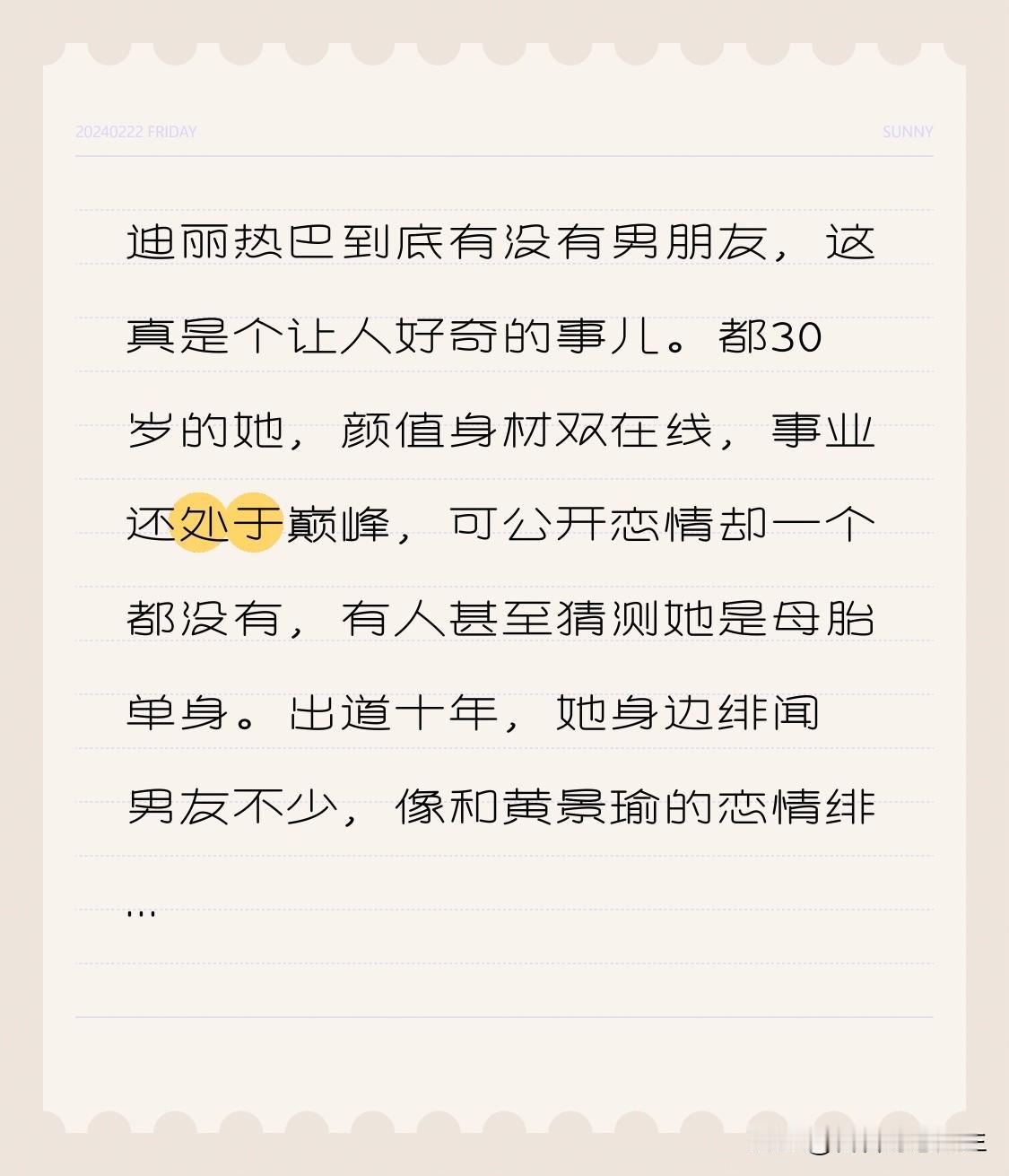 迪丽热巴到底有没有男朋友,这真是个让人好奇的事儿。都30岁的她,颜值身材双在线,事业还处于巅峰,可公开恋情却一个都没有,有人甚至猜测她是母胎单身。 出道十年,她身边绯闻男友不少,像和黄景瑜的恋情绯闻就闹得沸沸扬扬。2023年初她多次卷入恋爱、怀孕风波,工作室也没明确回应。1月有模特vlog曝光她在海外,当时正是怀孕风波曝光不久,而同期知情人爆料黄景瑜也在。不过这些都只是传闻,也许热巴现在一心扑在事业上,感情的事儿还得再等等。 🌹🌹🌹🌹🌹🌹🌹🌹🌹