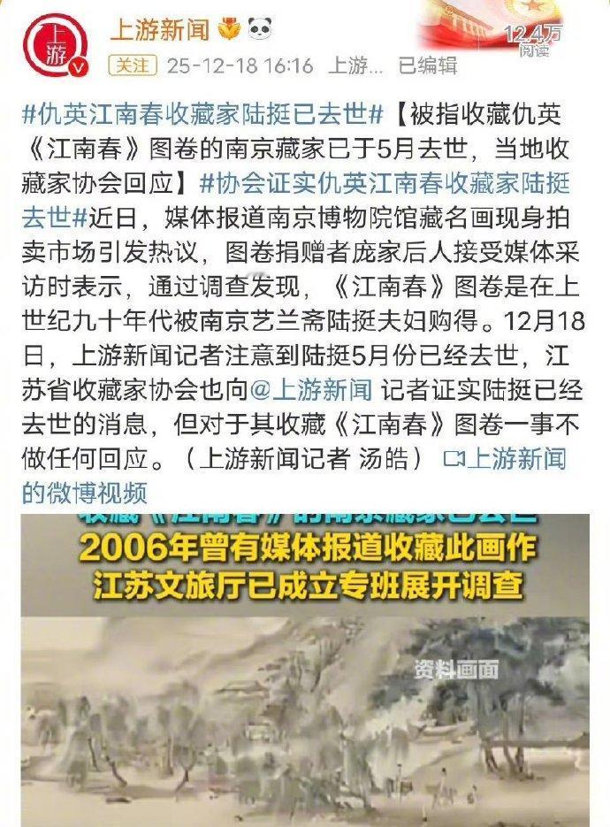 根据媒体报道,购买南京博物院的这幅《江南春》的收藏家陆挺(别号顾客)今年去世。相