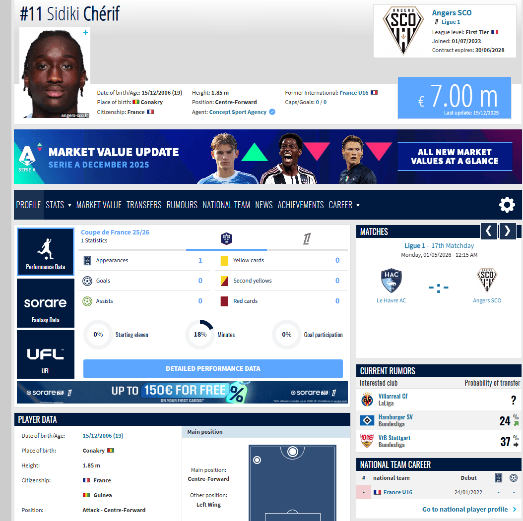 虎扑12月24日讯法国媒体巴黎人报著名记者BenjaminQuarez的最新报道,昂热将在转会市场上面临西迪基-谢里夫的争夺战。