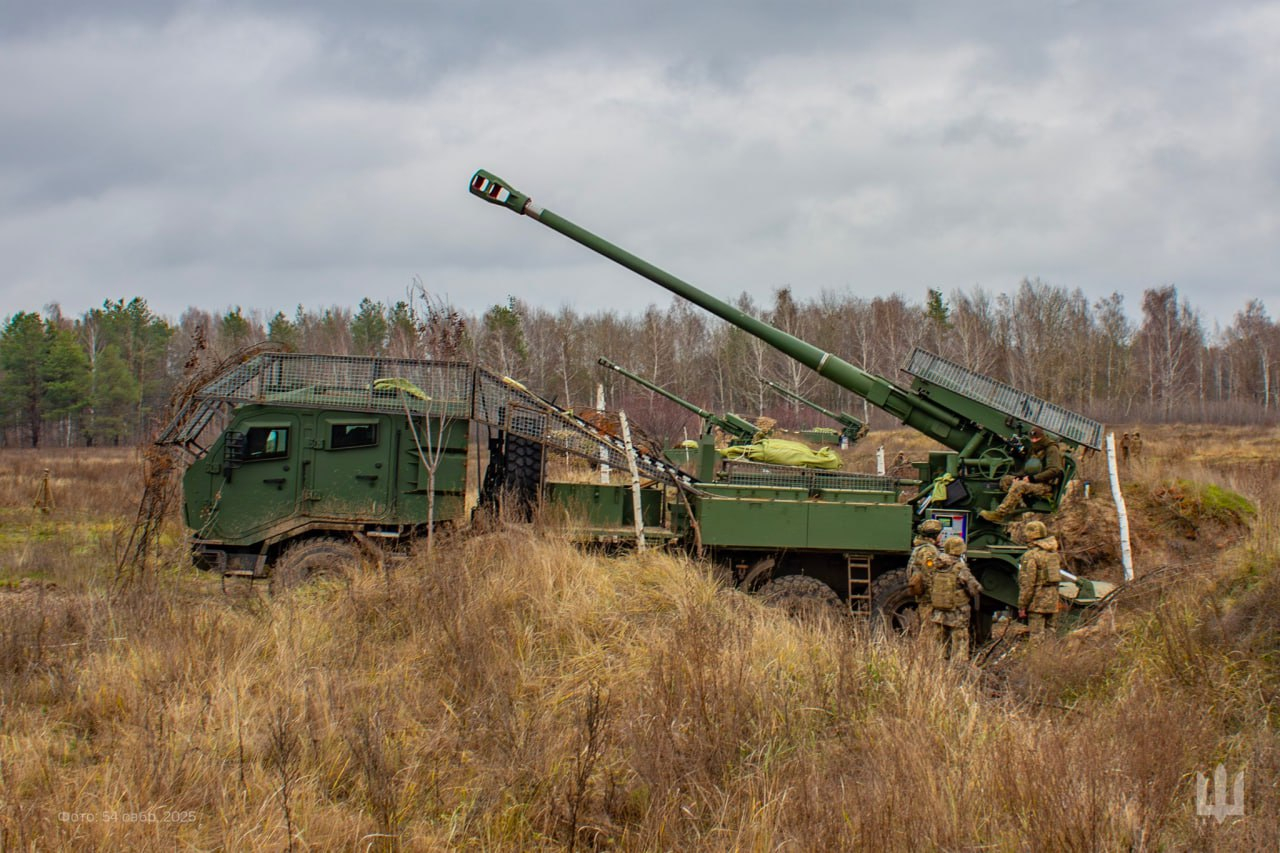 烽火问鼎计划每天认识一件兵器 乌克兰新组建的第54独立炮兵旅装备的2S22“博格丹娜”3.0型155毫米52倍径轮式自行榴弹炮,采用太脱拉T815-7T3RC1(8×8)卡车底盘,2025年11月。