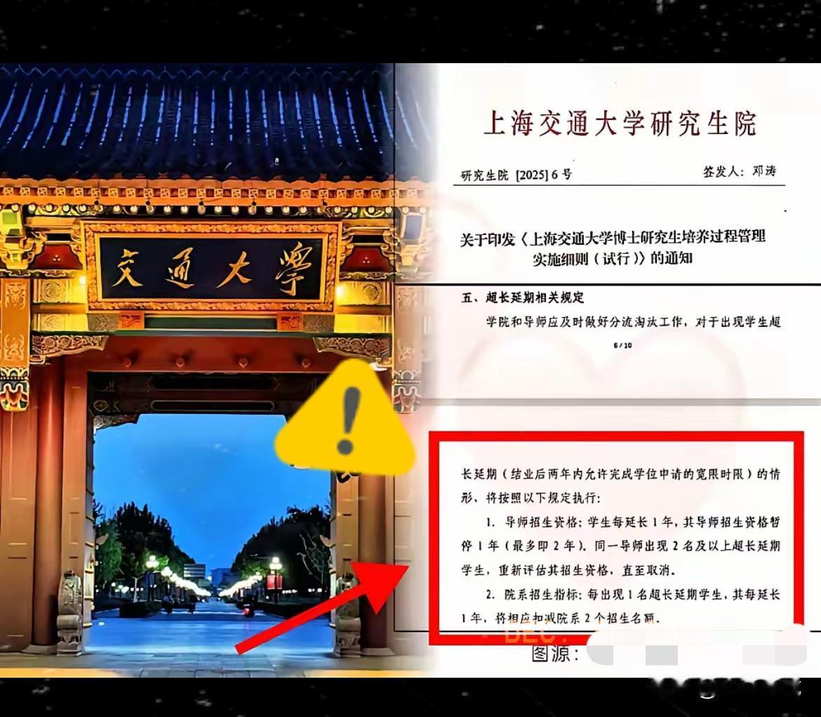上海交大这波操作太解气! 把学生延毕和导师“饭碗”绑死, 直接戳中了学术界的痛点! 多少博士生把青春耗在实验室,却成了导师接活赚钱的“免费劳工”,指导没多少,杂活一大堆,毕业遥遥无期。 就像那些延毕多年送外卖、为生计奔波的博士,他们的困境,很多时候是遇到了只“用人”不“育人”的导师。 学术不是生意,导师更不该是“老板”。 新规看似“狠”,实则是把“立德树人”拉回正轨——你不对学生的前途负责,就该失去招生的资格。 这不仅是给学生撑腰,更是在净化学术生态,让指导回归本质。 真正的导师,该是引路人而非压榨者。 你觉得这招能彻底根治“延毕乱象”吗?来评论区说说你的看法~交大专家 西北交大