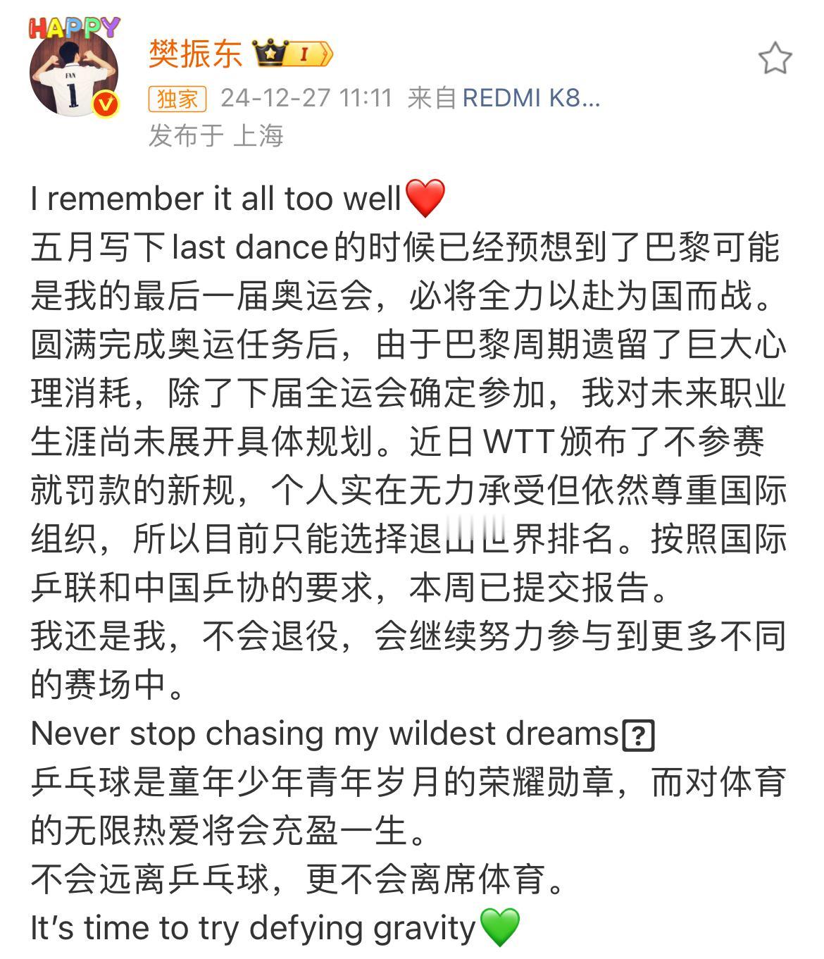 樊振东退出世界排名 成为无数球迷心中的意难平! 如今已时隔一周年, 再次回想此事, 相信许多人至今仍无法释怀。 那一年他拼尽全力, 为国乒守住男单金牌荣誉, 让国人继续为国球骄傲; 那一年他得偿所愿, 打下一场人声鼎沸的奥运会, 成就个人职业生涯大满贯。 也是从那一年起, 他成为无数国人心中的民族英雄。 他心中有爱眼里有光, 努力守护着自己那份热爱, 用梦想与执着, 搭载着那颗勇敢的心, 2025年在德国萨尔布吕肯俱乐部缔造了又一个辉煌! 这一年他征服了整个德国, 被德国媒体称之为“凯撒·樊”! 真英雄 既可以在满是繁花的狂野里绚丽绽放, 也可以在泥泞的荒诞中披荆斩棘!