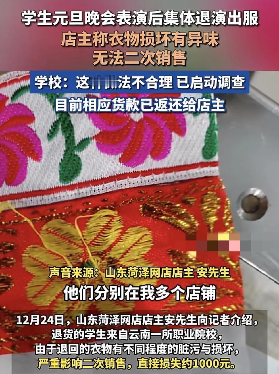 山东菏泽一家服装网店的店主称,他们收到一批来自云南职业学校学生的服装退货,16号学生院里学生收到货,18号就收到退货了,但是退回来的服装已经明显是勾丝,影响二次销售,店主也是在该学校。举办的元旦晚会上看到衣服跟自家的是一模一样的。有的服装还有狐臭味。学校称已经在调查到底是哪一些学生购买的衣服,这样的做法的确是不合理的。