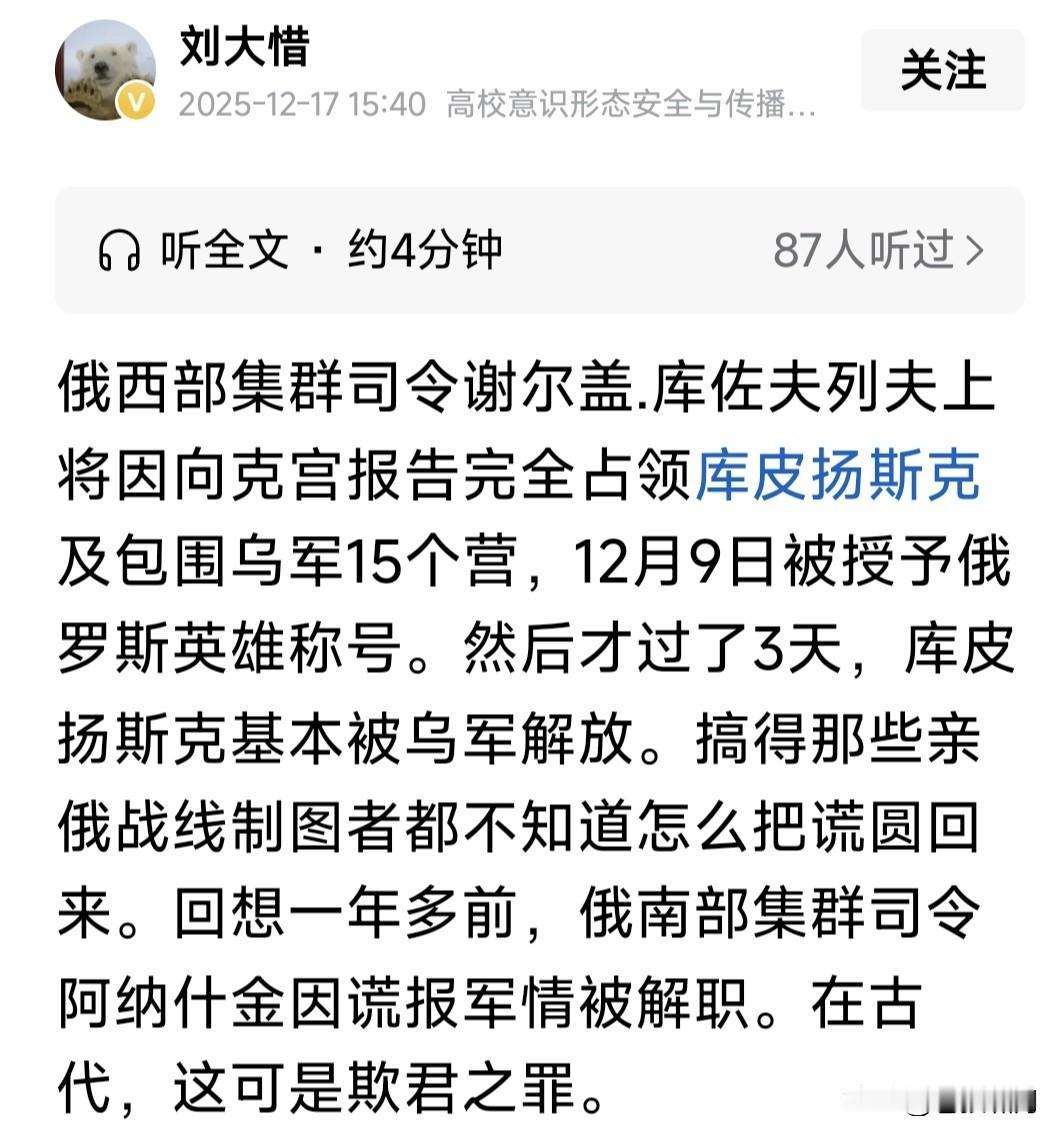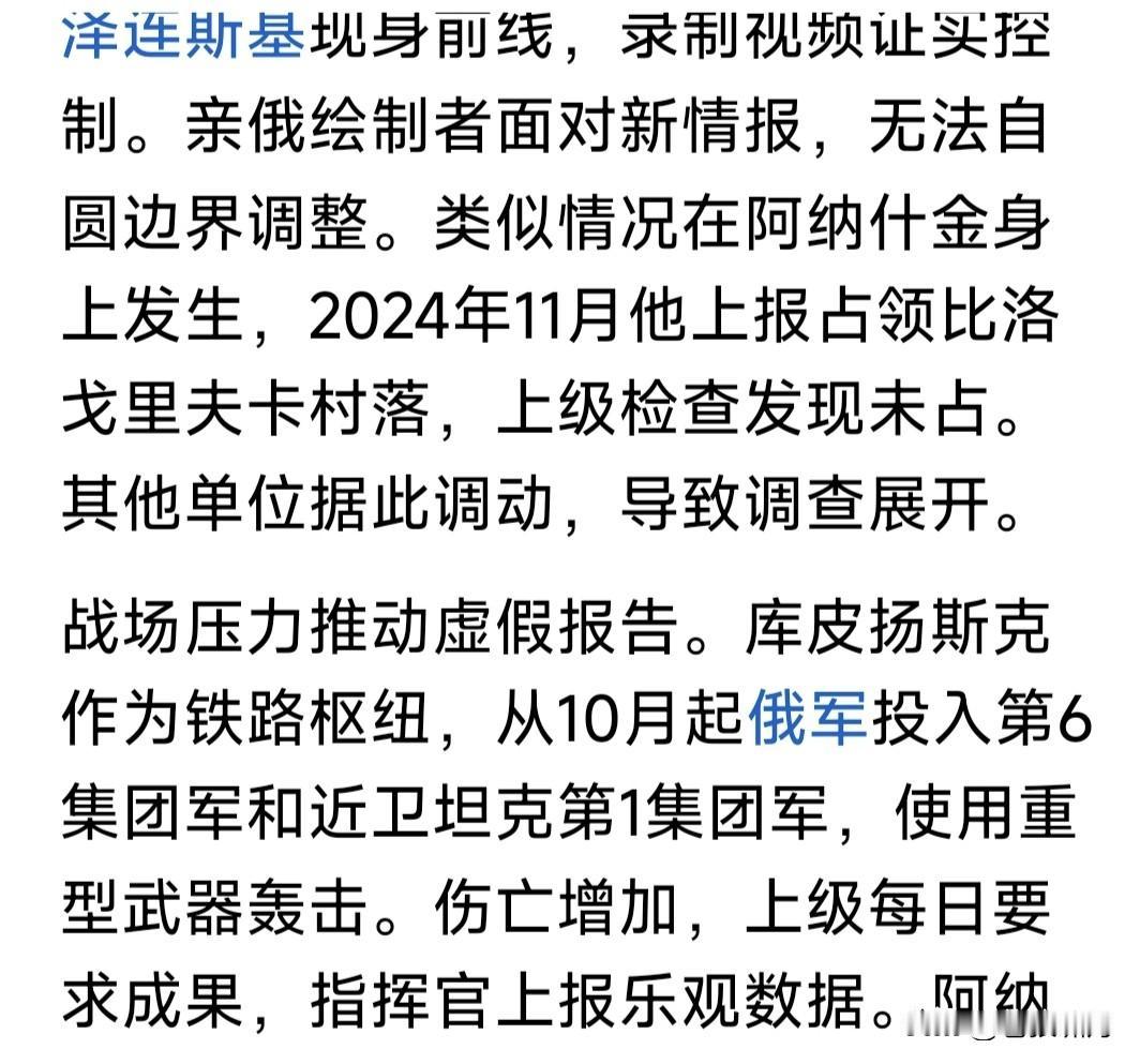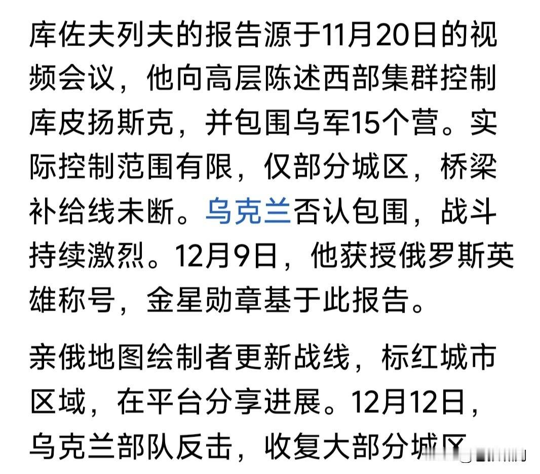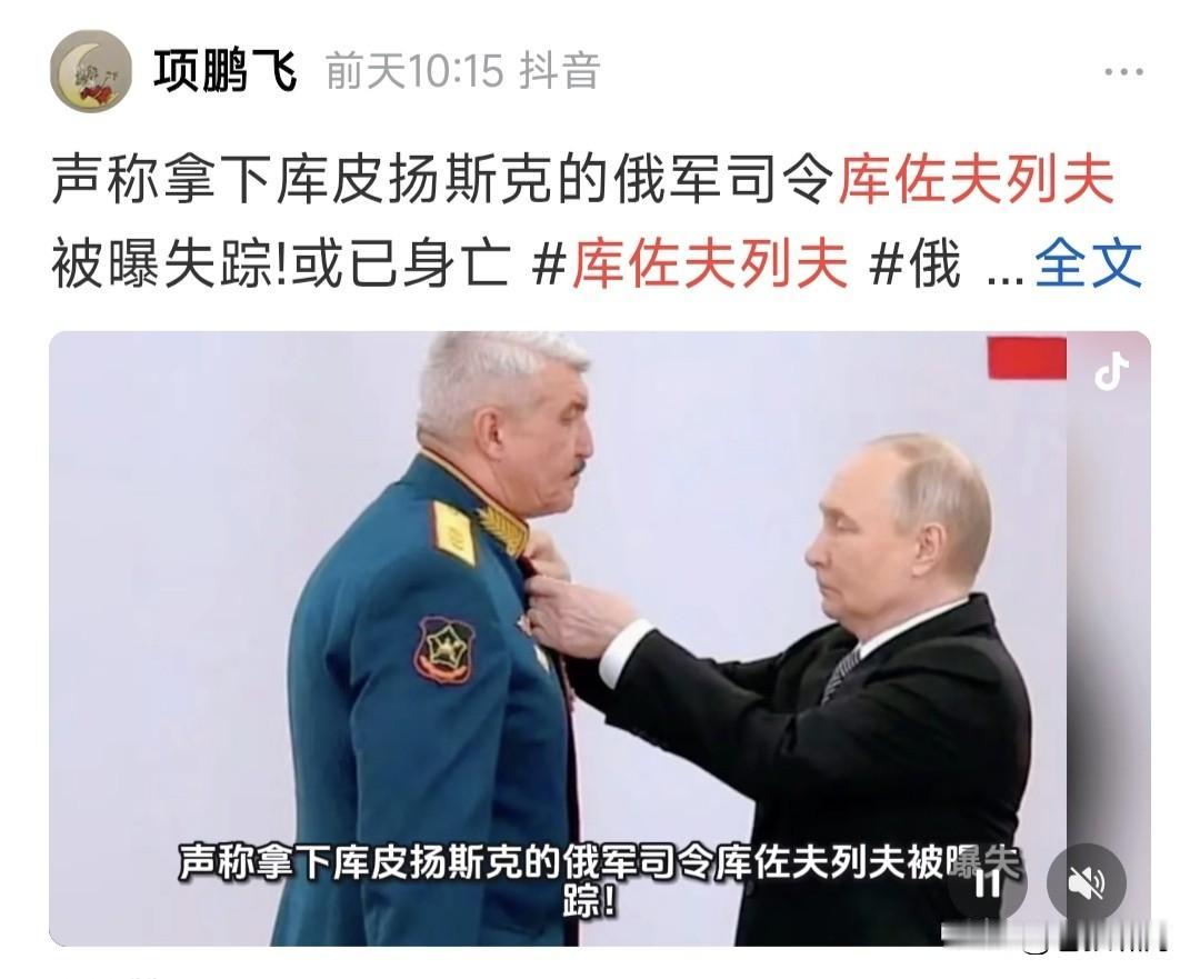 俄上将库佐夫列夫被爆“失踪”!其为俄西部集团军司令,曾于月初报告普皇,部队已占领乌库皮扬斯克,因此被颁金星勋章,获俄罗斯英雄称号。 谁知事过三天,泽连斯基现身库皮扬斯克,在该市标志性建筑物前视频留念。此处距俄军阵地仅500米,音频能听到激烈枪炮声,说明俄军并无占领该市。视频传到网上,引发俄媒大哗。 这不是谎报战果吗?此事放在古代,就是欺君之罪!何况虚报战果,导致高层误判,加大战争投入,造成损失更大!欺君加上增加损失,罪责堪比天大。事过不久,库佐夫列夫坠楼而亡! 库佐夫列夫坠楼,自杀还是他杀?目前无法确定,但失踪已是公开事实。 库佐夫列夫为何要造假?只因上层催得急!尤其川普催促俄乌停战,普皇要在停战之前,拿到更多筹码,因此投入部队猛攻,不计代价也要有所斩获。 但现代战争,打的不仅是士兵数量,还有武器质量,情报支持,军队士气,飞机导弹无人机等现代科技支撑啊! 乌有欧美强力支持,这方面比俄更胜一筹。因此俄加大兵力猛攻,进展却很缓慢,有些重要地方,还反复拉锯。 比如库皮扬斯克,波克罗夫斯克,以及网友说的“塞弗尔斯克”等,都是这种情况。上面催得急,下面就说占领了。红军城占领无数次,至今还在争夺? 目前情况看,乌想夺回乌东四州很难!俄想啃下此地也不易!俄乌都想停战,关键是这块地方属谁?这是分歧焦点!怎么办?继续打还是暂时搁置呢? 谈判还在进行!战争仍在继续!能否实现停战?一看特朗普决心,二看俄乌谁先妥协!如果都不妥协,只能继续往下打。打到最后何结局?不好说啊! …………