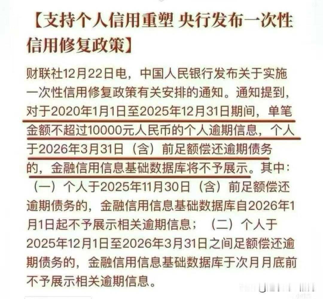 近期最大的利好消息,当属信用修复。 可很多人缺的是单笔一万元的信用修复机会吗?显然不是,他们主要缺的是资金。 当下最为迫切的,应是全民化债,即如何助力大多数人化解债务危机。 让欠债人轻装上阵,给一个喘息的机会。